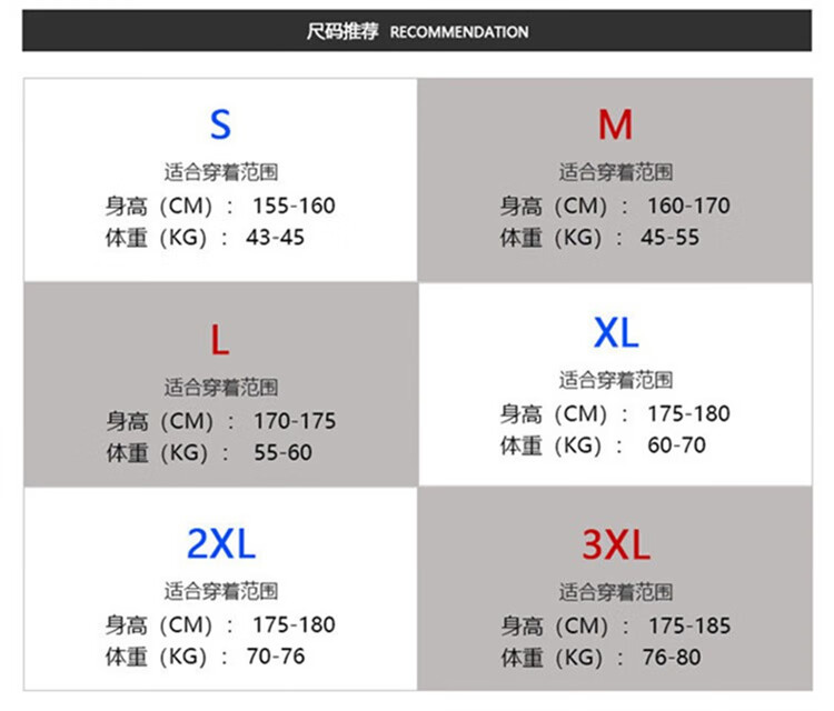 China (cm) 165 / 88-90 170 / 96-98 175 / 108-110 180 / 118-122 185 / 126-130