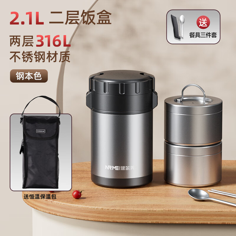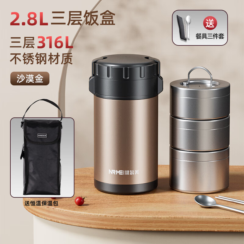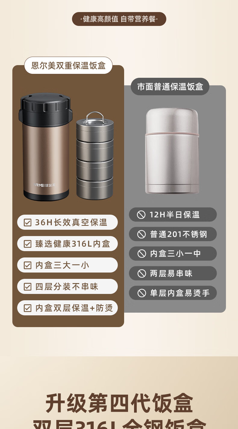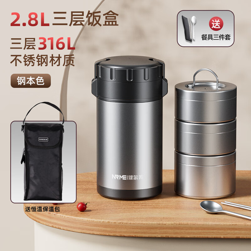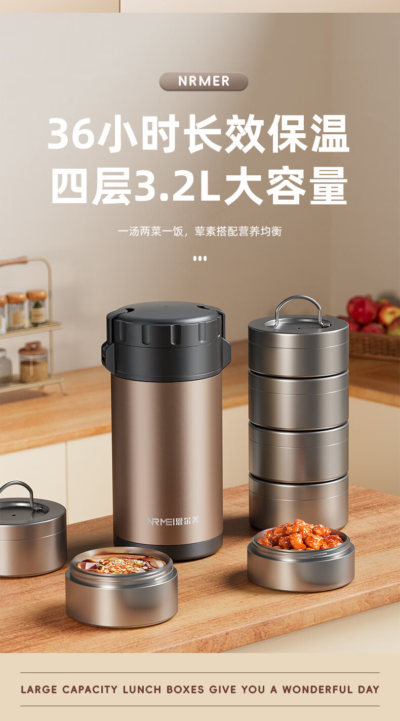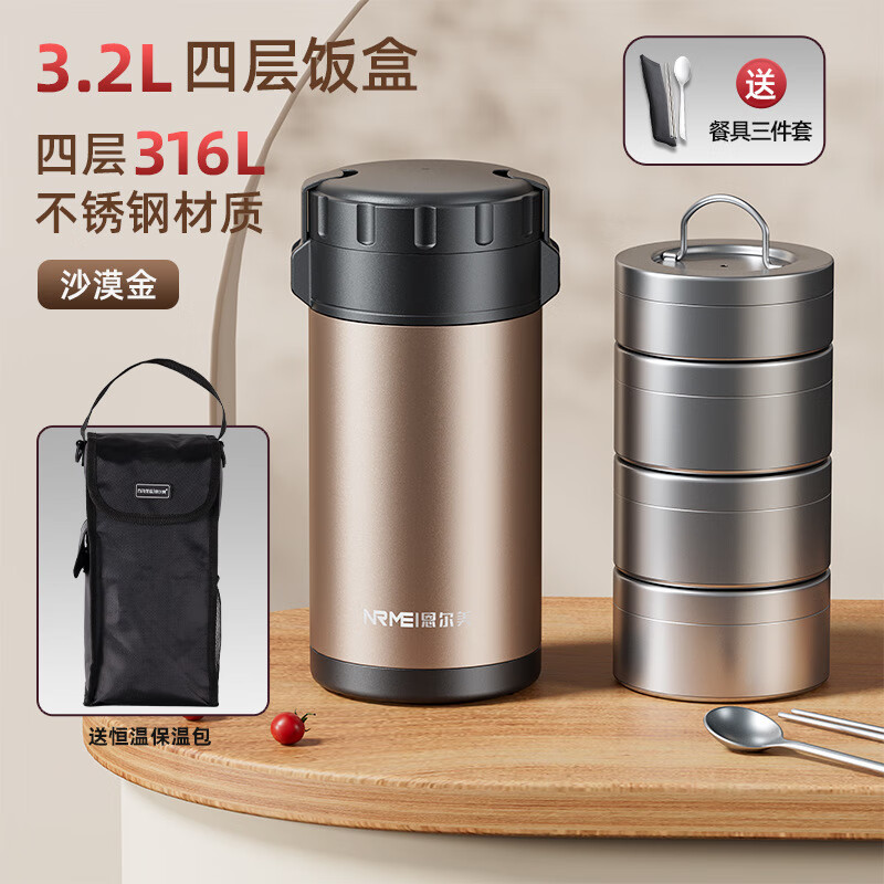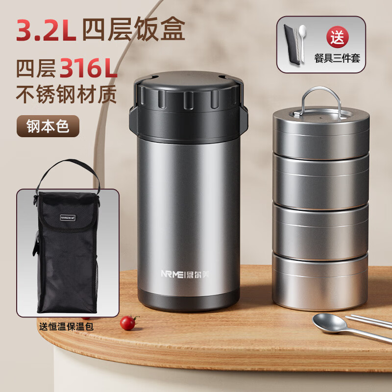 NRMEi 24H long-lasting thermal insulation lunch box bucket 316 stainless steel large capacity multi-layer portable pot for students and office workers 3200ml 1 bucket 4 boxes + 316L material + free tableware, dark red