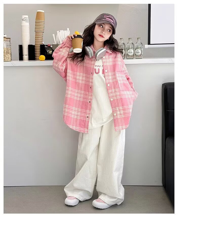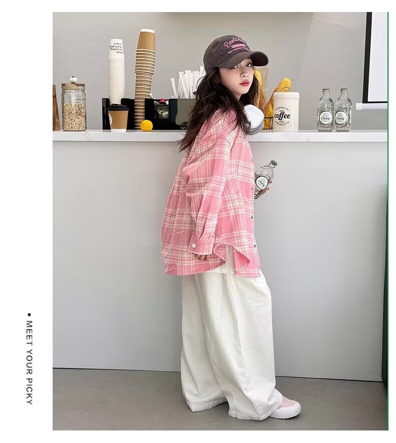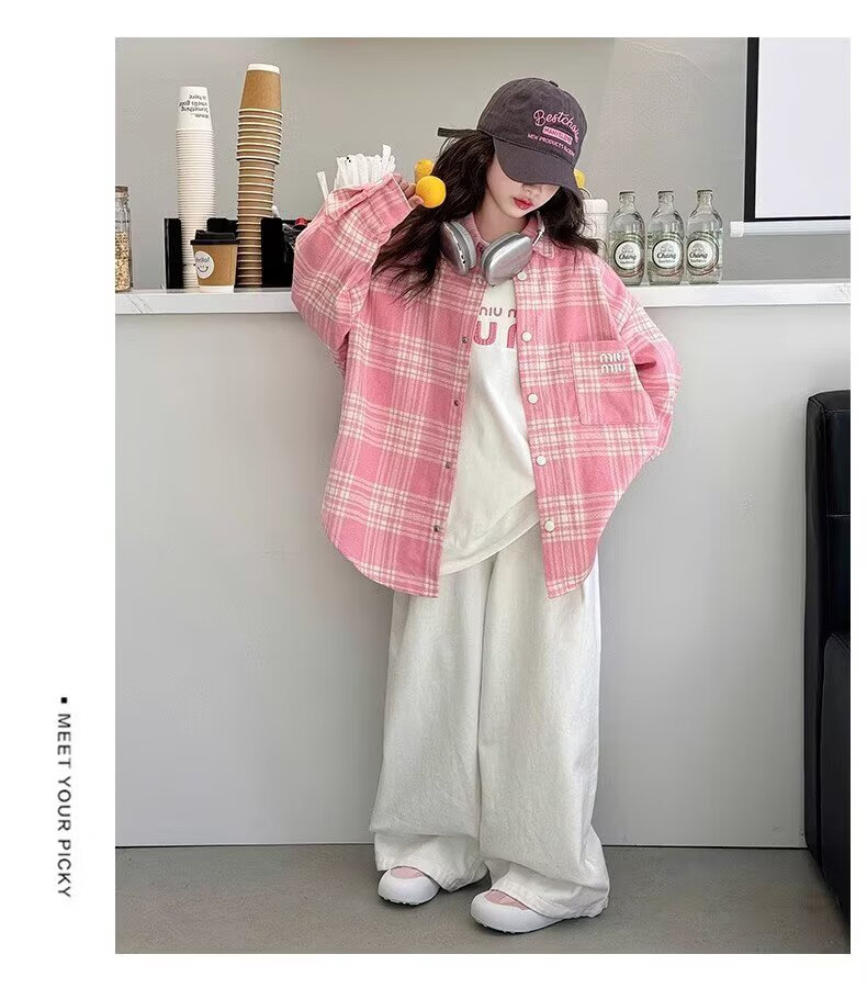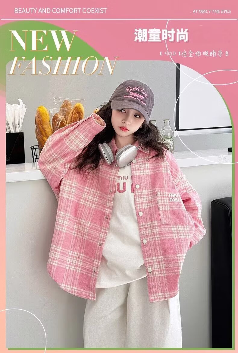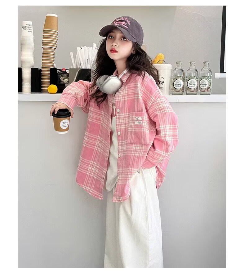 Girls long-sleeved shirt 2025 spring and autumn new style children's Korean style fashionable plaid top for middle and large children spring fashion JHP-6633 pink 140