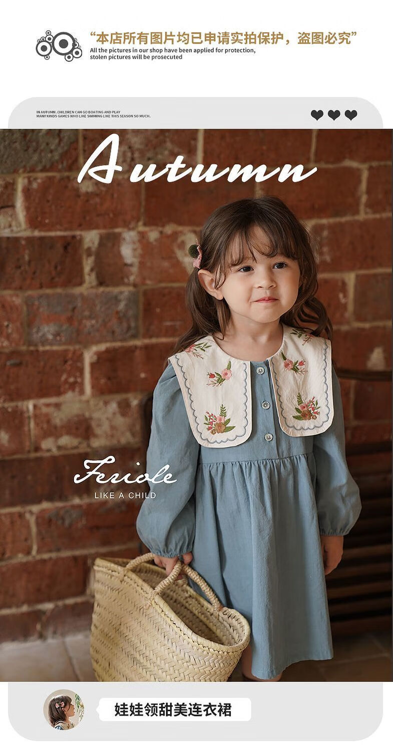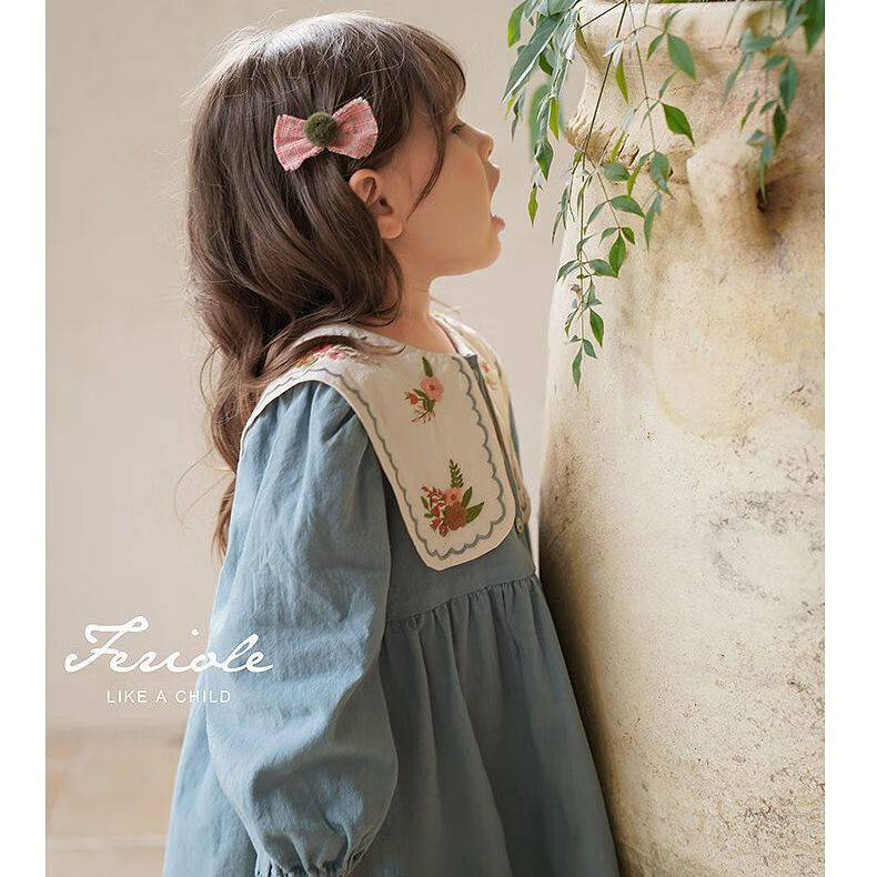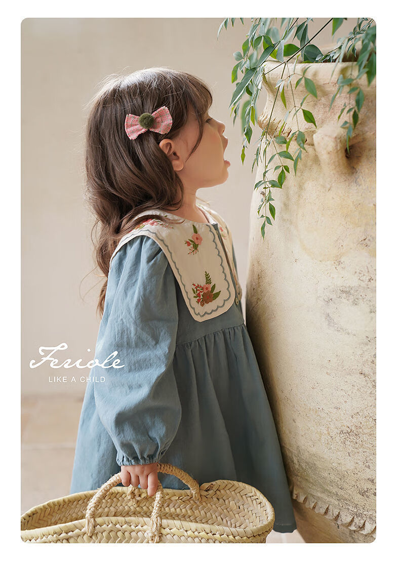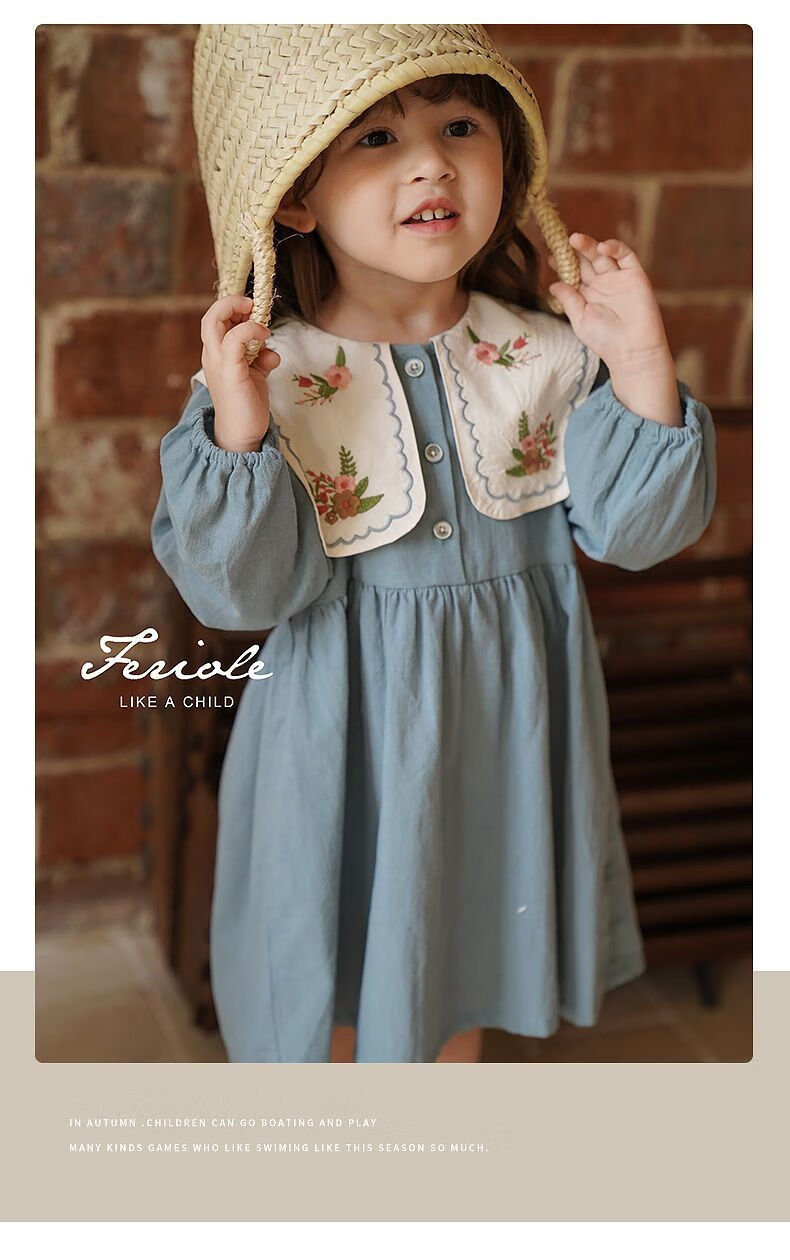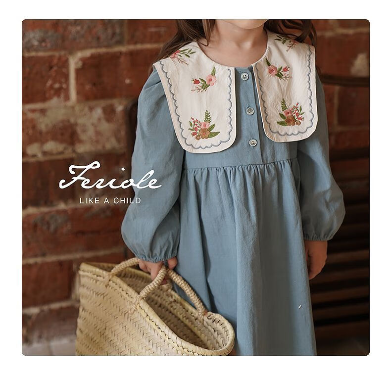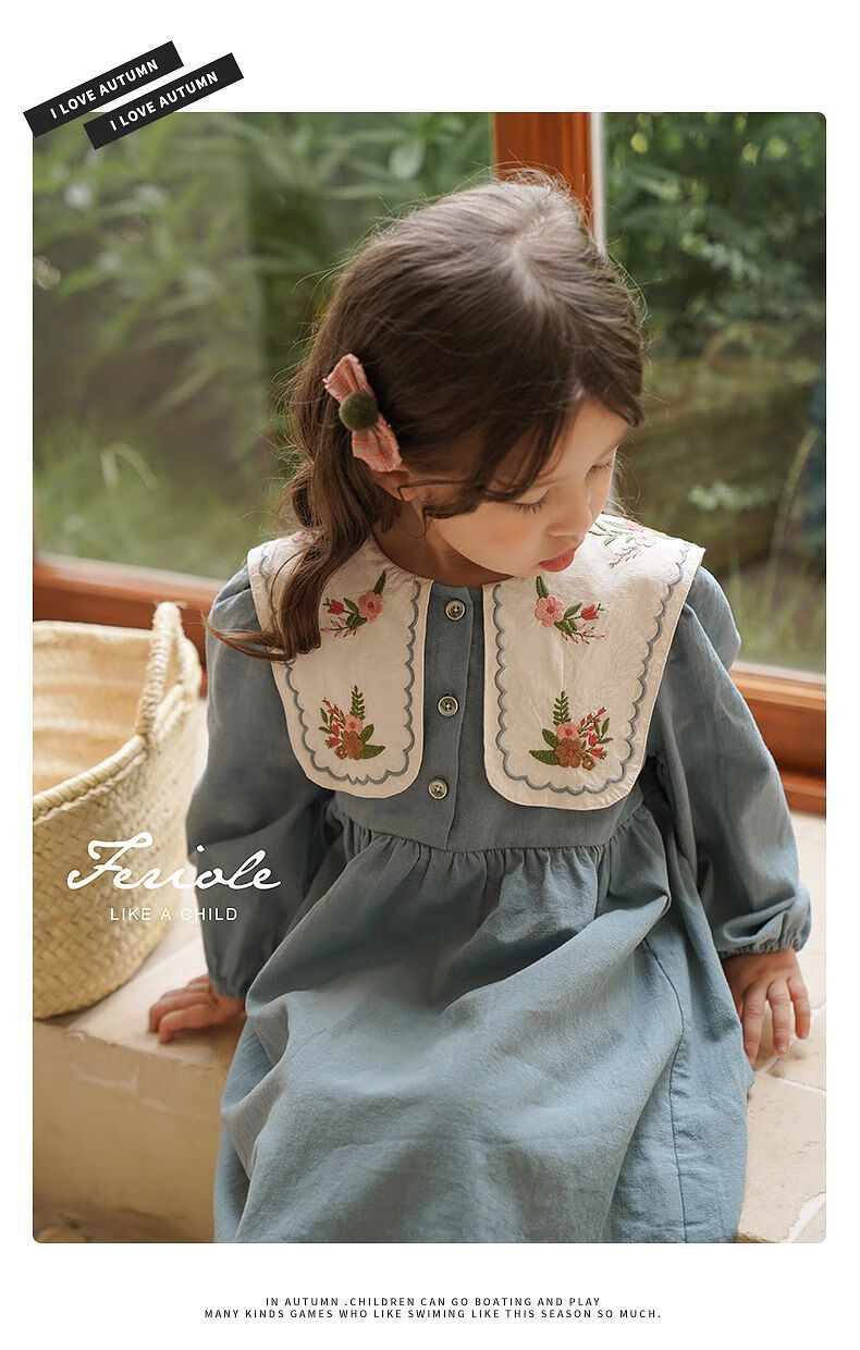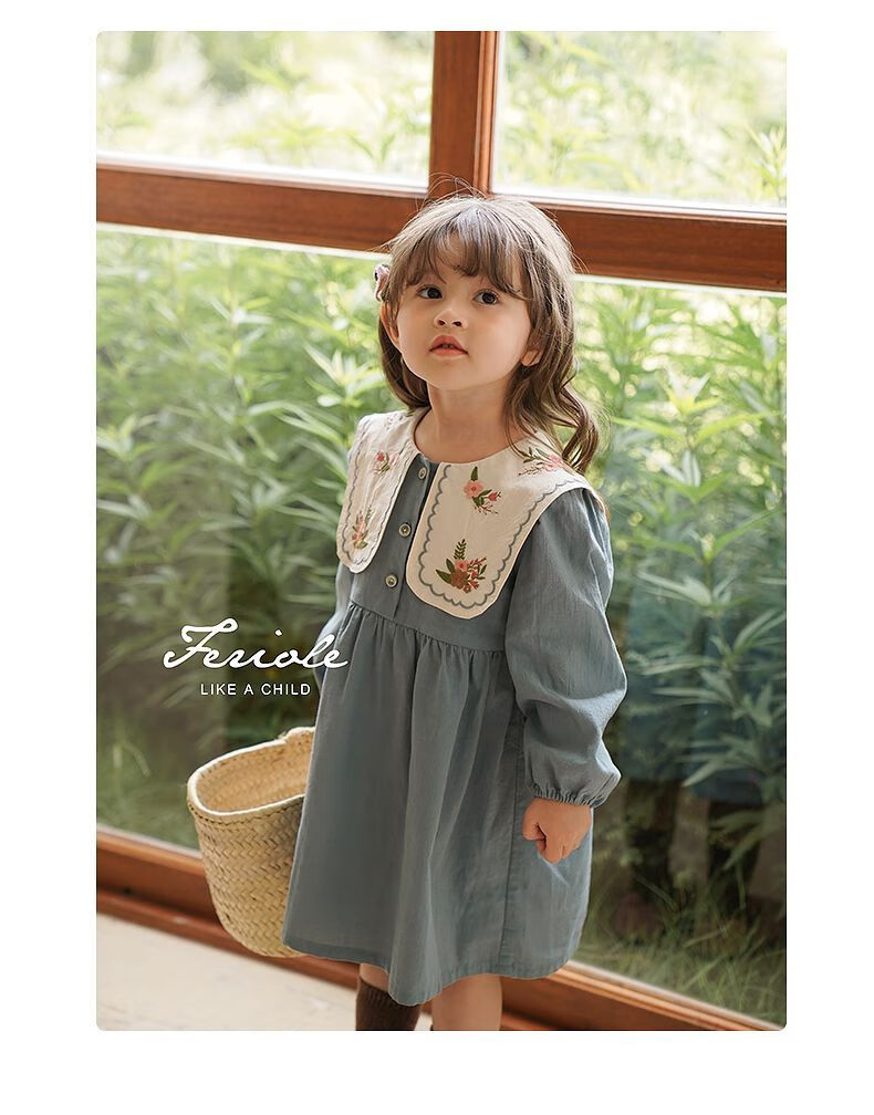 Girls embroidered large lapel embroidered sweet forest princess dress Korean version spring and autumn new fashion fashionable dress blue 90