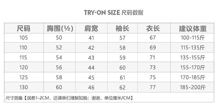 China (cm) 165 / 88-90 170 / 96-98 175 / 108-110 180 / 118-122 185 / 126-130
