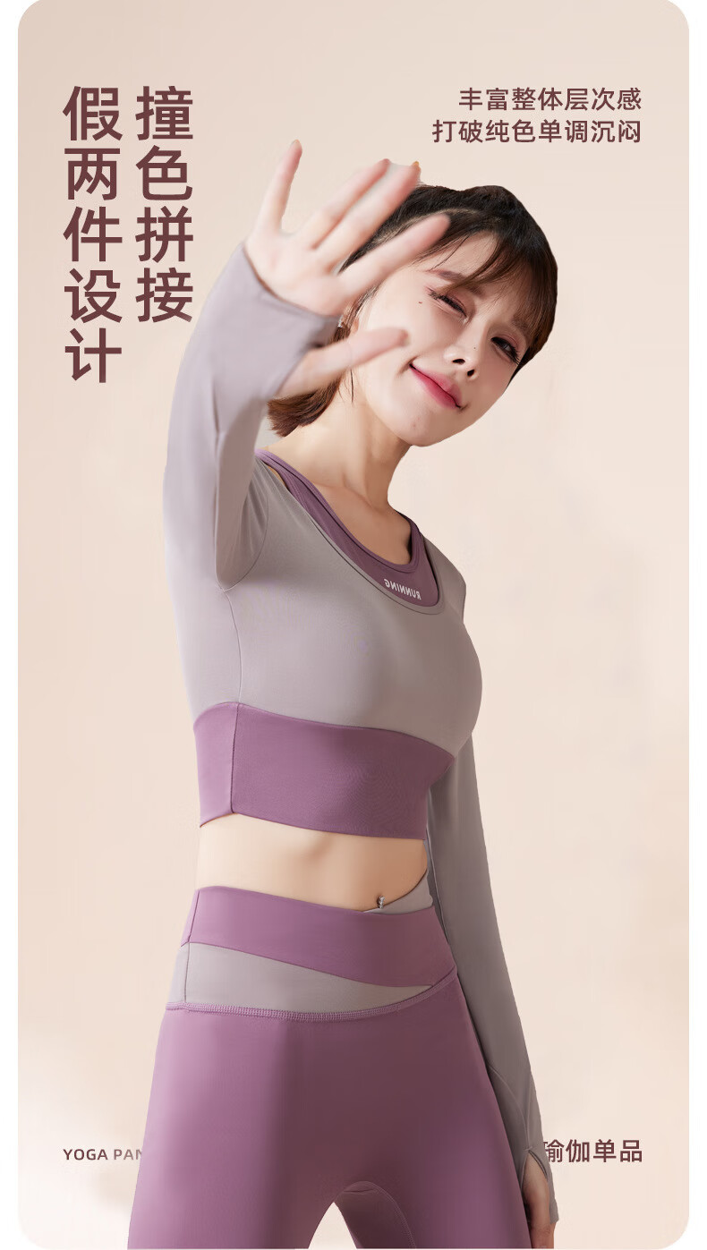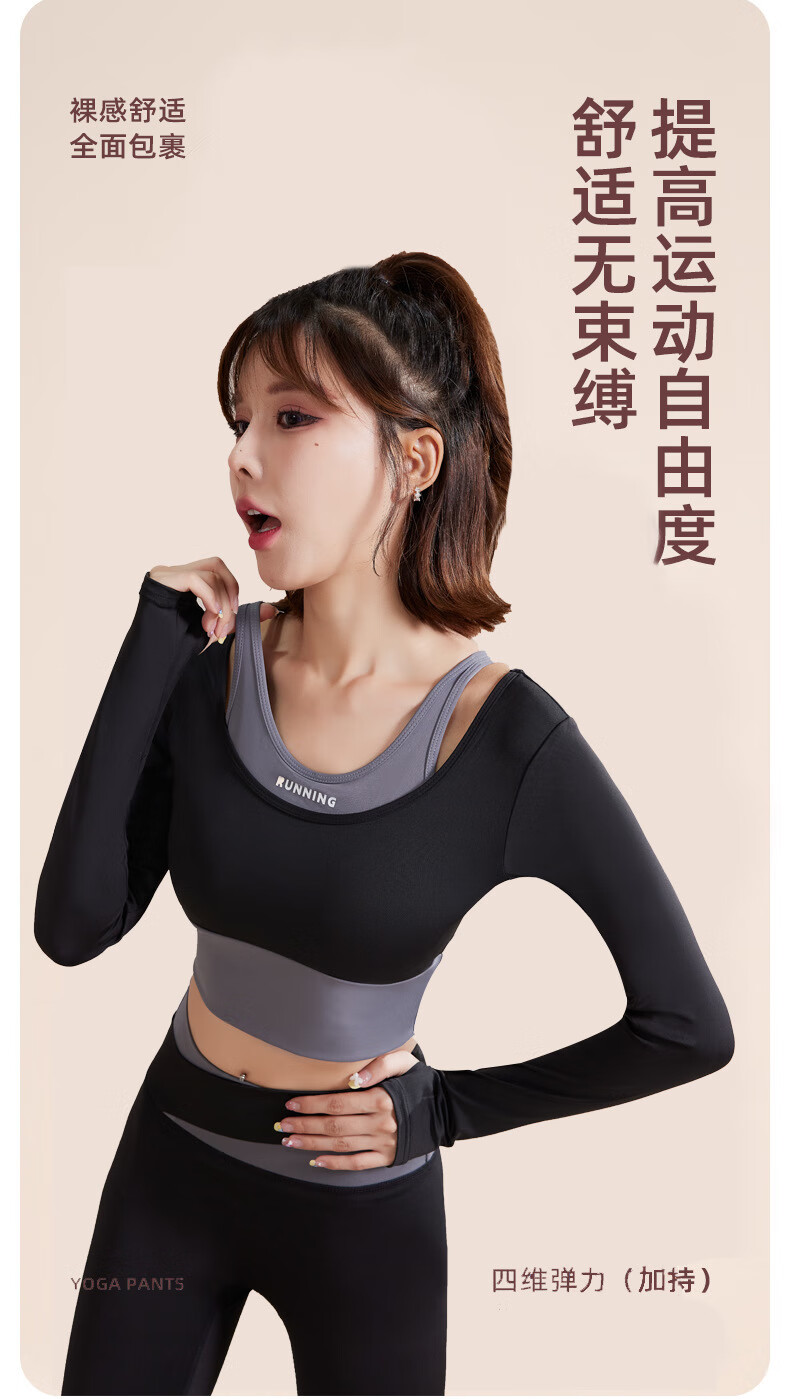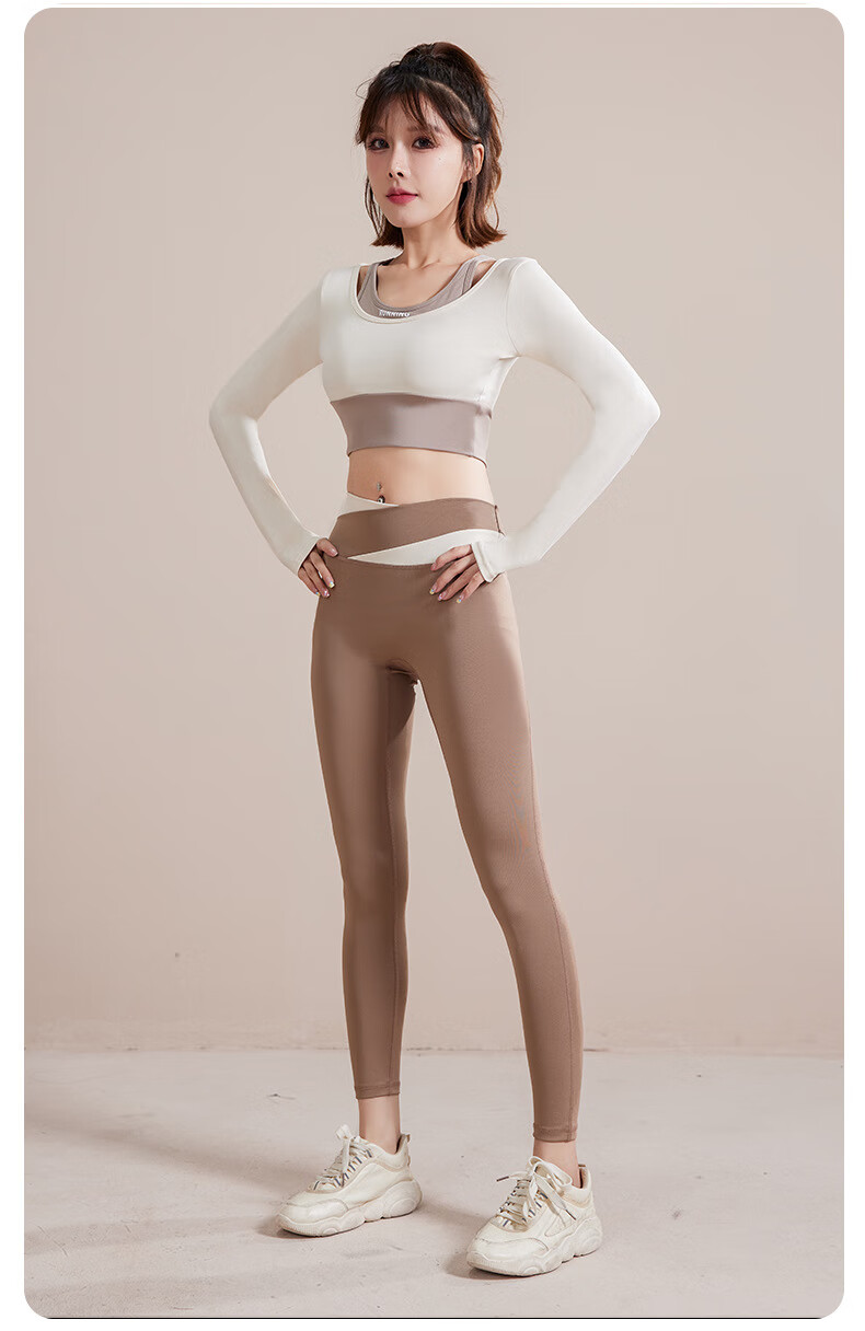 Long-sleeved fake two-piece yoga suit without bra, contrasting color splicing sports suit, Pilates training fitness suit, ivory white, long sleeves + cocoa color, waistband M, recommended 105-120 Jin Jin equals 0.5 kg