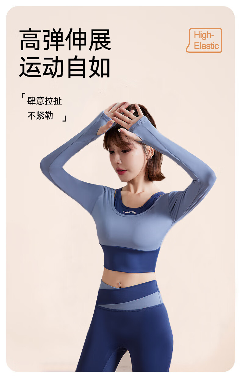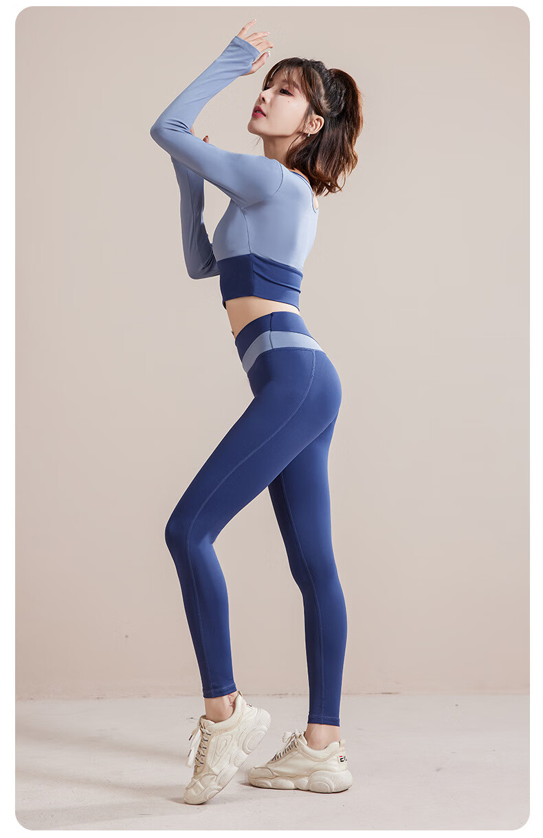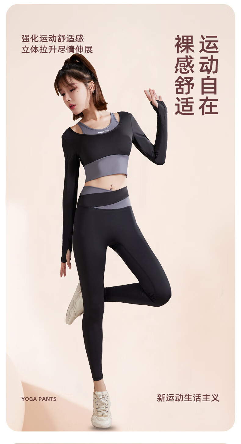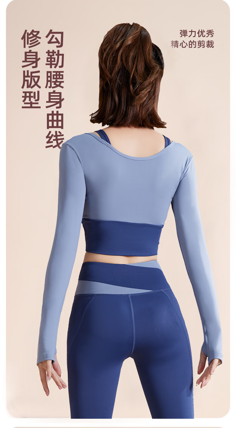 Long-sleeved fake two-piece yoga suit without bra, contrasting color splicing sports suit, Pilates training fitness suit, ivory white, long sleeves + cocoa color, waistband M, recommended 105-120 Jin Jin equals 0.5 kg