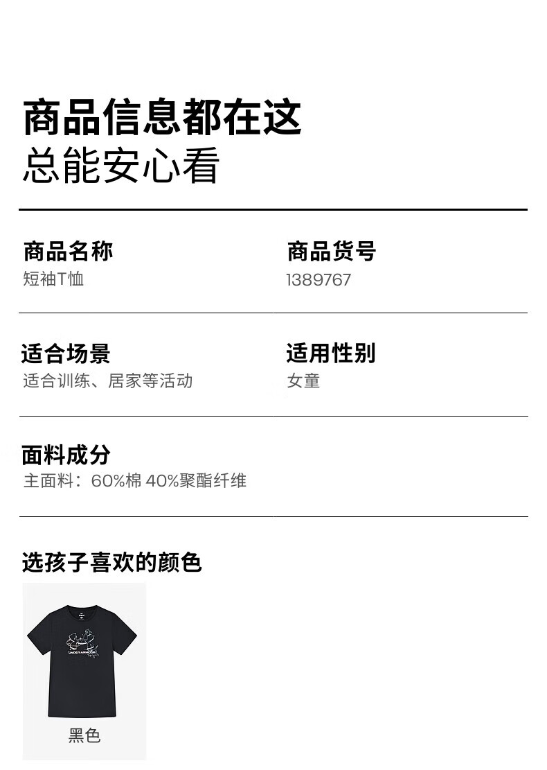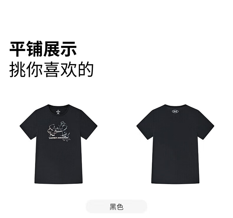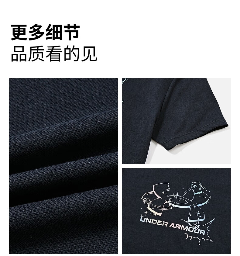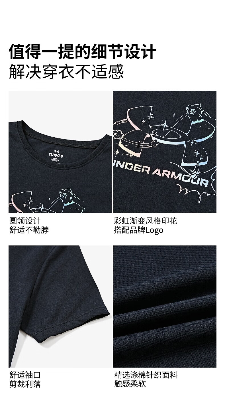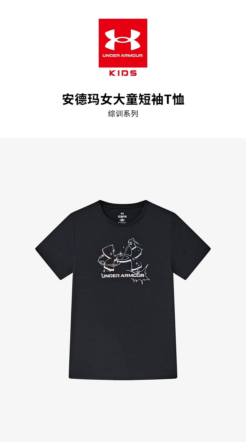 Under Armor Children's Short Sleeve T-shirt Printed Casual T-shirt Women's Summer Loose Breathable Sports Round Neck Top Black 160 The size is small, please take one size larger as normal