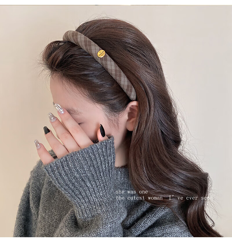 Korean style small gold label coffee plaid hair hoop for women 2025 new autumn and winter sweet temperament headband for going out and versatile hairpin small gold label coffee plaid hair hoop 1 pack