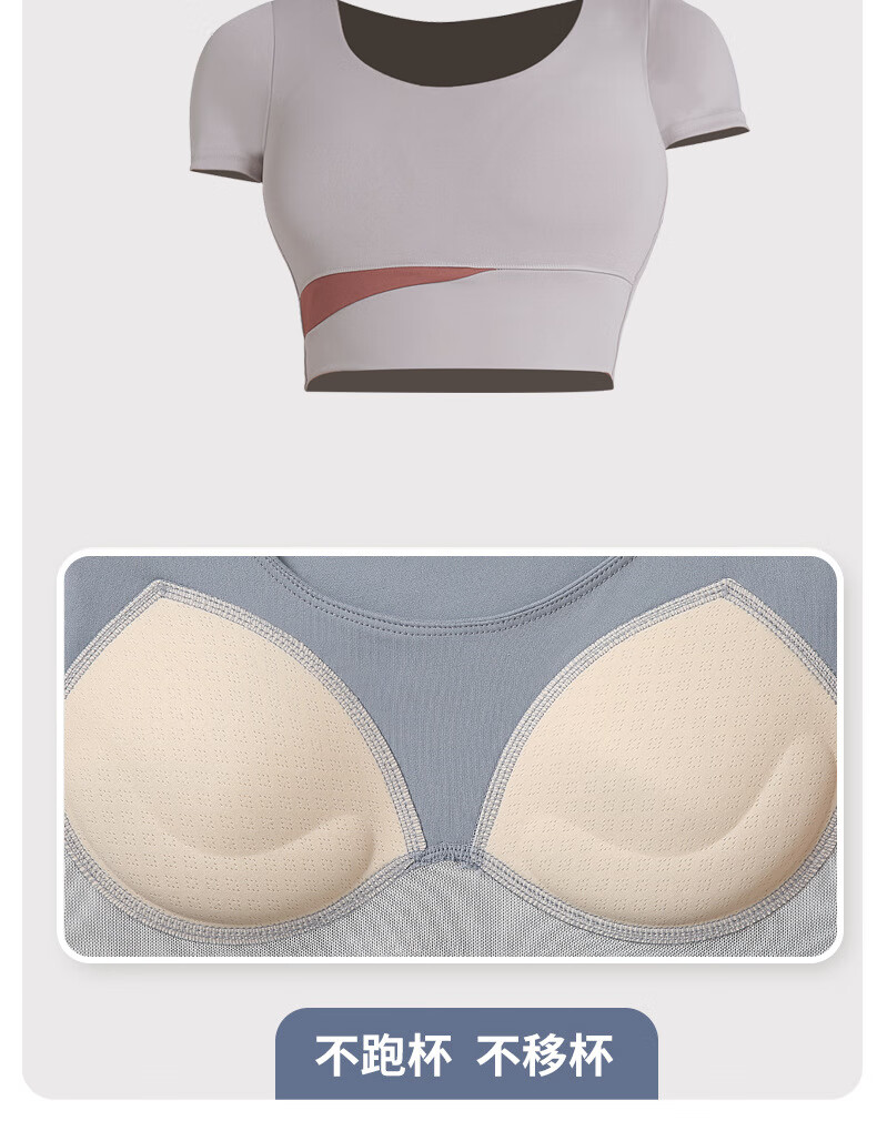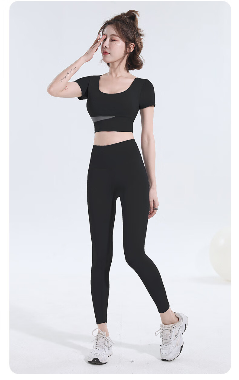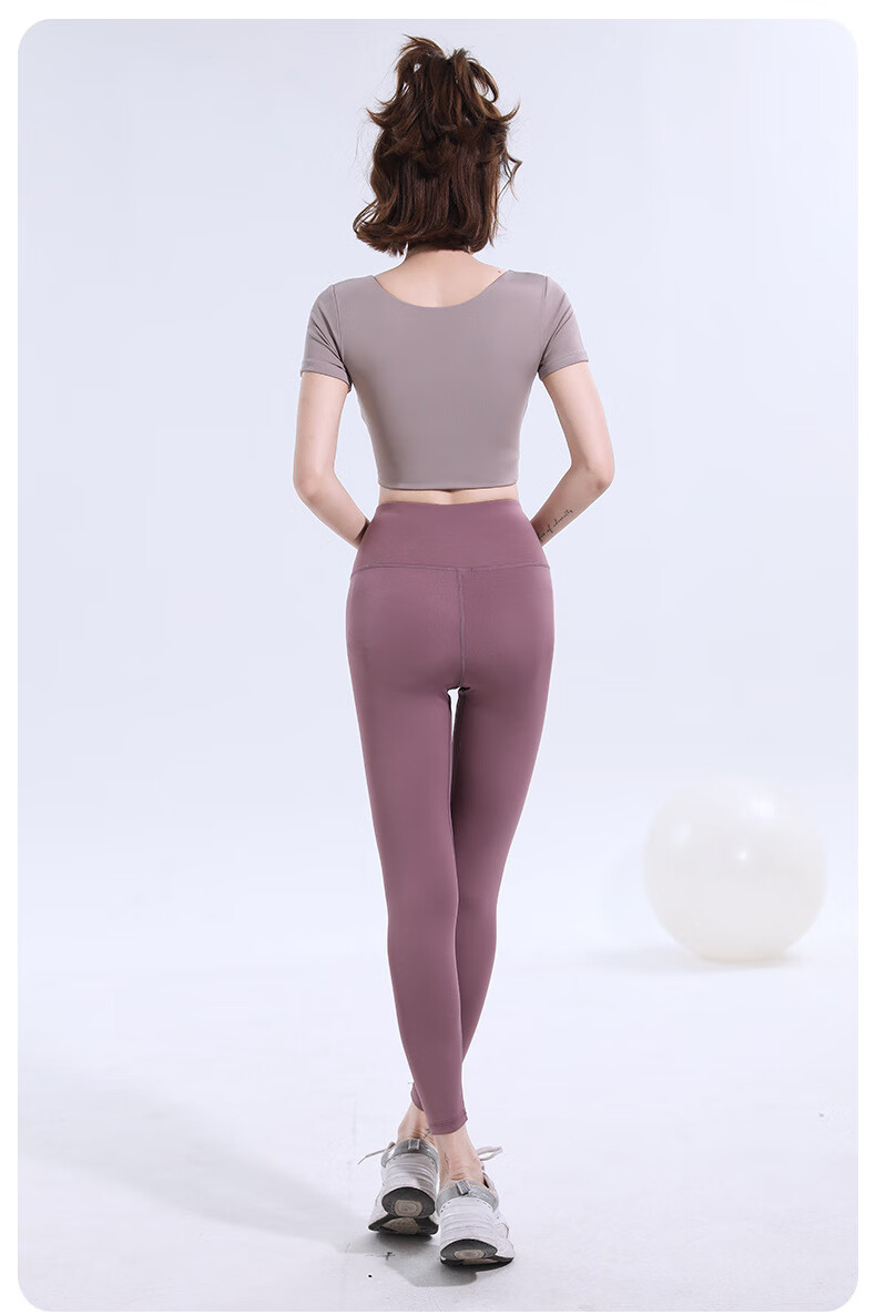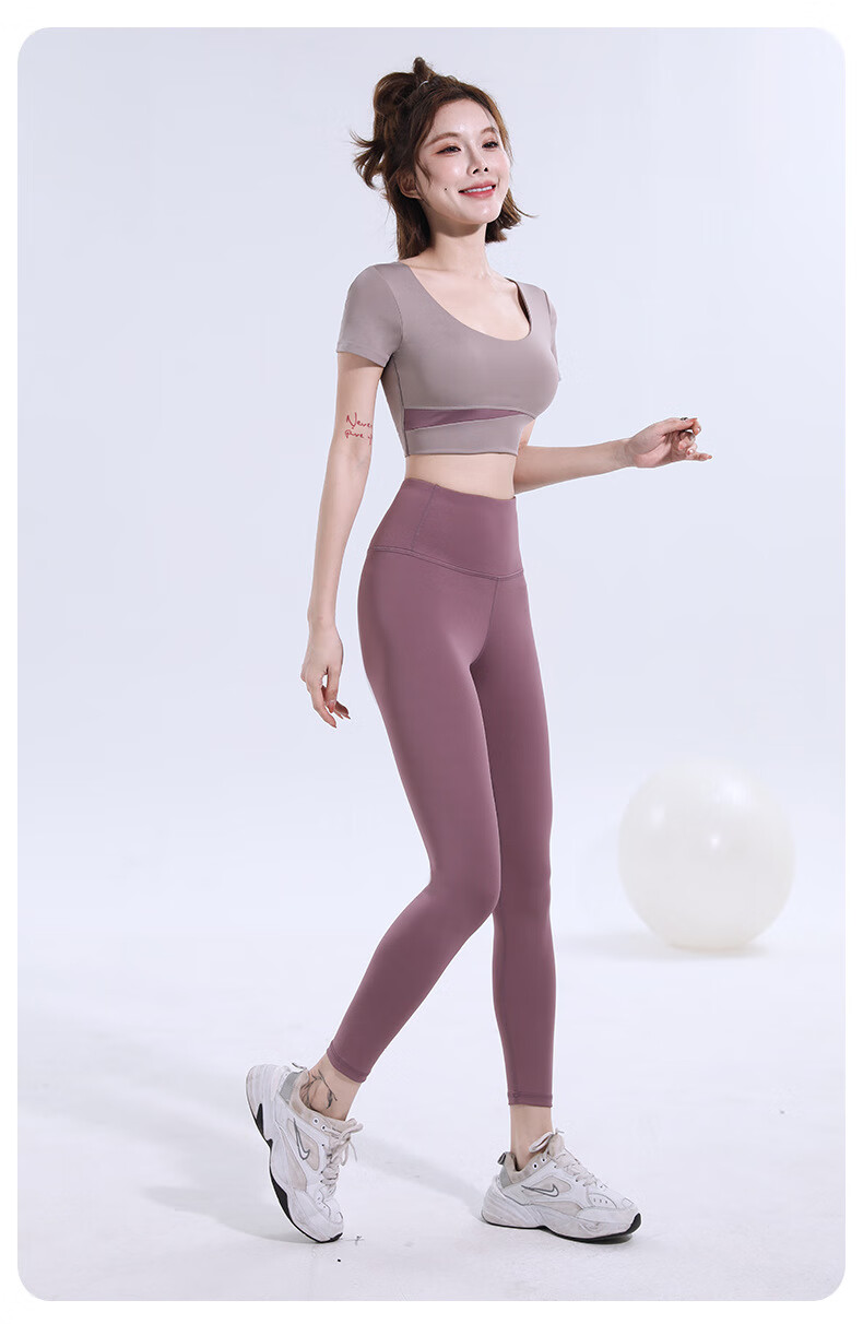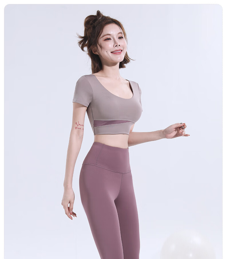 Yoga wear women's short-sleeved 2025 new fitness sports tops with chest pads summer Pilates nude training set cream purple short-sleeved + star black trousers XL recommended 115-130 Jin Jin equals 0.5 kg