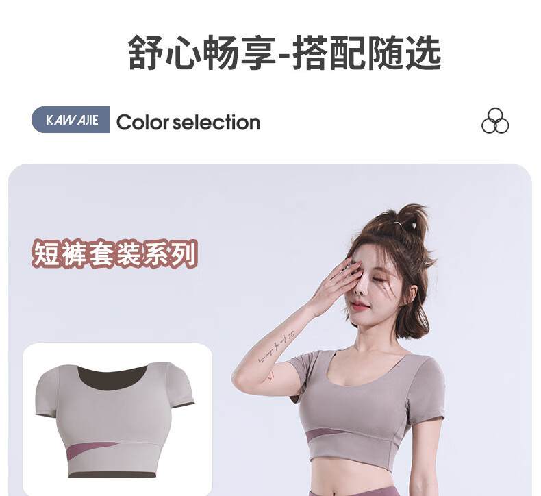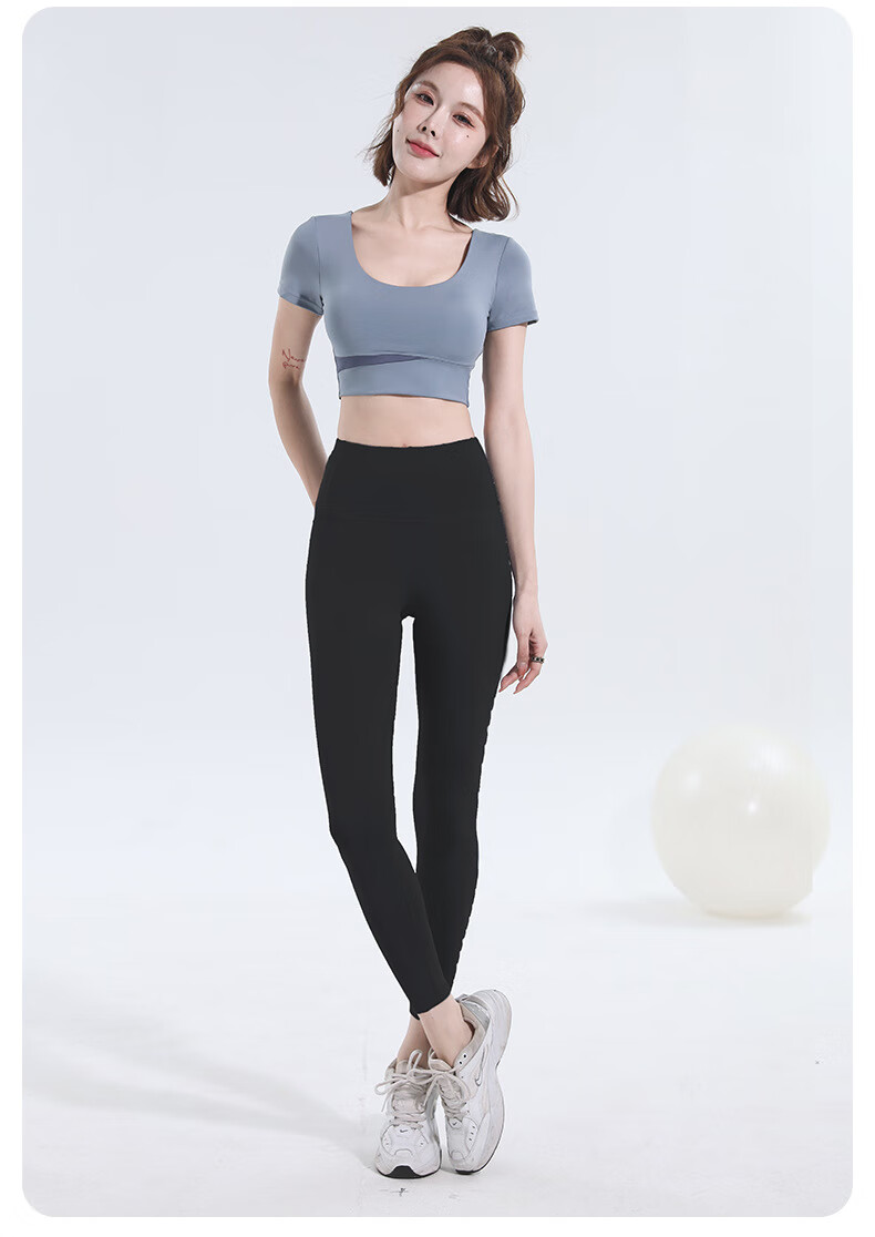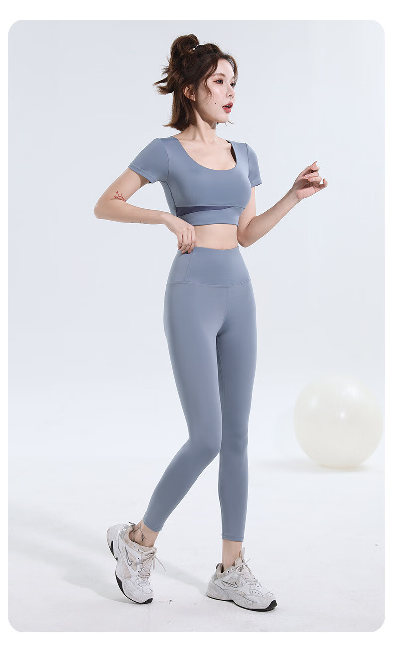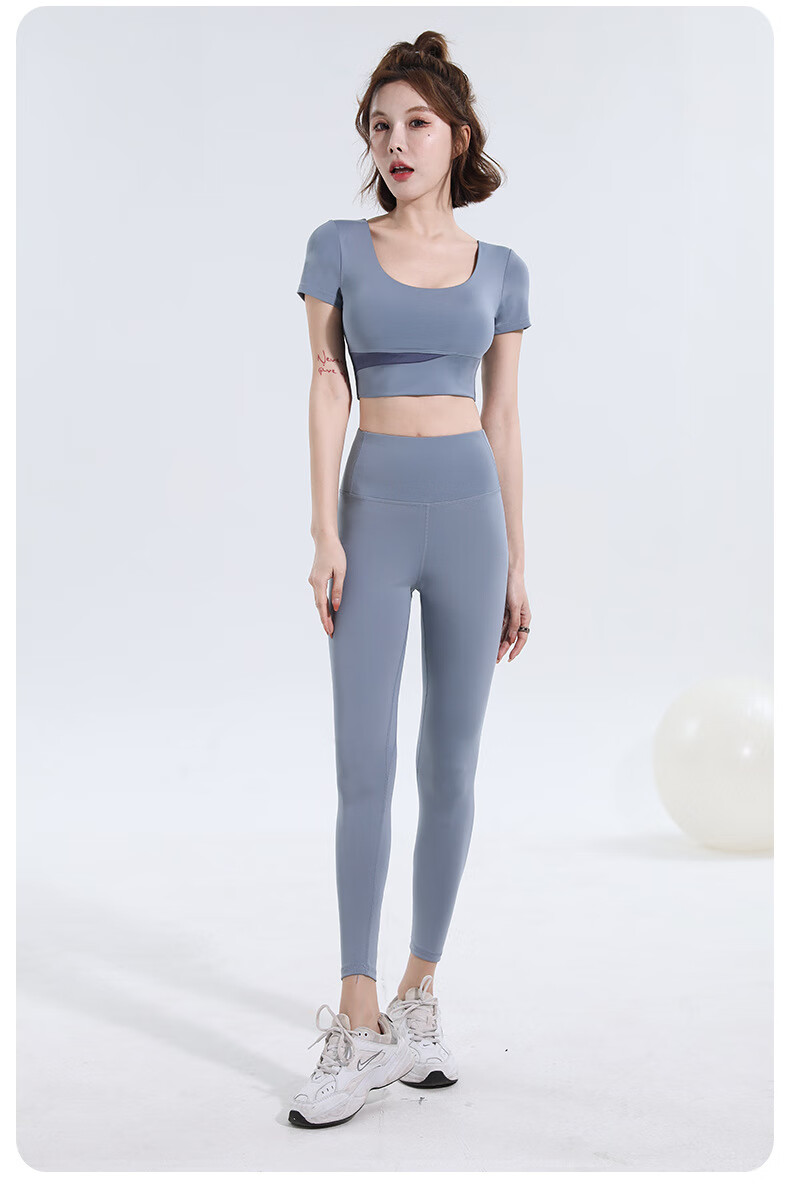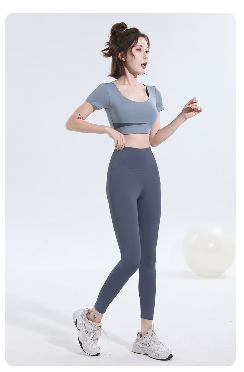 Yoga wear women's short-sleeved 2025 new fitness sports tops with chest pads summer Pilates nude training set cream purple short-sleeved + star black trousers XL recommended 115-130 Jin Jin equals 0.5 kg