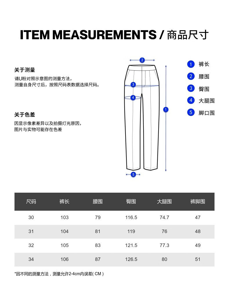 Outseam (cm) 99 cm 101.5 cm 104 cm 106.5 cm 109 cm