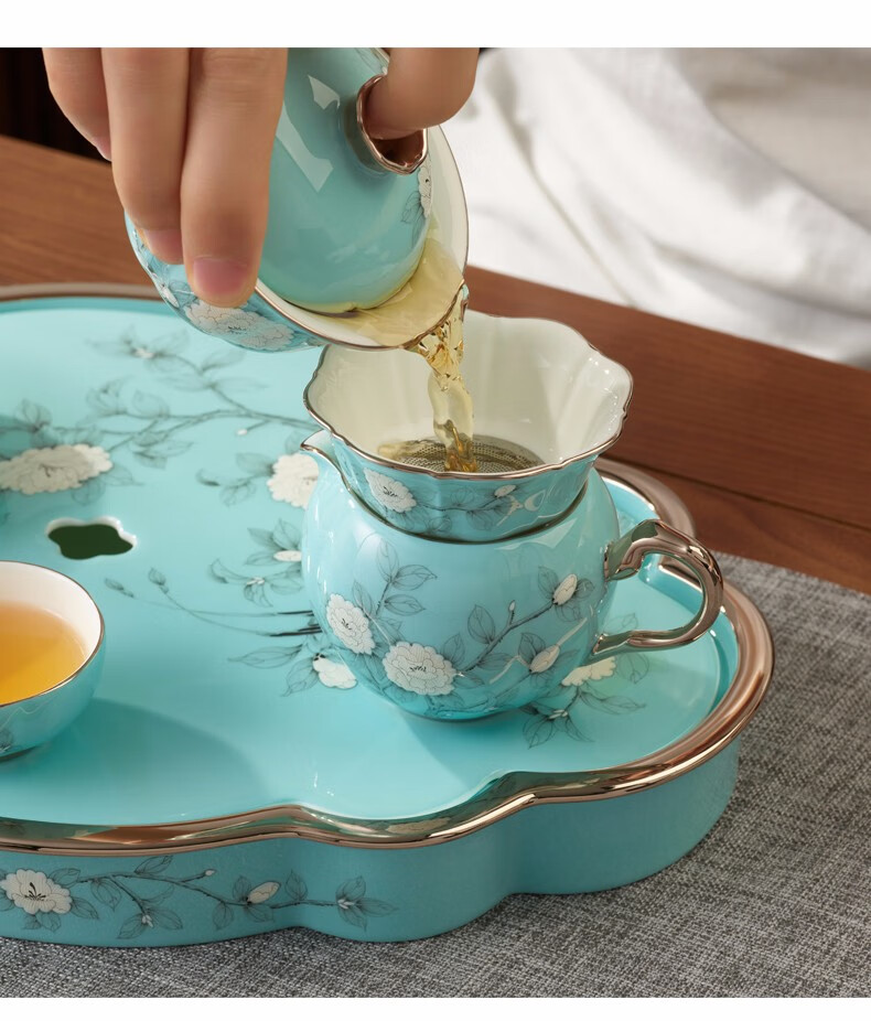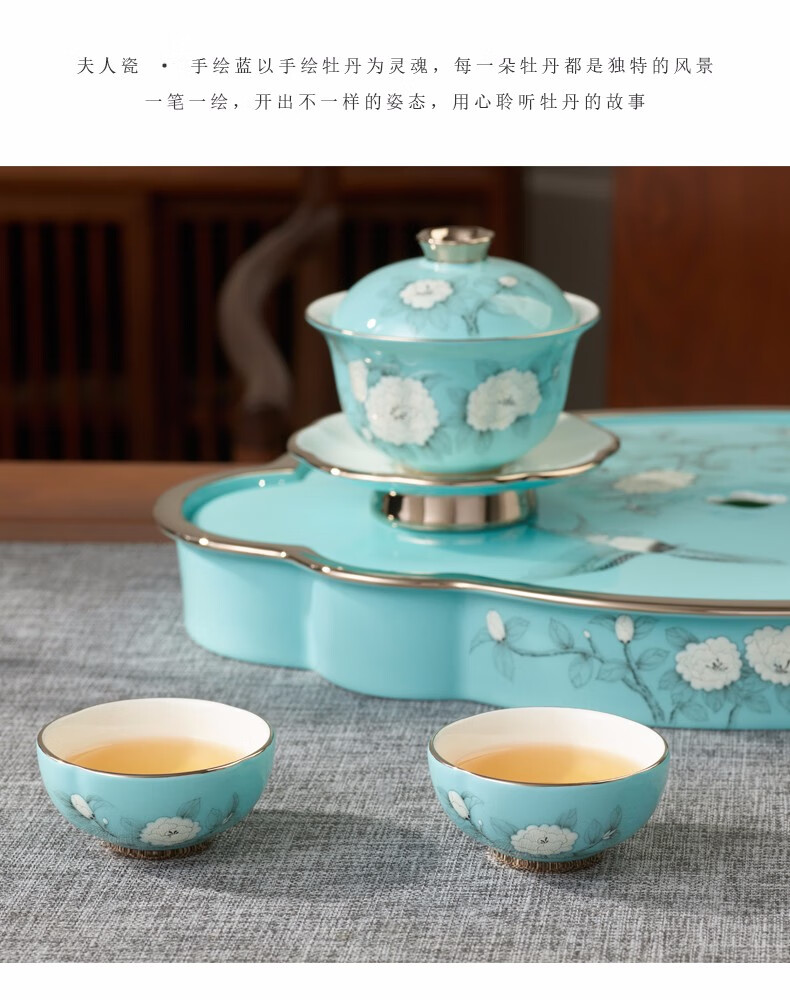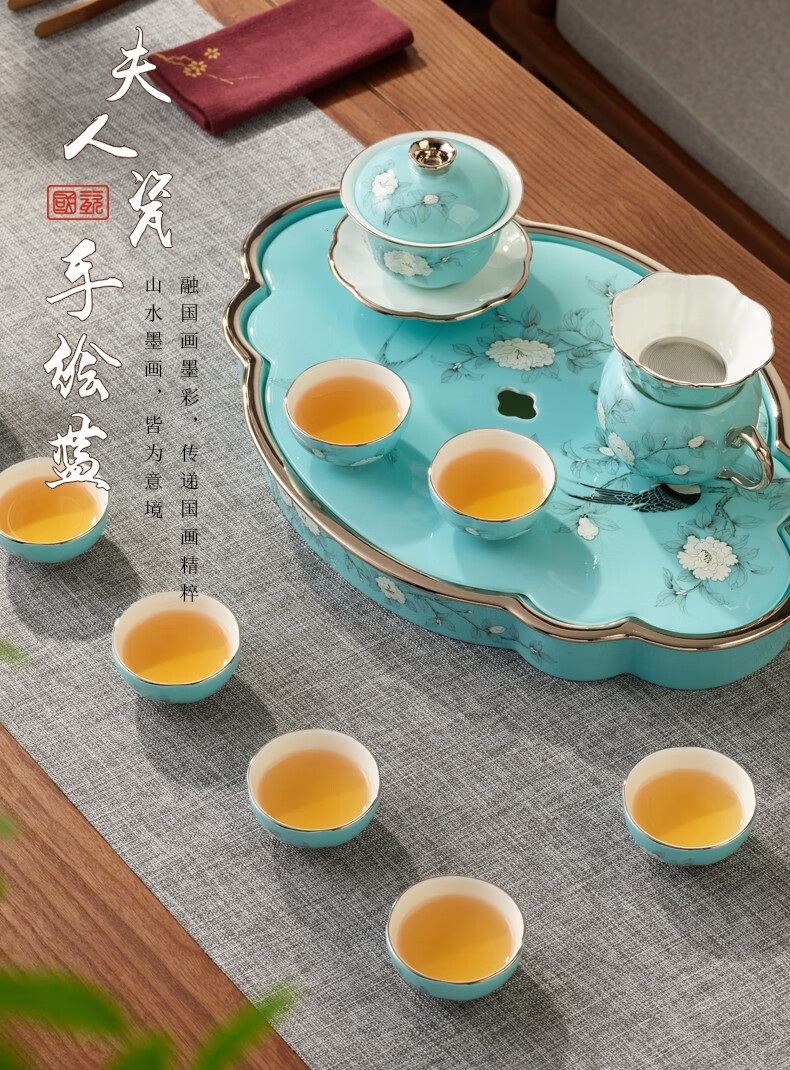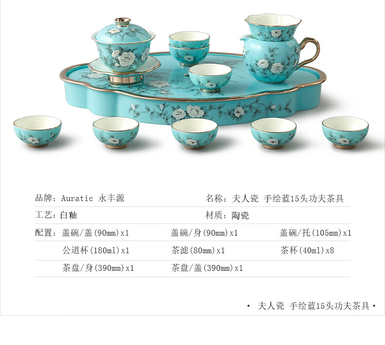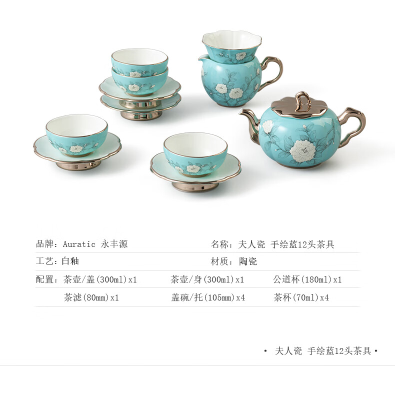 Lady Yongfengyuan (auratic) porcelain hand-painted blue 12-head/15-head ceramic teapot, lid, bowl, tea set, hand-painted high-end gift box packaging, 12 heads, 4 persons