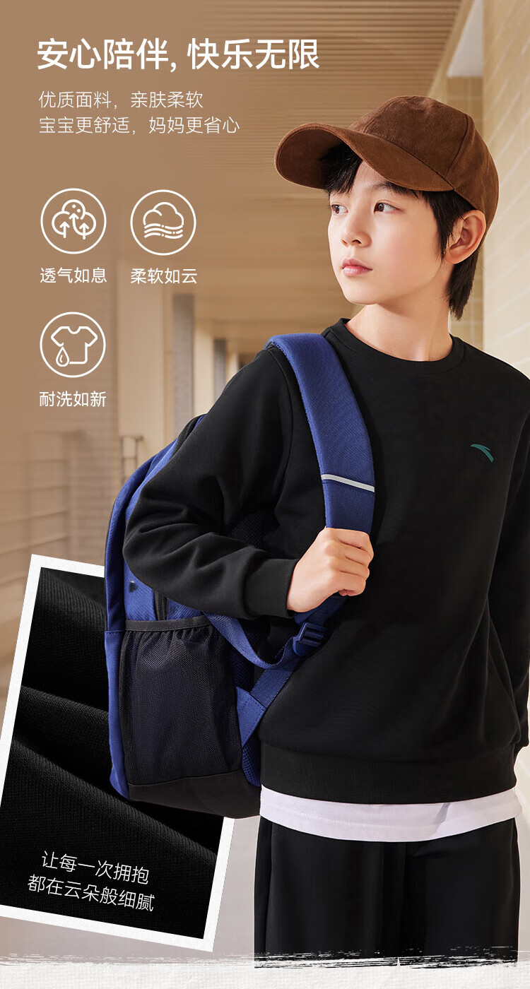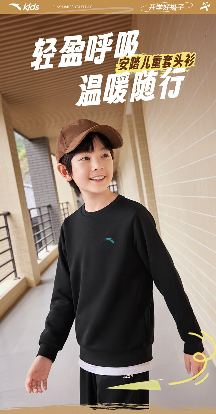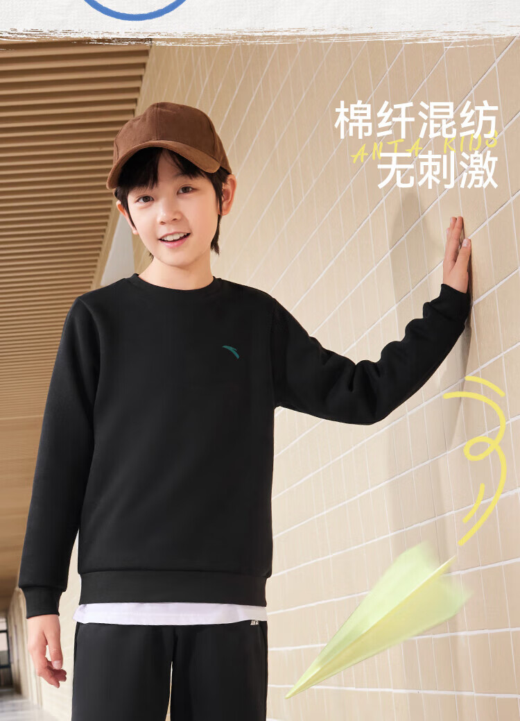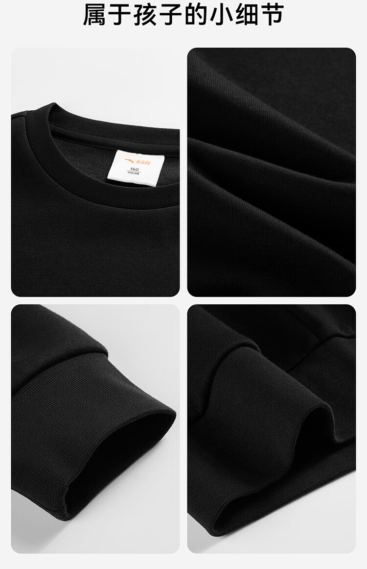 Anta children's fleece sweatshirt for men and women, middle and large children 25 autumn and winter new style youth loose cotton skin-friendly long-sleeved top black early autumn hot sale 160 cm