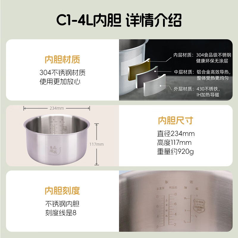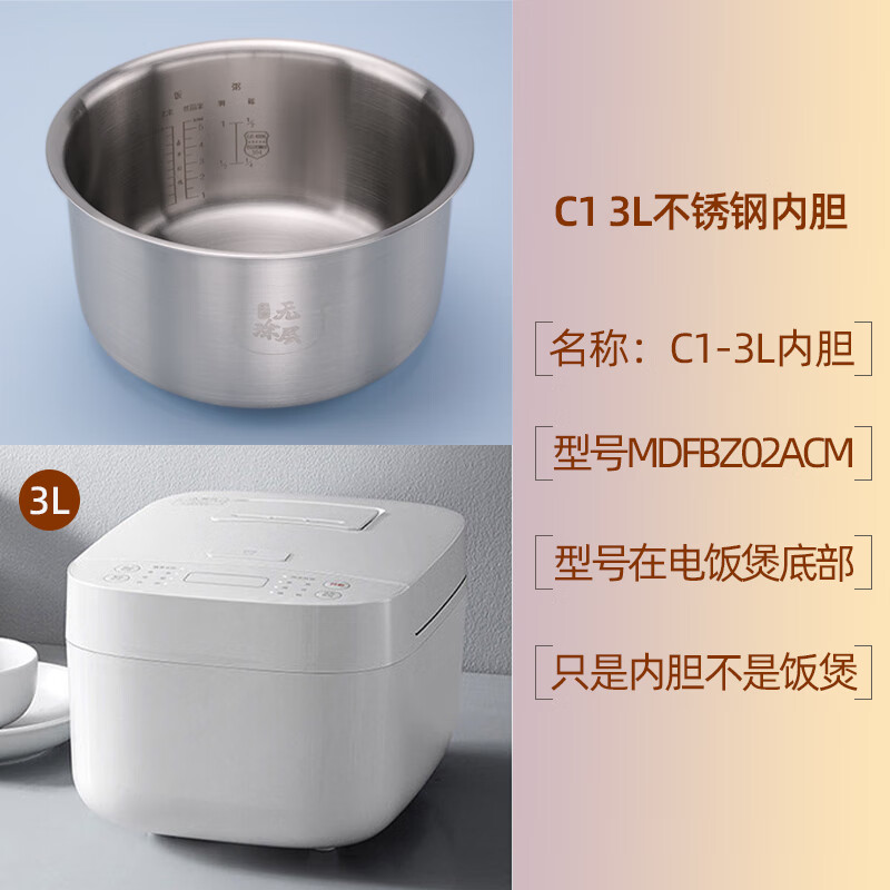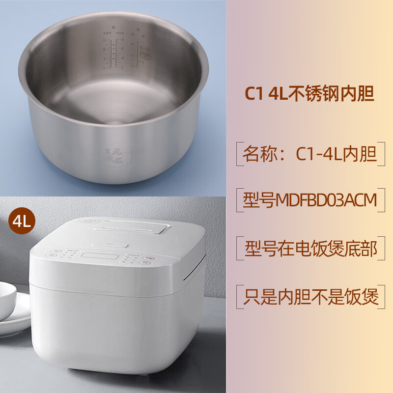 Suitable for Xiaomi rice cooker stainless steel inner pot 4 liter rice cooker C1 3L 5 liter inner pot 0 coating MDFBD02ACM C1-3L stainless steel inner pot (316L material)