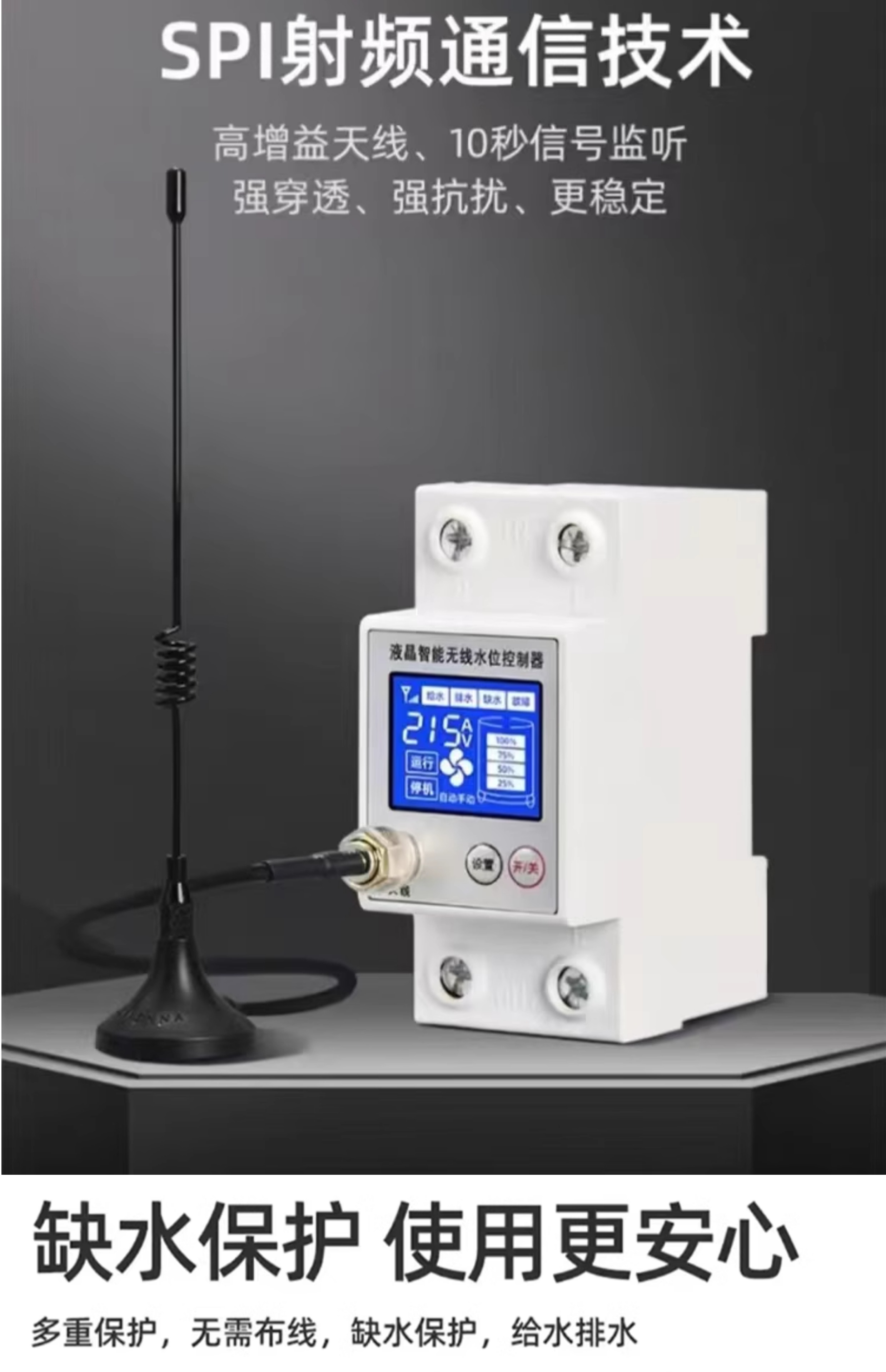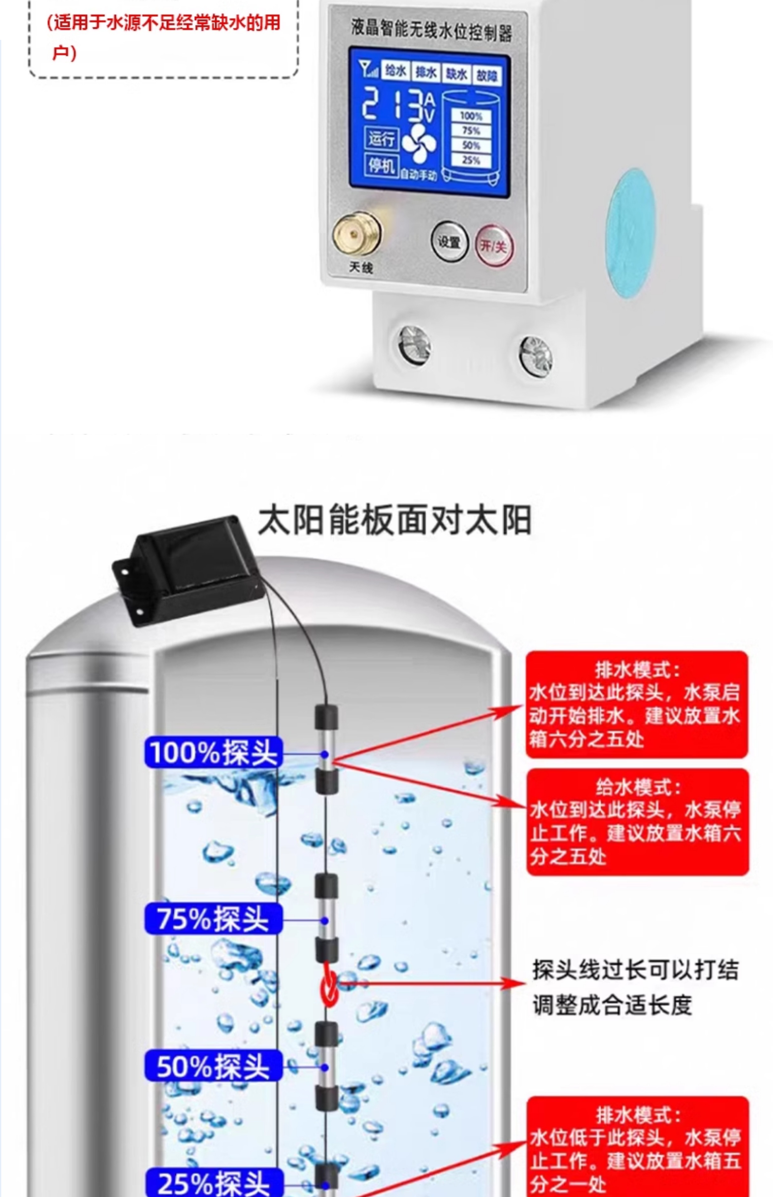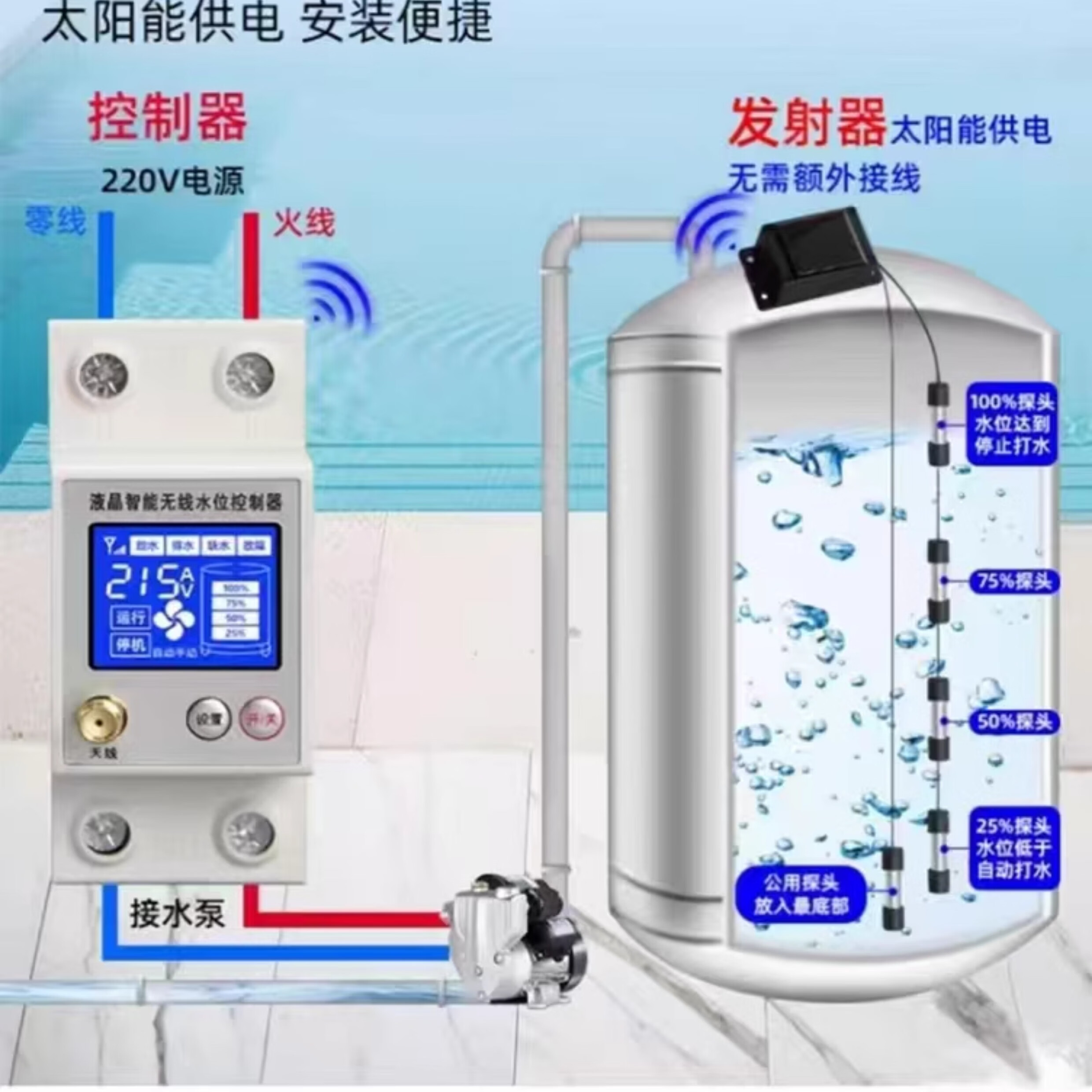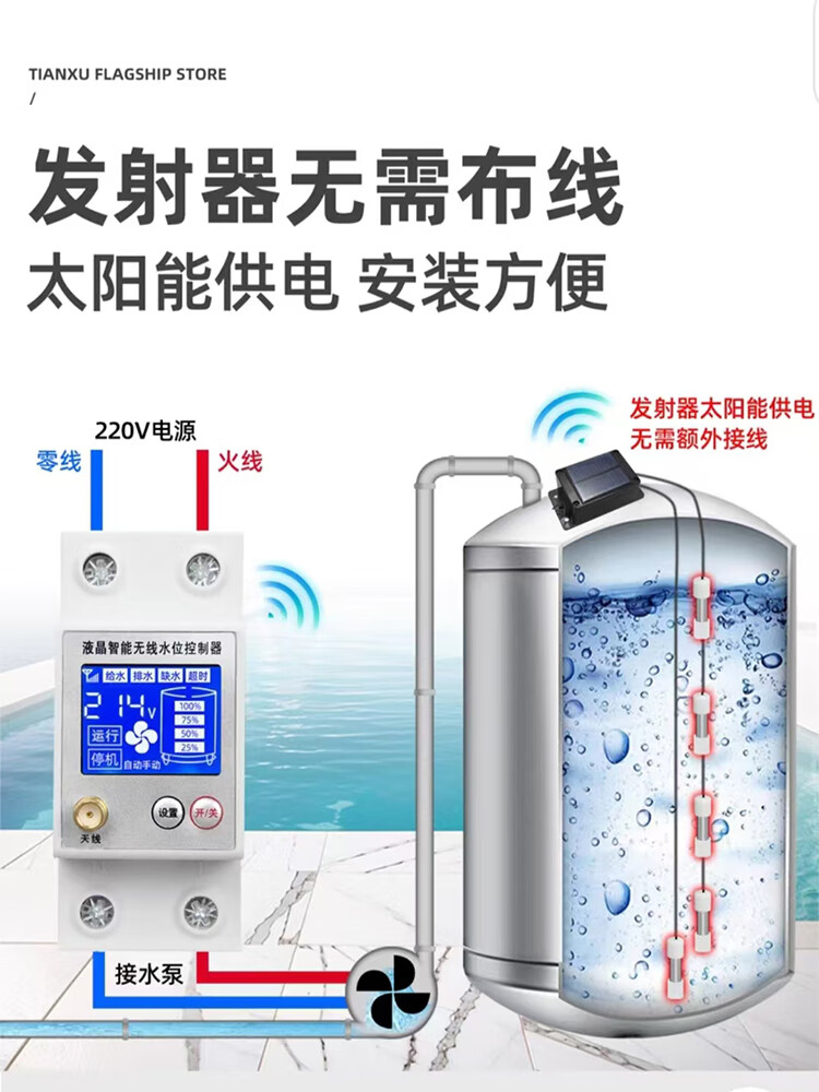 Wireless water level controller, fully automatic water tower, water tank, pool remote control switch, water pump, remote solar charging, LCD model, barrier-free 3000 meters with power adapter