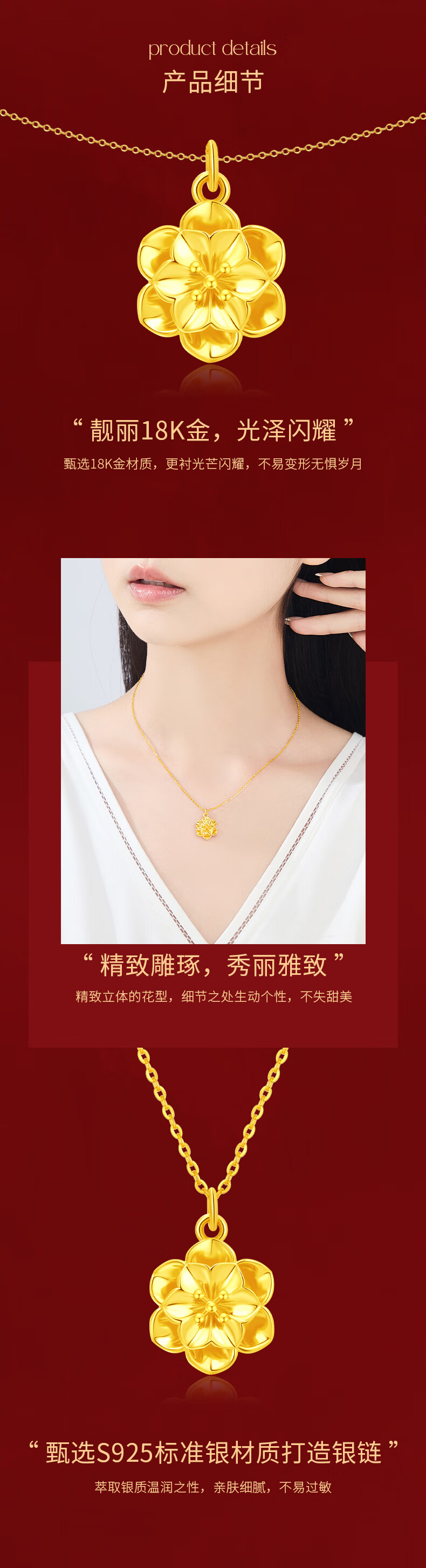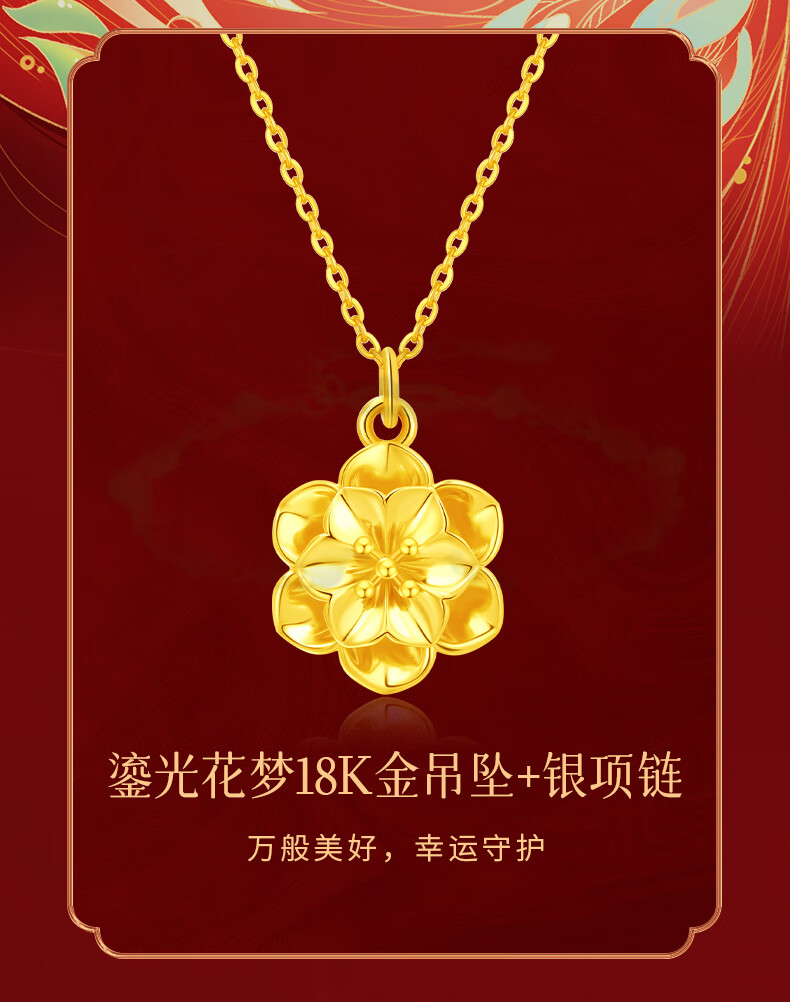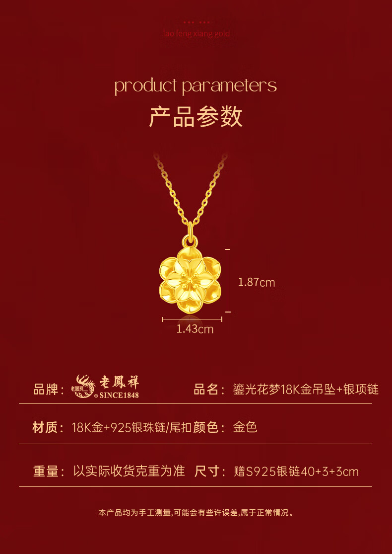 Lao Fengxiang 18K gold necklace for women, romantic flower pendant jewelry, fashionable and versatile birthday and anniversary gift for girlfriend and wife, 18K gold gilded flower dream about 0.2g* brand gift box