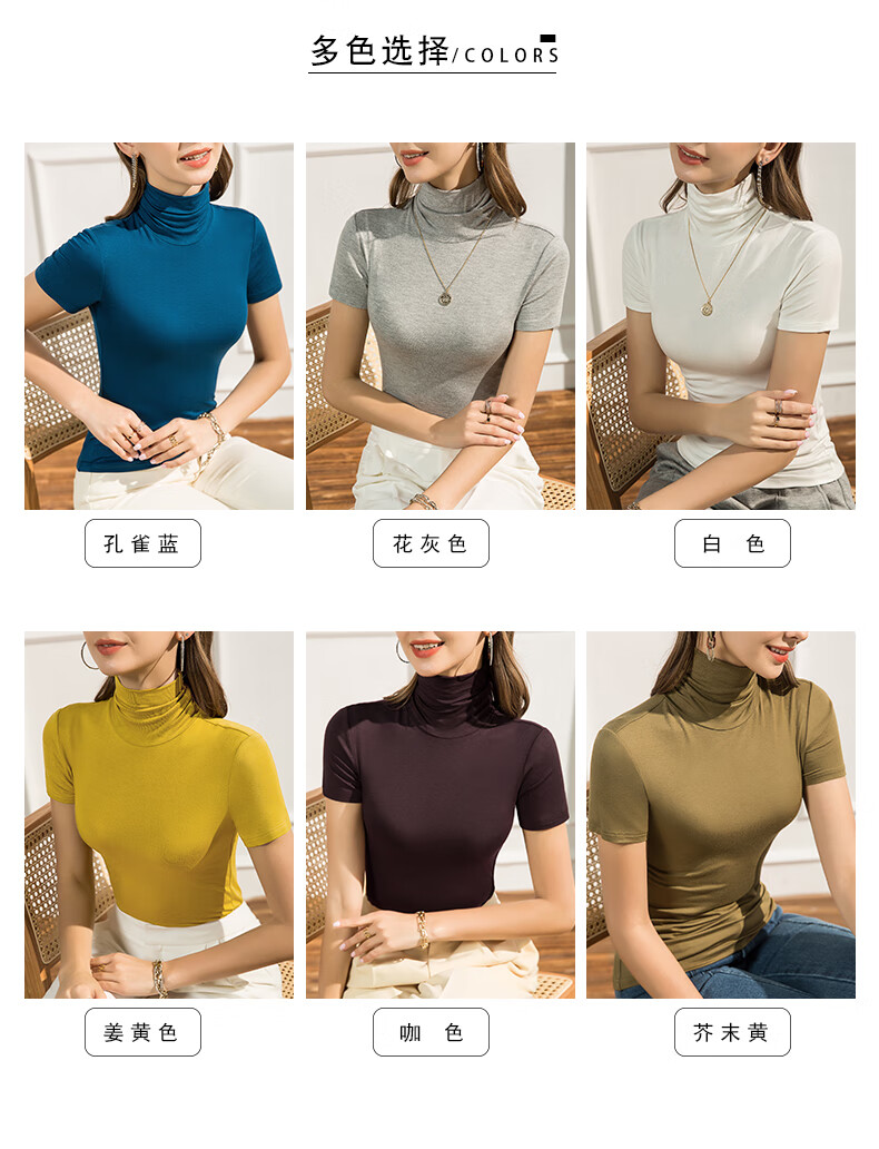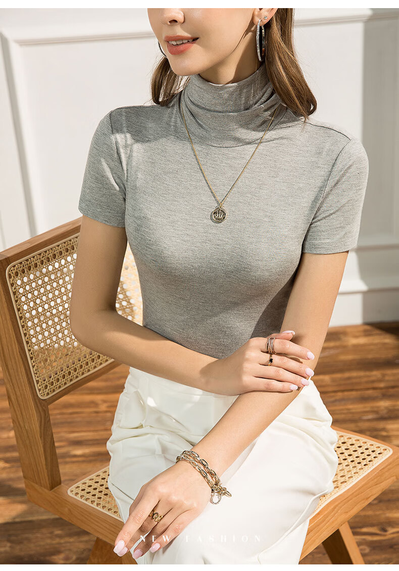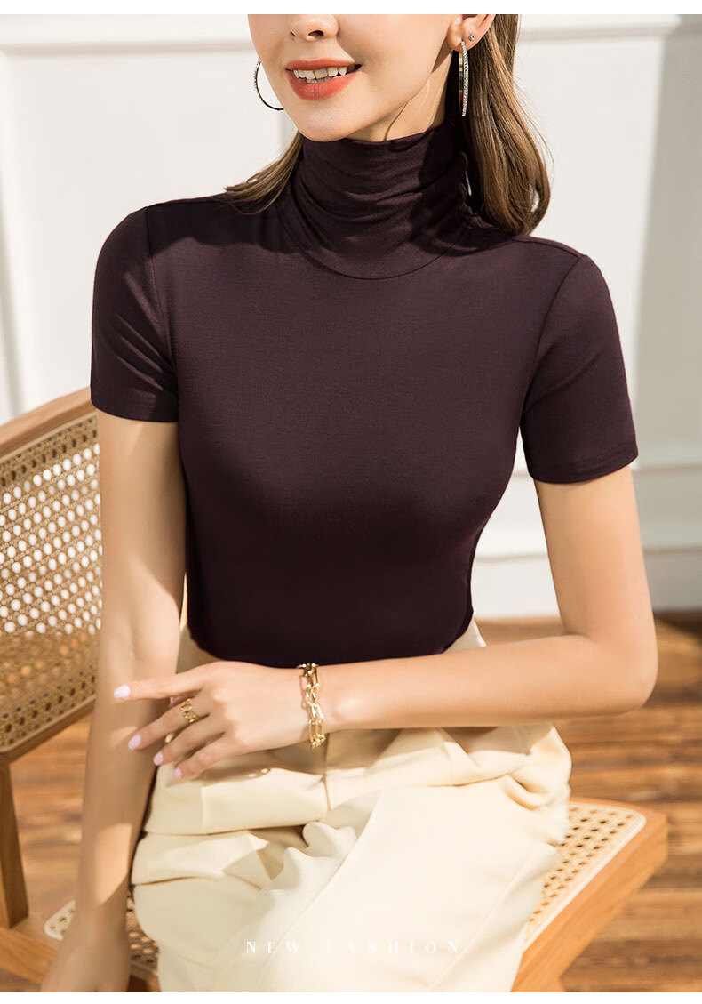 Langsha 2025 new summer style pile collar Modal short-sleeved T-shirt women's high collar slim Korean version solid color versatile white S