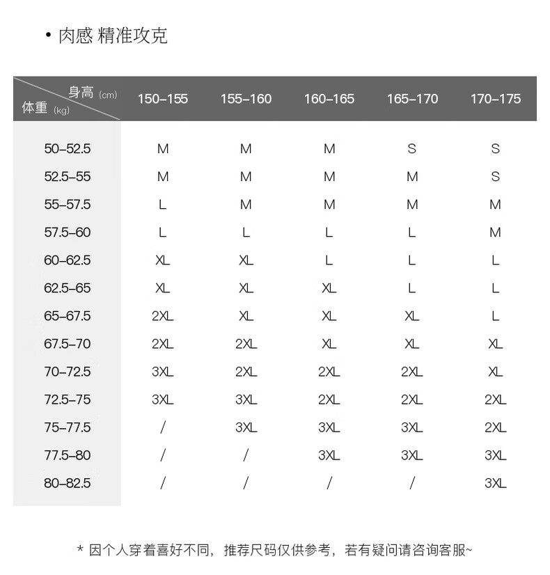 China (cm) 160-165/84-86 165-170 / 88-90 167-172 / 92-96 168-173 / 98-102 170-176 / 106-110