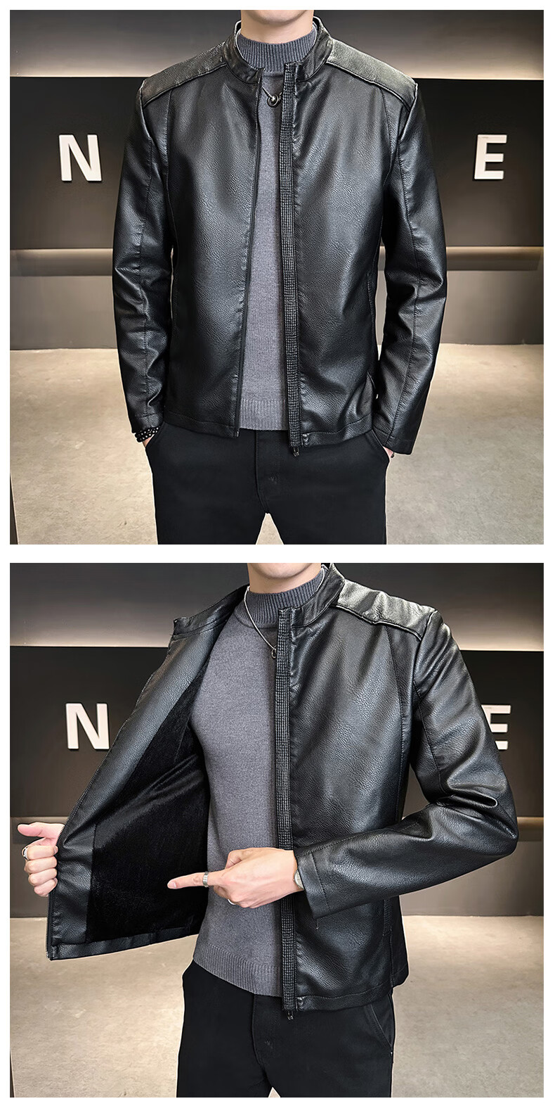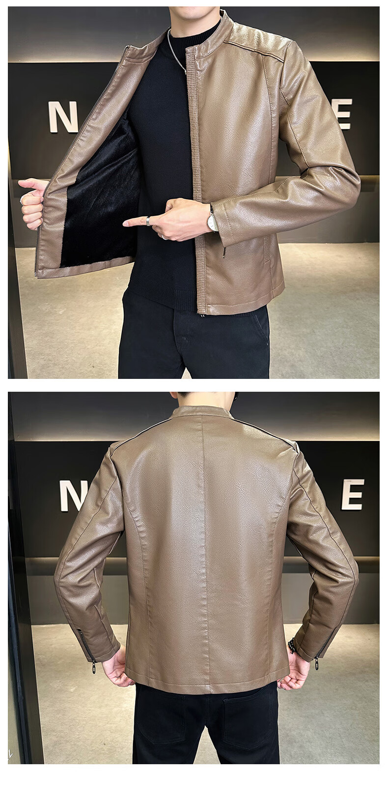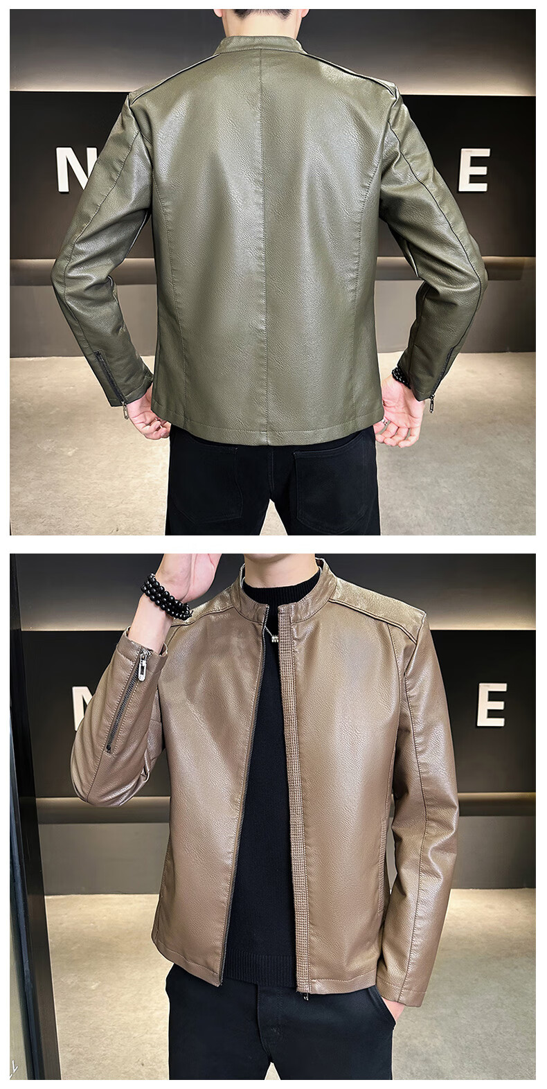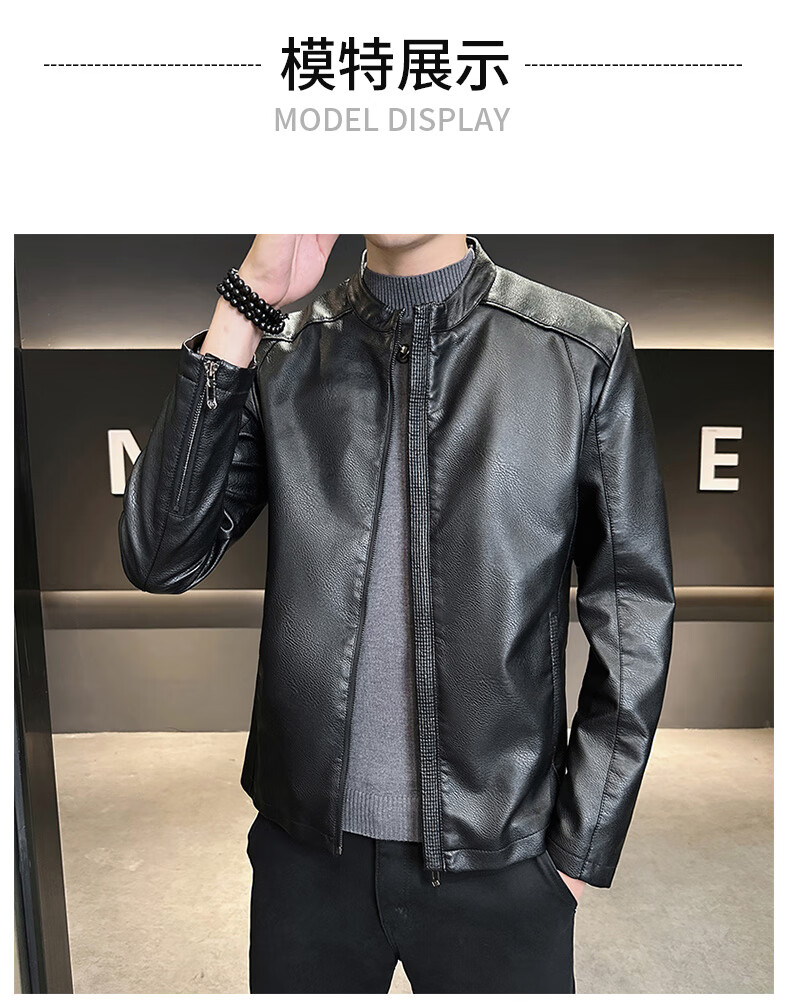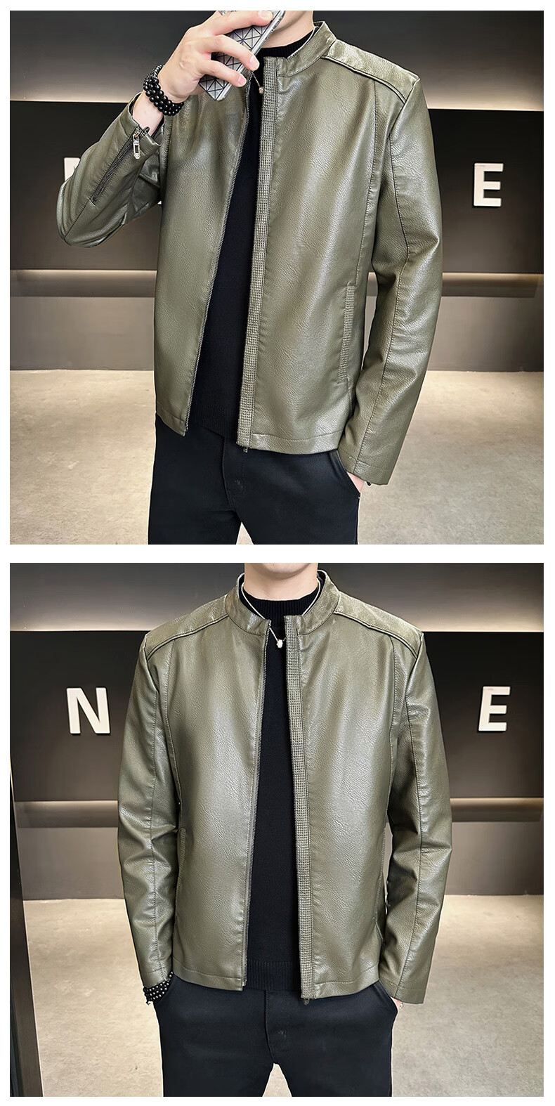High-end stand-up collar leather jacket for men in autumn and winter new fashion casual black leather jacket velvet thickened versatile jacket military green thickened 3XL