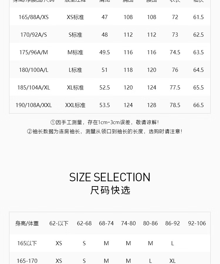 China (cm) 160-165/84-86 165-170 / 88-90 167-172 / 92-96 168-173 / 98-102 170-176 / 106-110