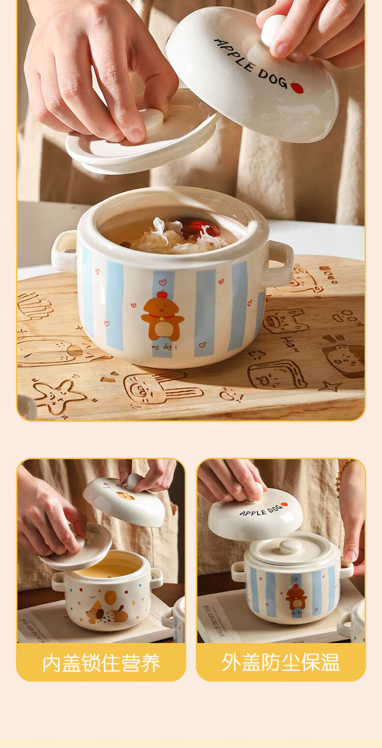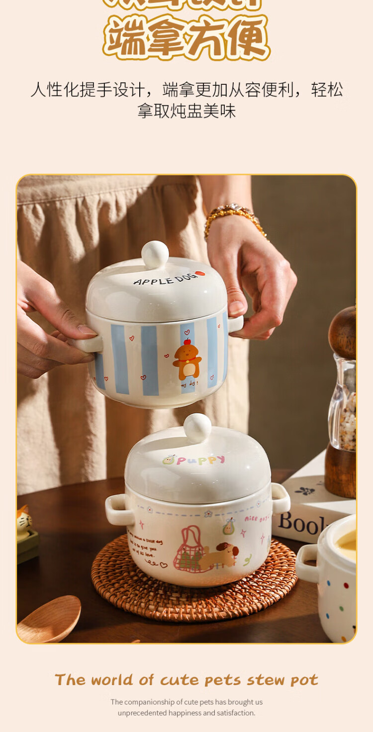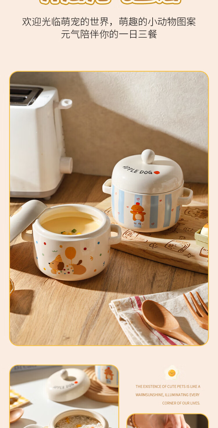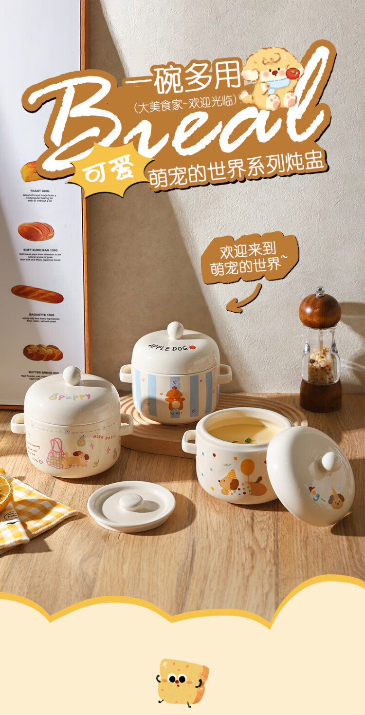 Sheli Cute Ceramic Stewing Cup Household Small Soup Cup with Cover Steamed Egg Bowl Isolated Water Stewing Steaming Cup Stewing Soup Crock Pot Stewing Bird's Nest Balloon Dog-Stewing Cup 550ML 500ml Can be steamed, baked or microwaved