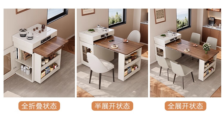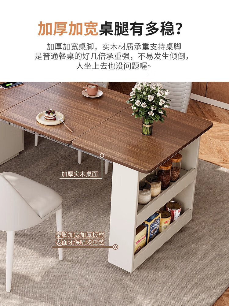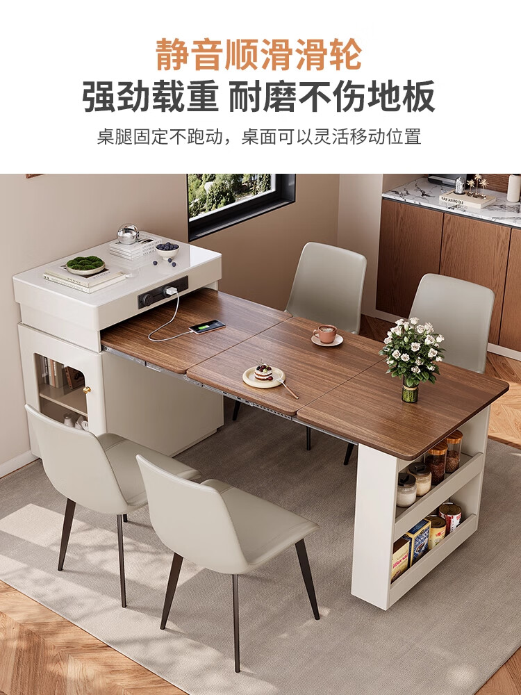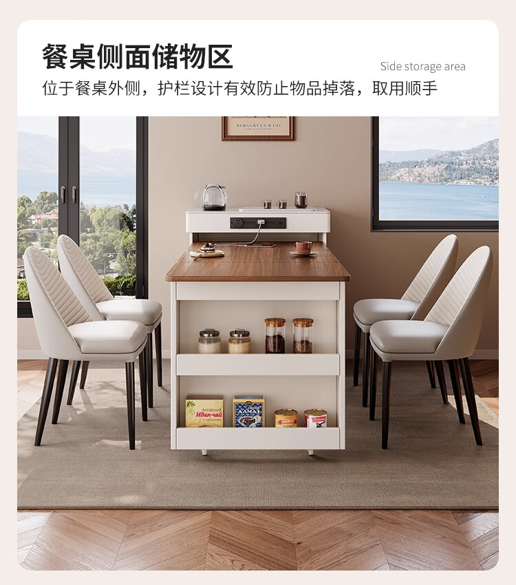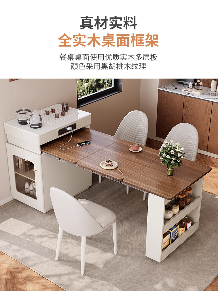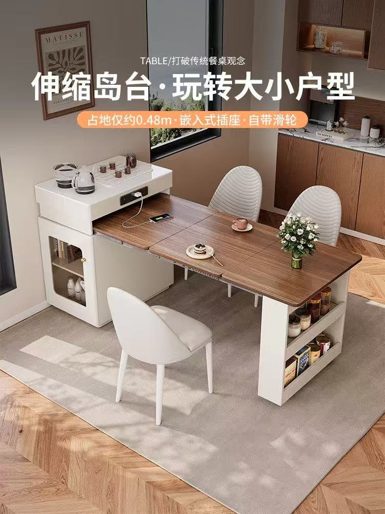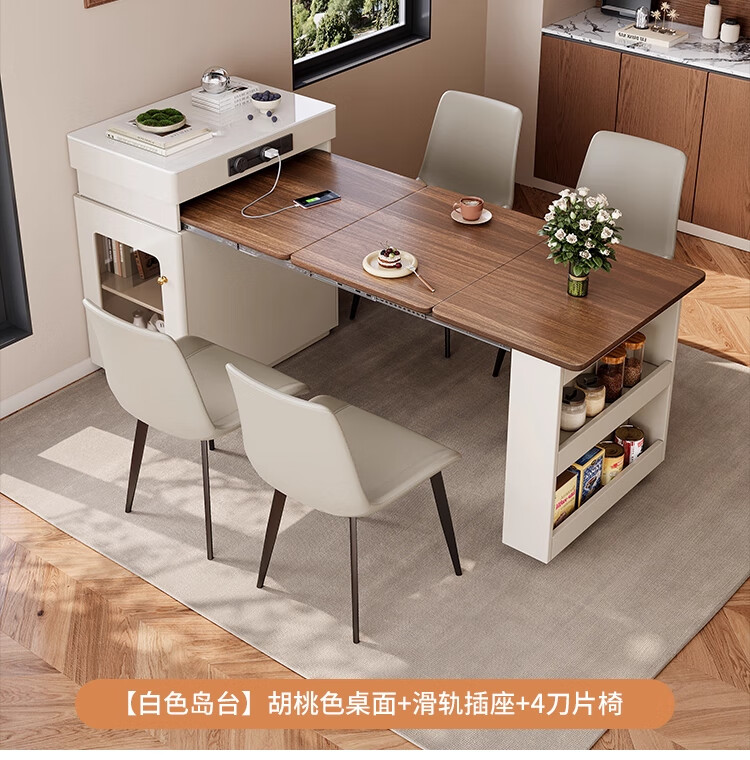 Jun cream style solid wood narrow island dining table integrated retractable folding small household multifunctional dining table tea table Folding island dining table + 4 blade chairs 1.5 meters slide rail socket flat style