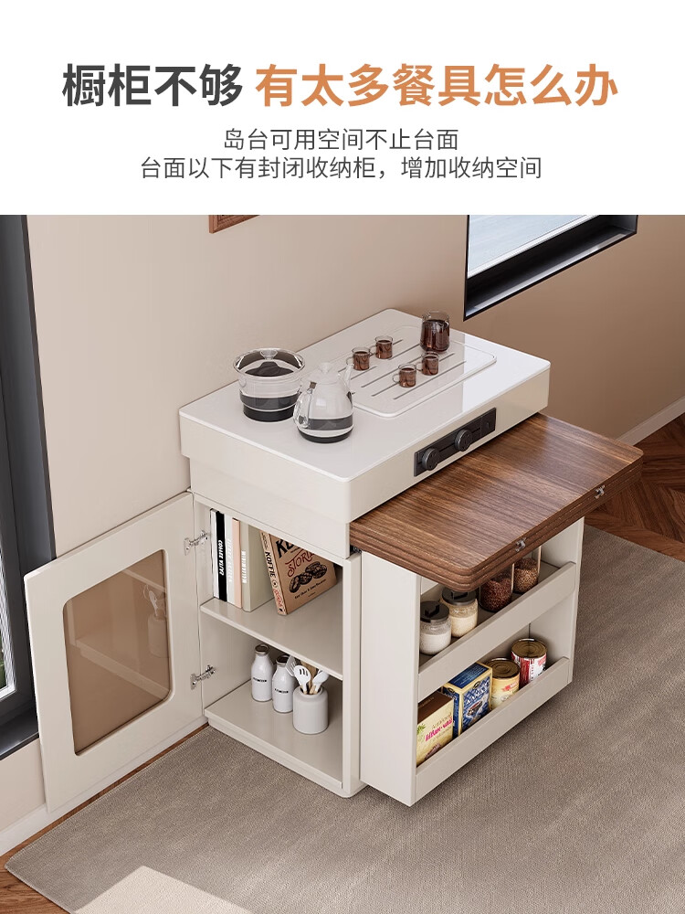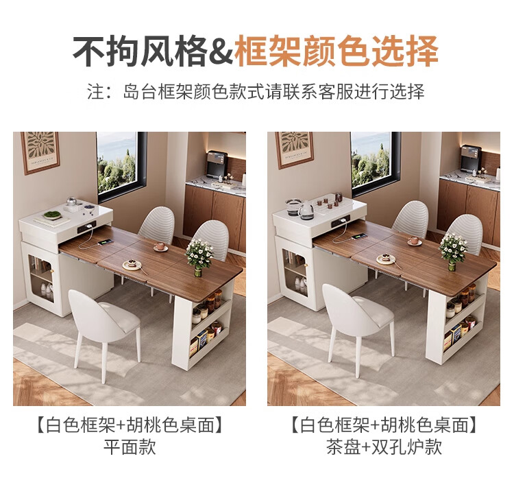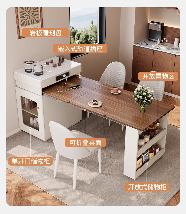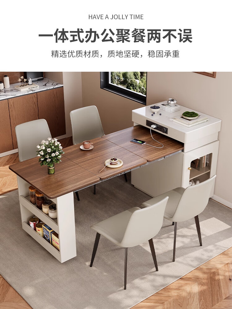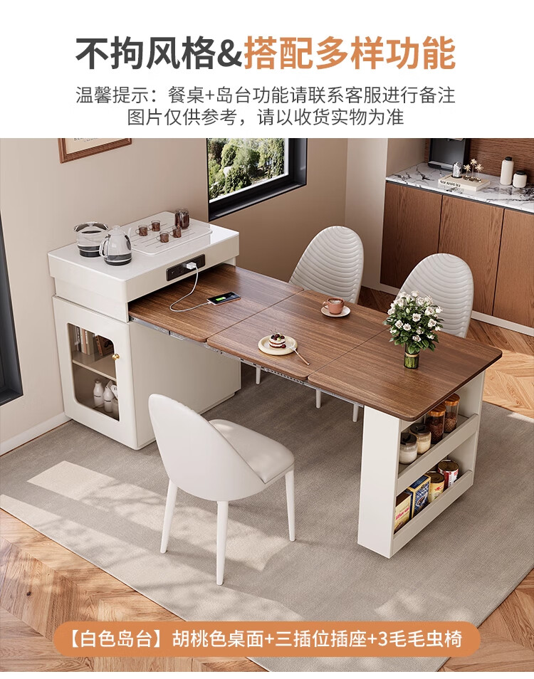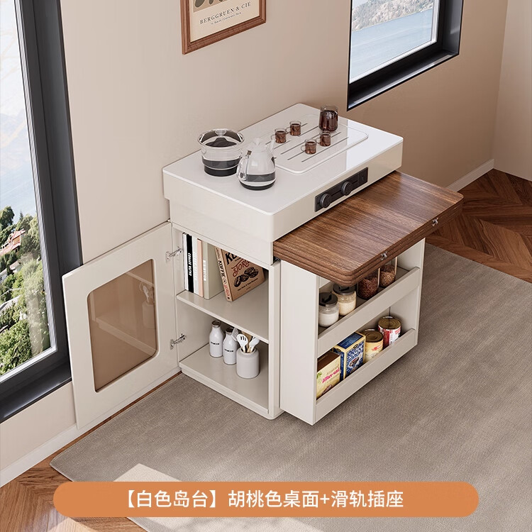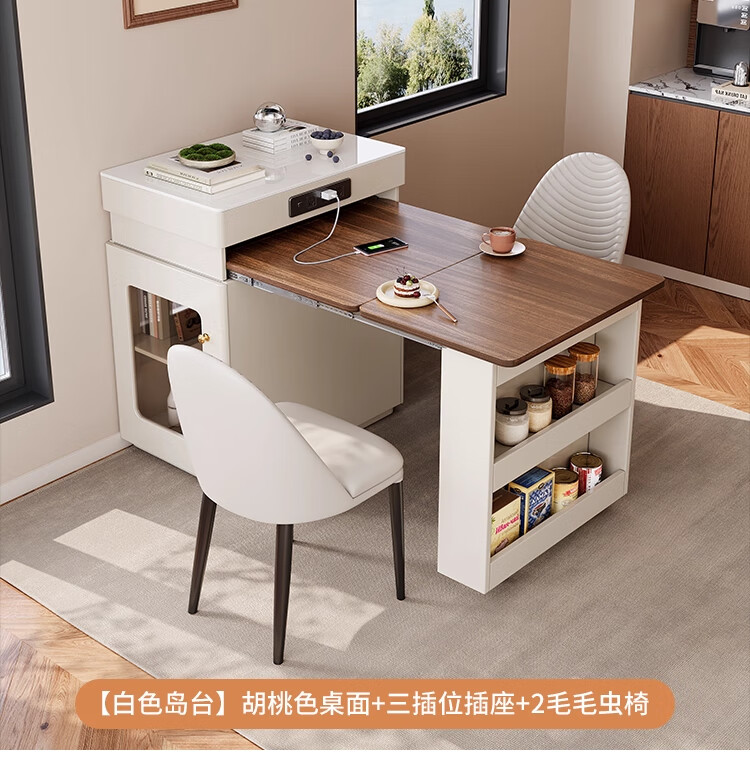 Jun cream style solid wood narrow island dining table integrated retractable folding small household multifunctional dining table tea table Folding island dining table + 4 blade chairs 1.5 meters slide rail socket flat style