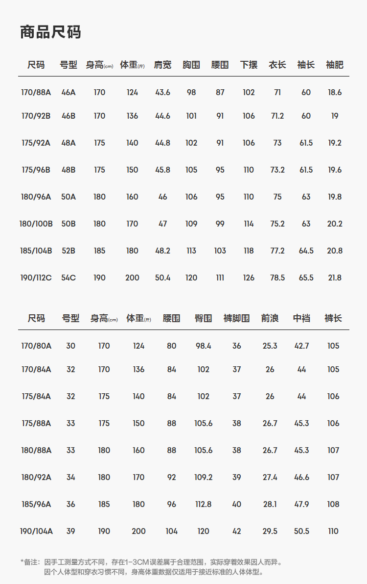 China (cm) 160-165/84-86 165-170 / 88-90 167-172 / 92-96 168-173 / 98-102 170-176 / 106-110