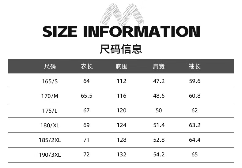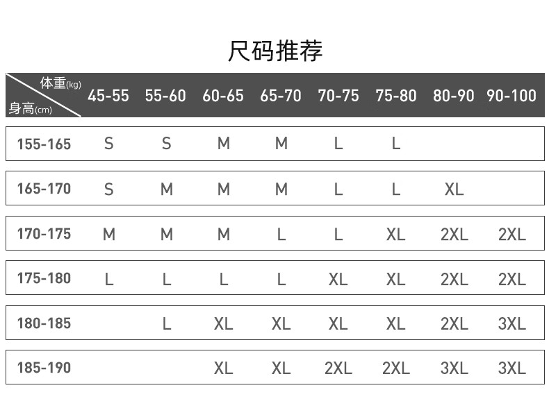 China (cm) 165 / 88-90 170 / 96-98 175 / 108-110 180 / 118-122 185 / 126-130