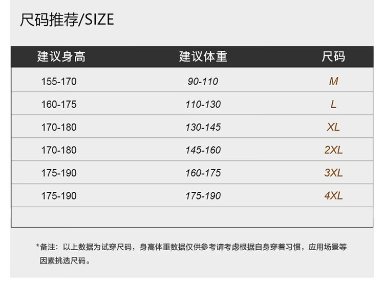 China (cm) 165 / 88-90 170 / 96-98 175 / 108-110 180 / 118-122 185 / 126-130