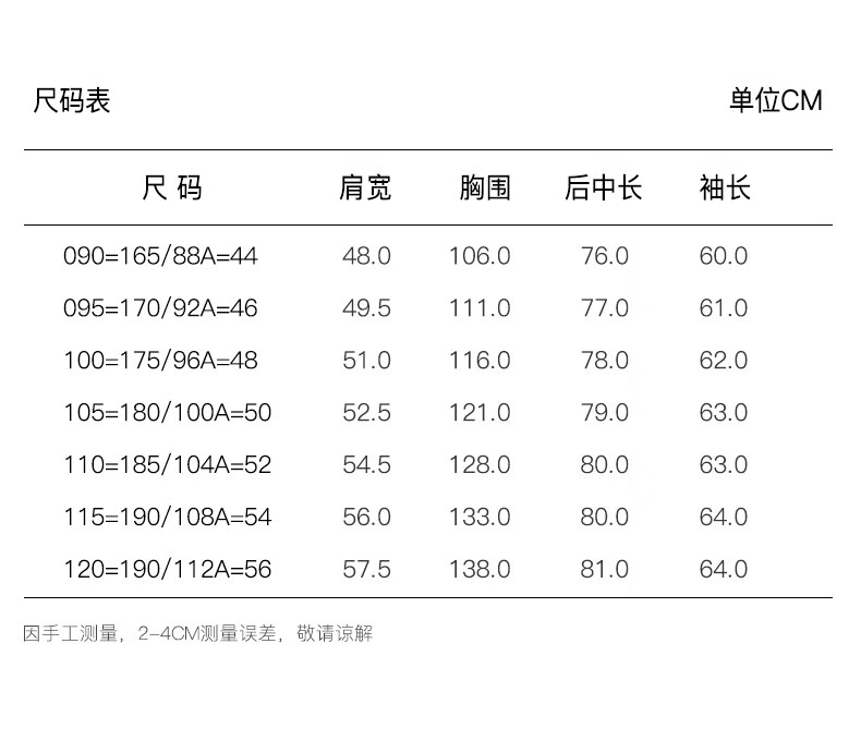 China (cm) 160-165/84-86 165-170 / 88-90 167-172 / 92-96 168-173 / 98-102 170-176 / 106-110