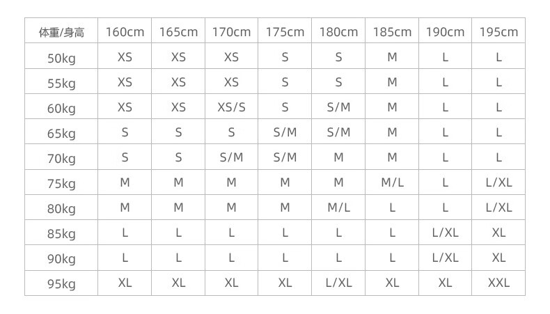 China (cm) 160-165/84-86 165-170 / 88-90 167-172 / 92-96 168-173 / 98-102 170-176 / 106-110