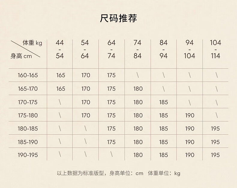 China (cm) 160-165/84-86 165-170 / 88-90 167-172 / 92-96 168-173 / 98-102 170-176 / 106-110