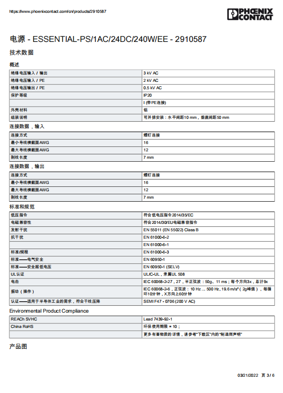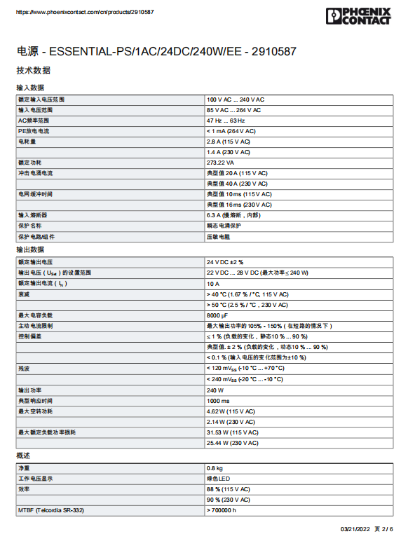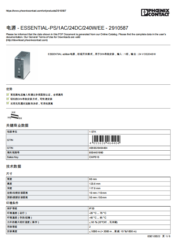 Phoenix 24V/10A switching power supply 2910587 ESSENTIAL-PS/1AC/24DC/240W/