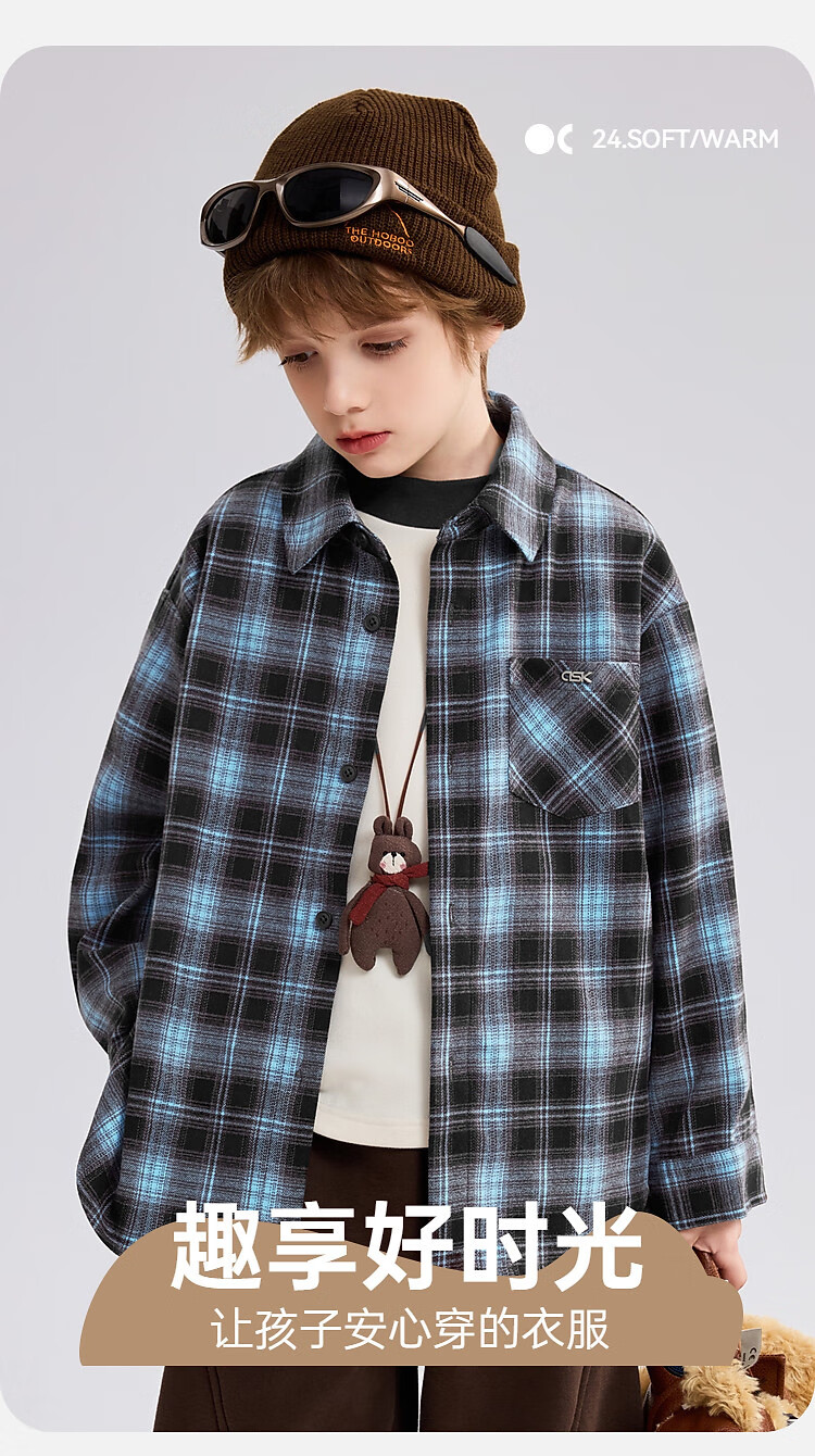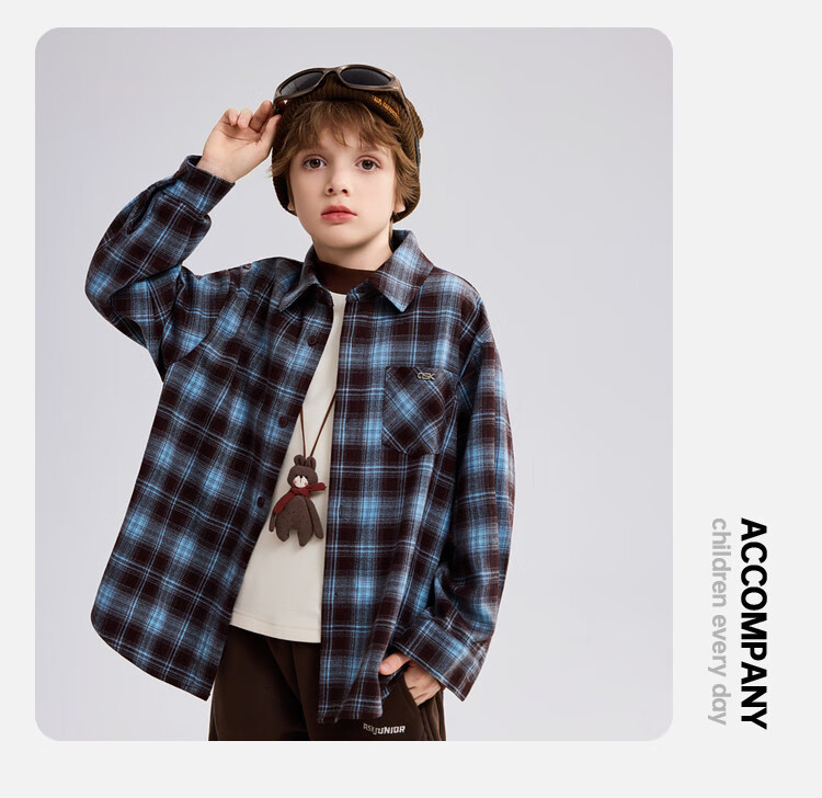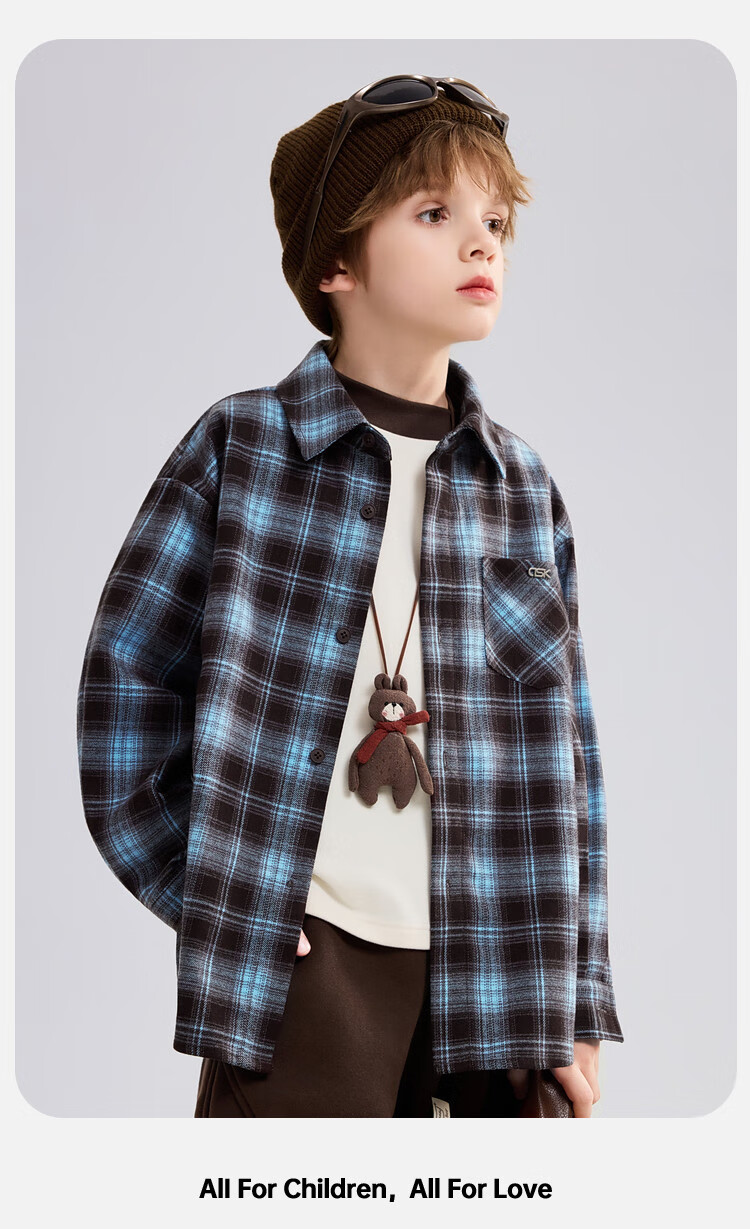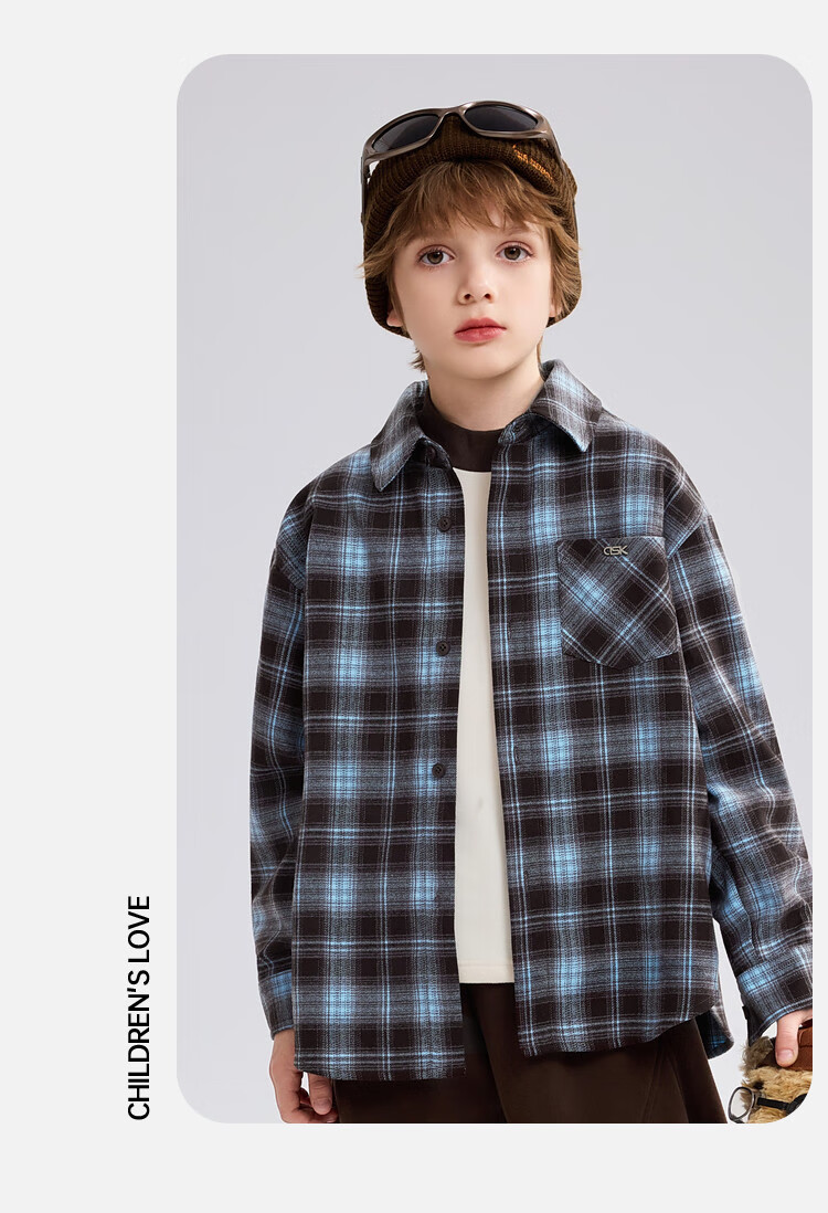 ASK JUNIOR brushed children's shirt 2026 autumn medium and large children's lapel plaid contrast shirt boys jacket brown 130