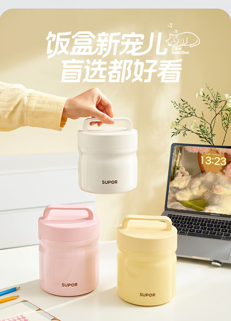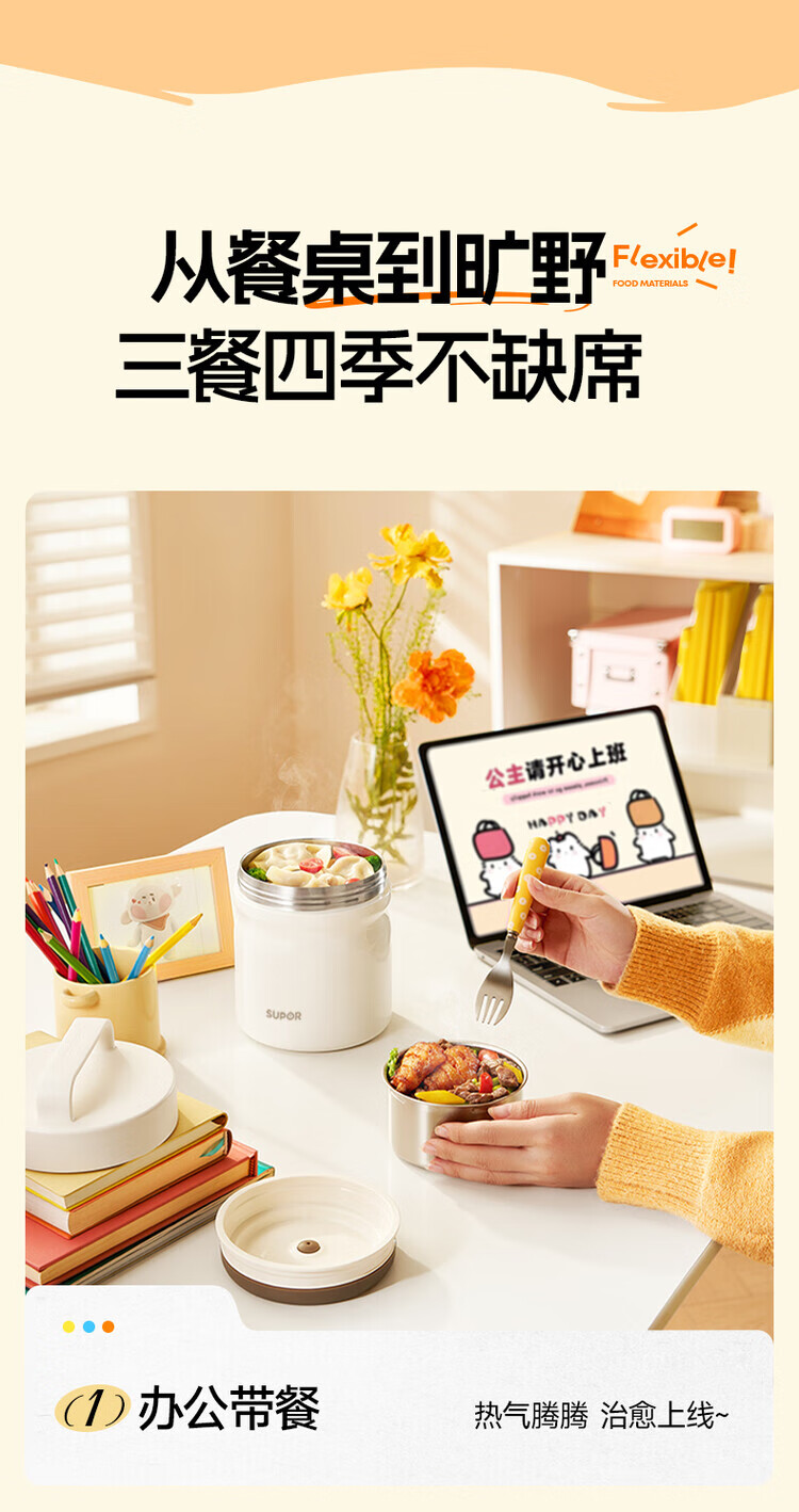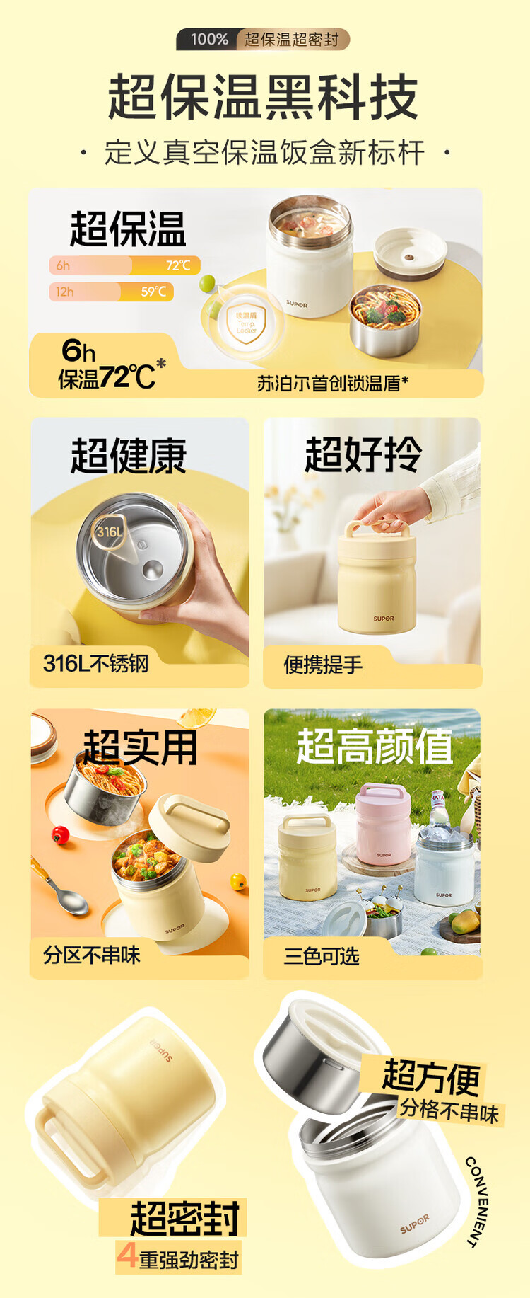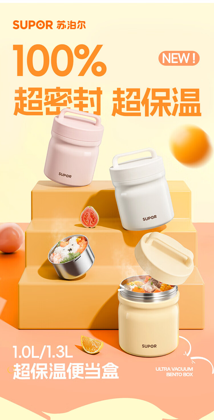 SUPOR insulated lunch box for office workers and female students with meals, large-capacity stainless steel extra-long insulated bucket 2025 new model, divided style 1300mL malt yellow, super thermal insulation, super sealed, guaranteed