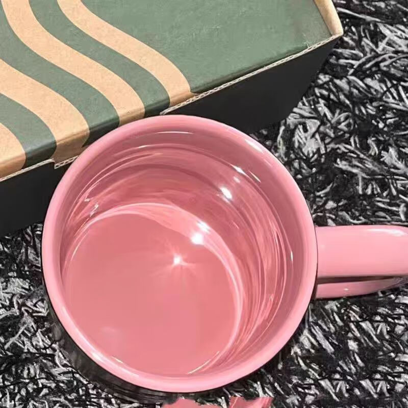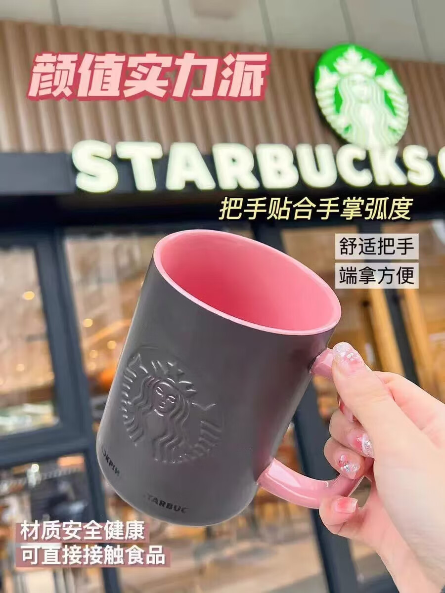 Starbucks Cup PINK Ceramic Mug Pink Handle High-Looking Creative Coffee Cup Desktop Water Cup Black Pink Goddess Cup 475ml