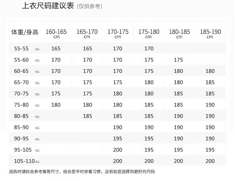 China (cm) 160-165/84-86 165-170 / 88-90 167-172 / 92-96 168-173 / 98-102 170-176 / 106-110