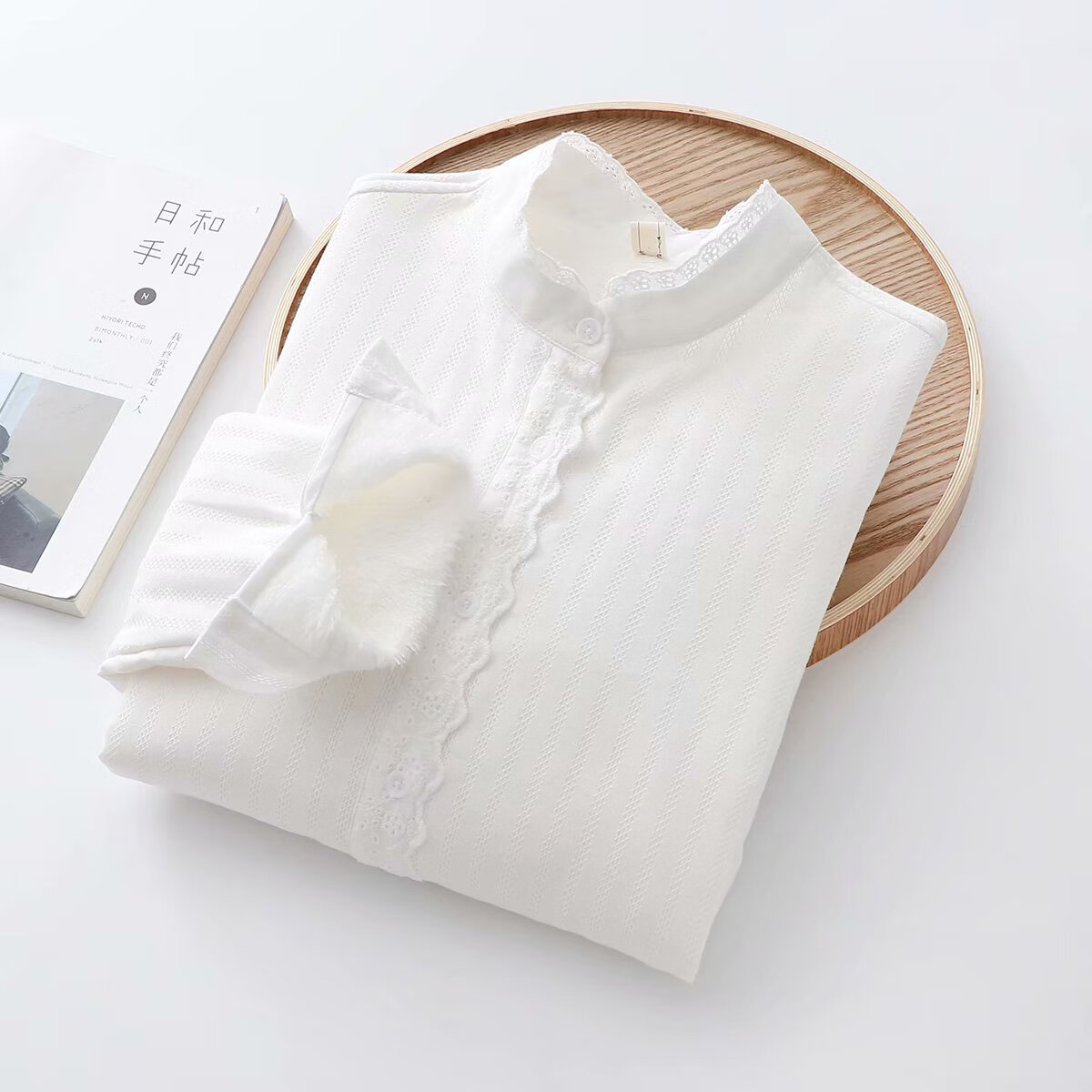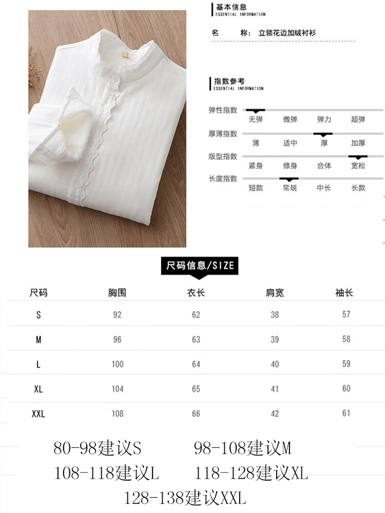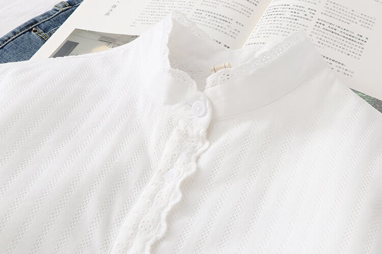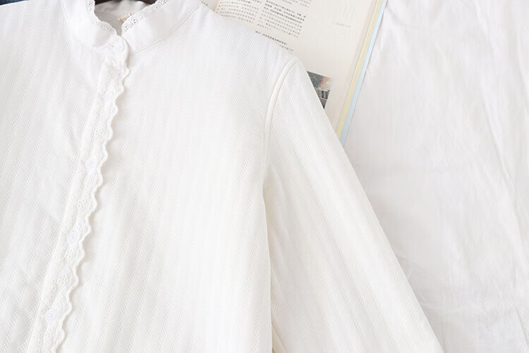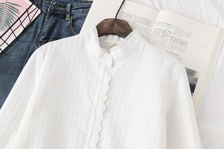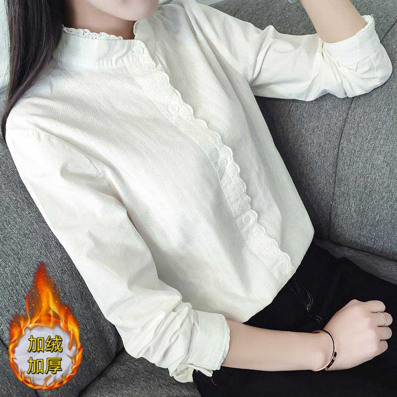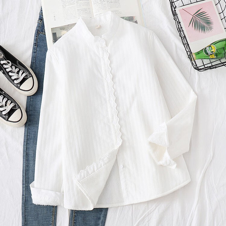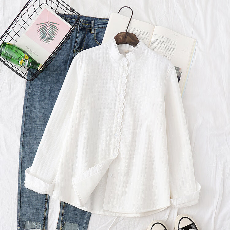 Plush white shirt for women, autumn and winter Korean style loose cotton stand-up collar shirt, warm inner layer, thickened base shirt H68 white M