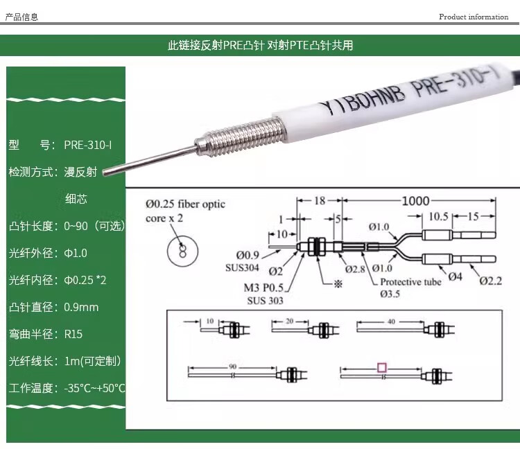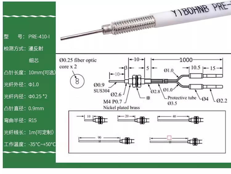 Ultra-fine optical fiber tube 0.9 convex pin PRE-310-I FRE-310-I FRE-310-S PRE-410-I Reflective M4 one-meter wire convex pin length 10mm