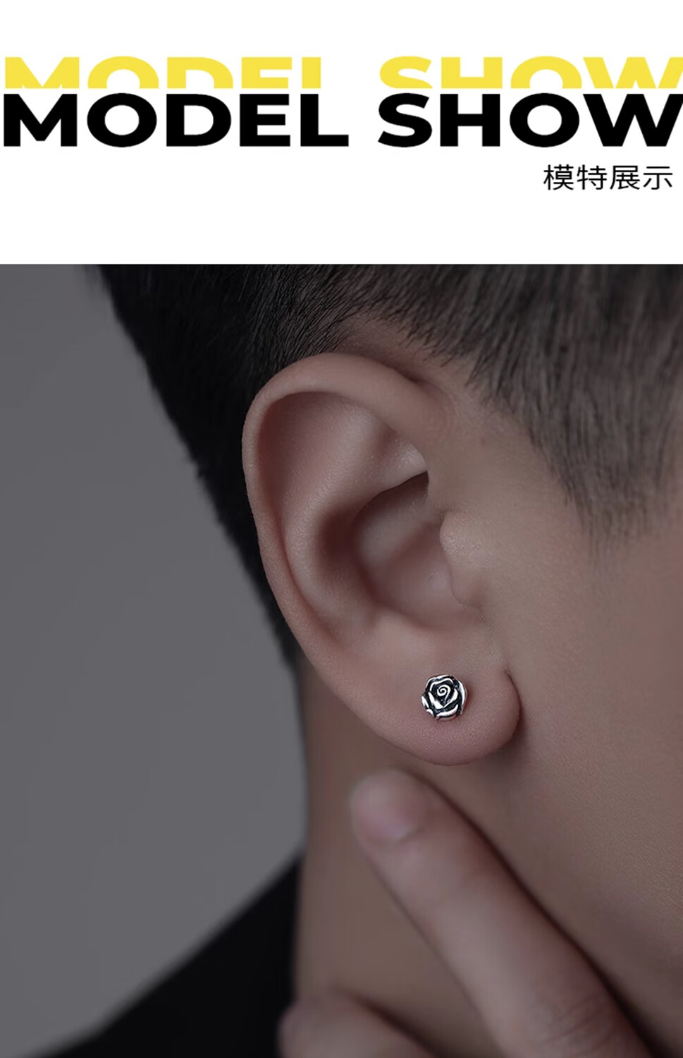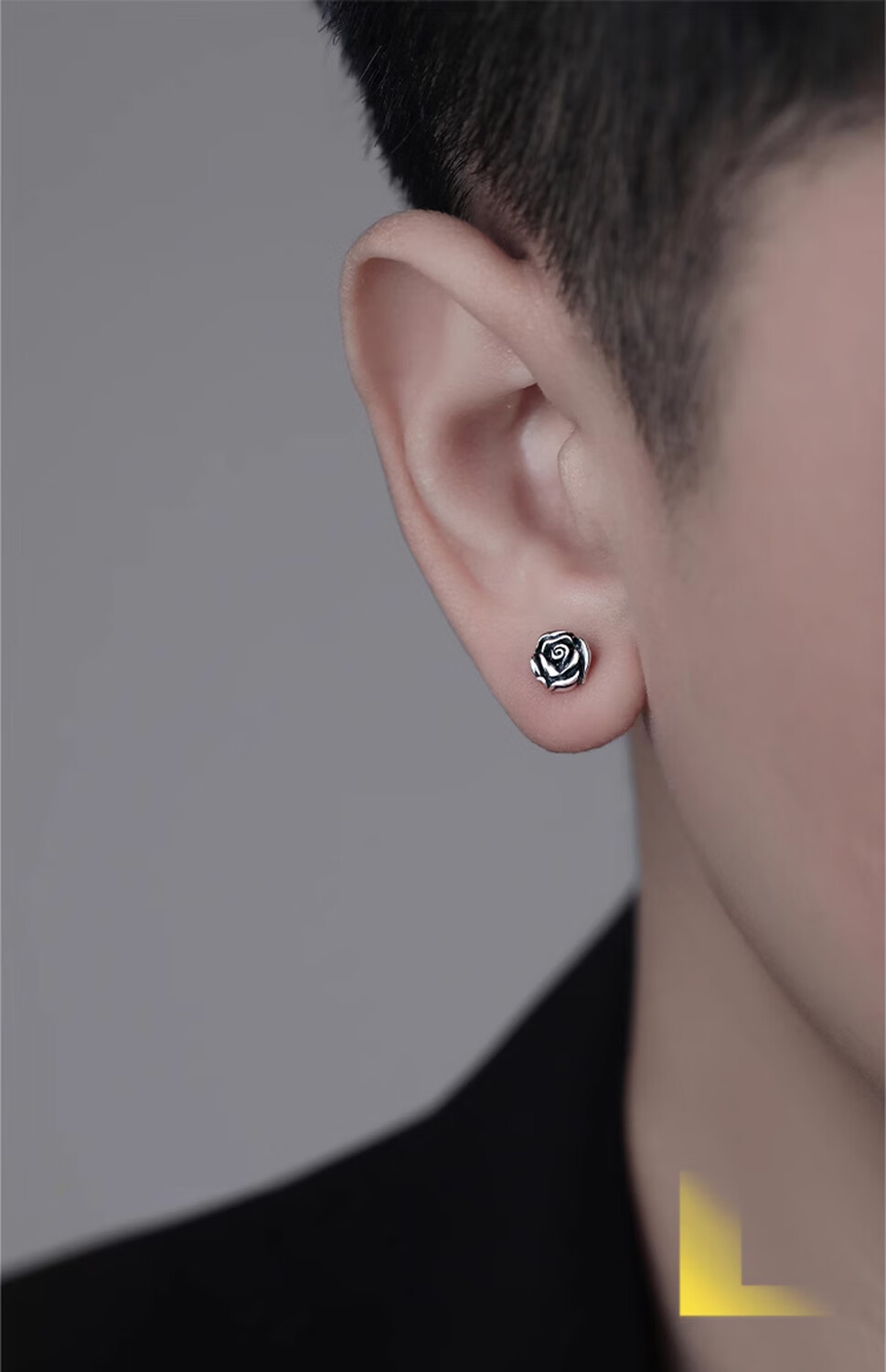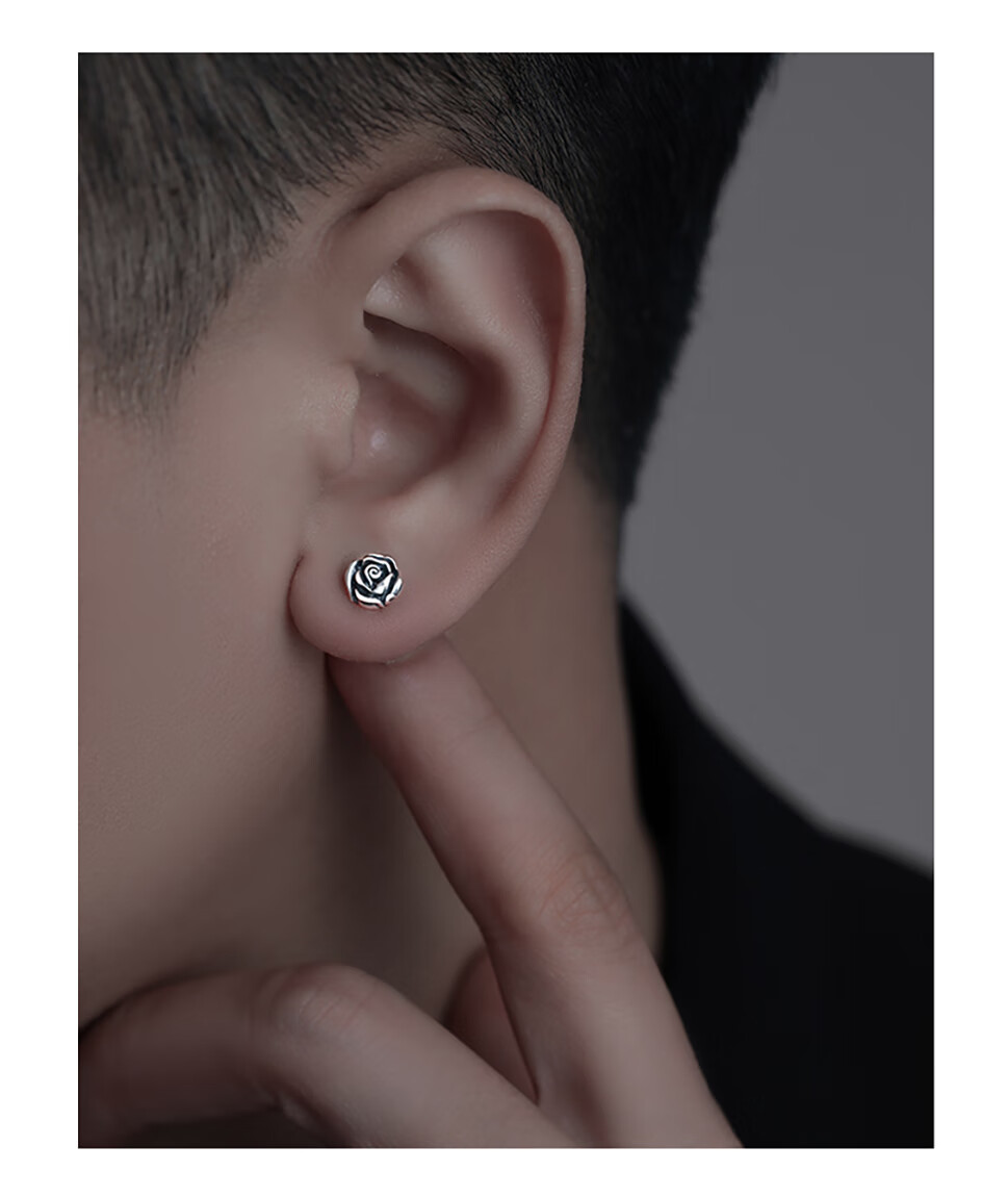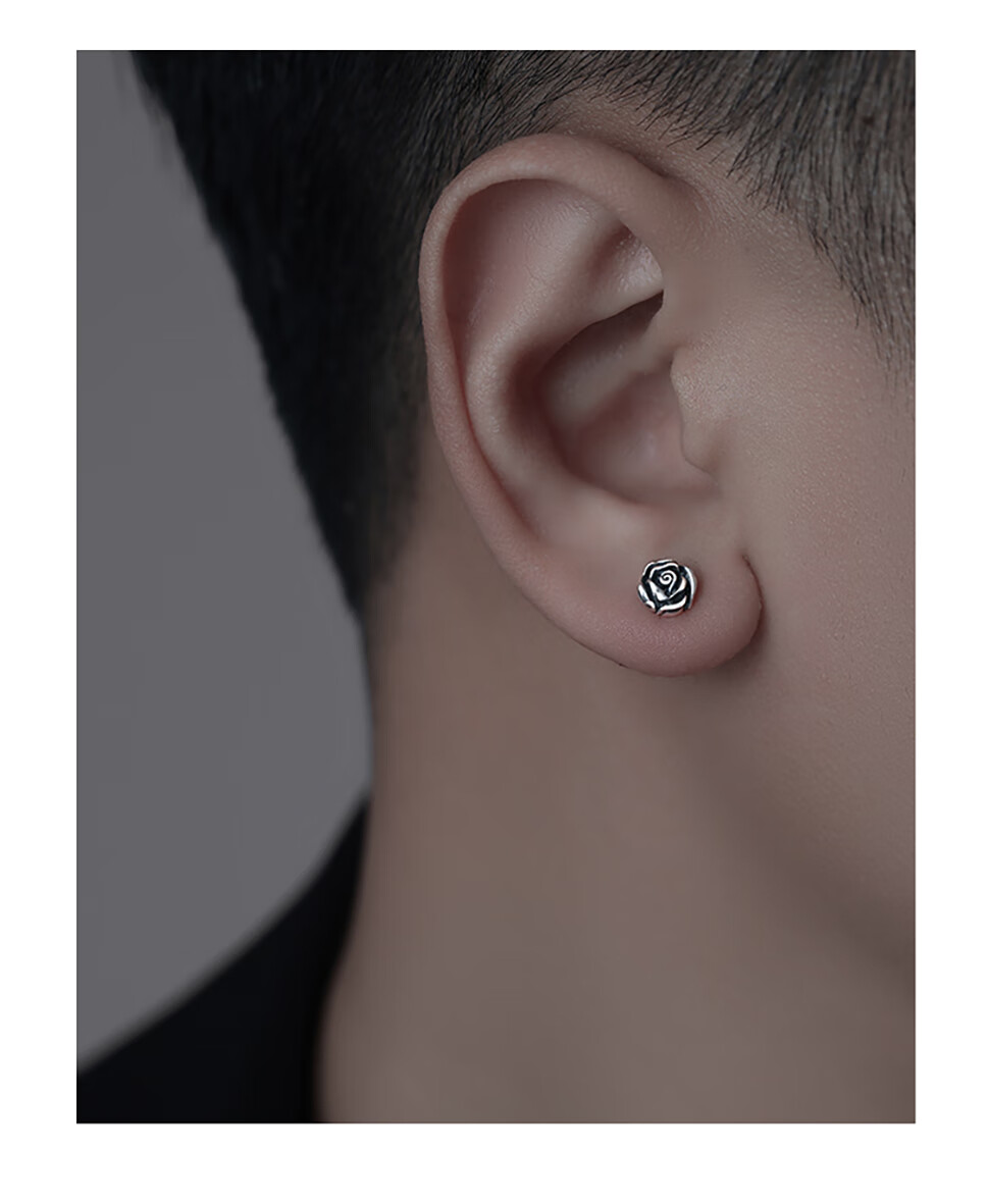 Gongman S925 Sterling Silver Men's Earrings Simple Retro Distressed Black Rose Earrings Men's Trendy Exquisite Earrings for Friends S925 Sterling Silver Black Rose Retro Earrings Single