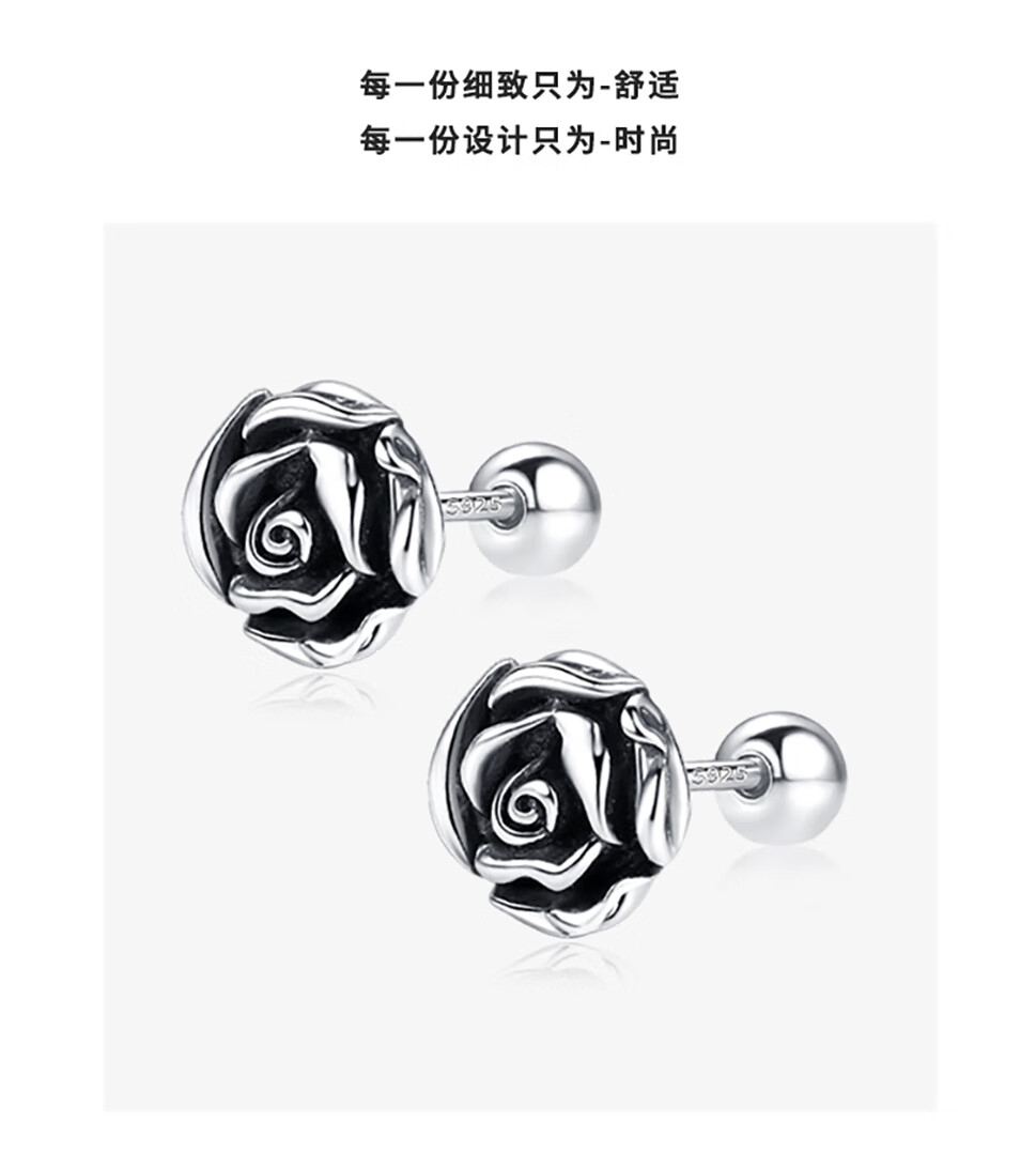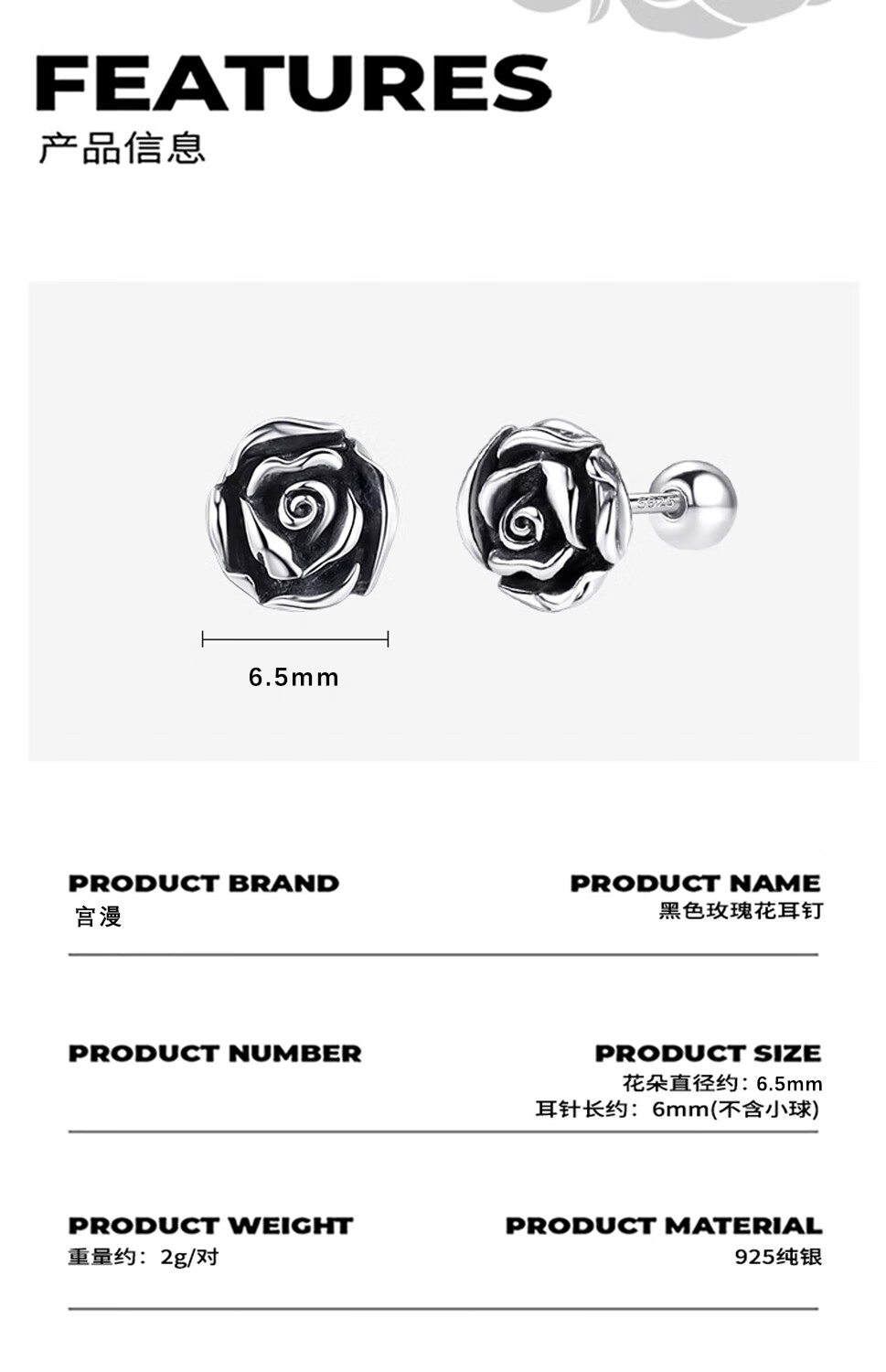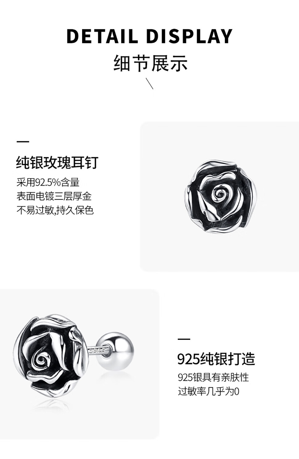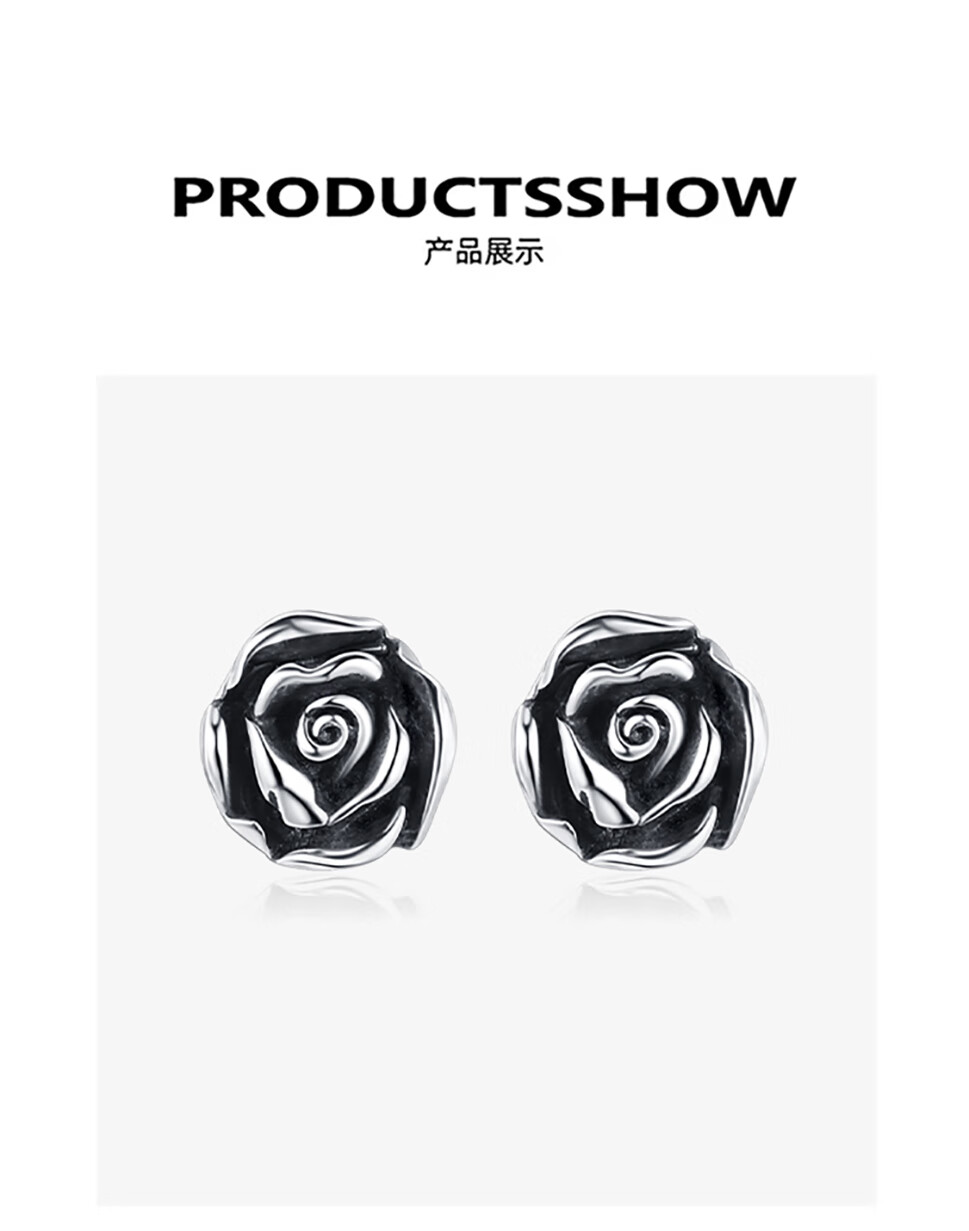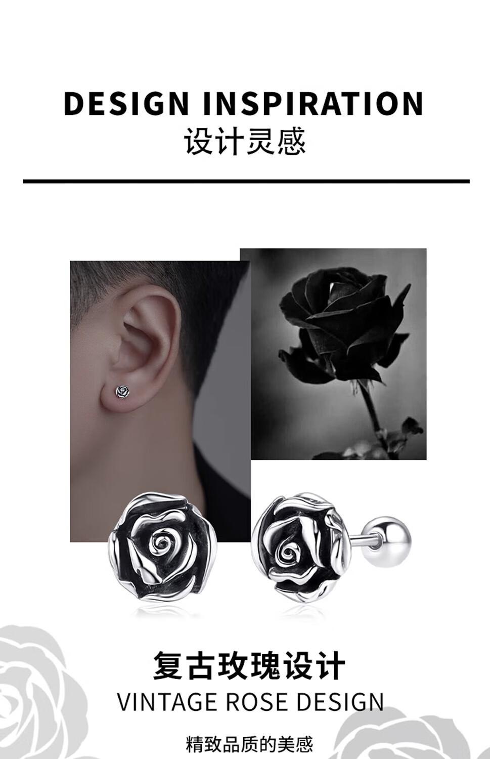 Gongman S925 Sterling Silver Men's Earrings Simple Retro Distressed Black Rose Earrings Men's Trendy Exquisite Earrings for Friends S925 Sterling Silver Black Rose Retro Earrings Single