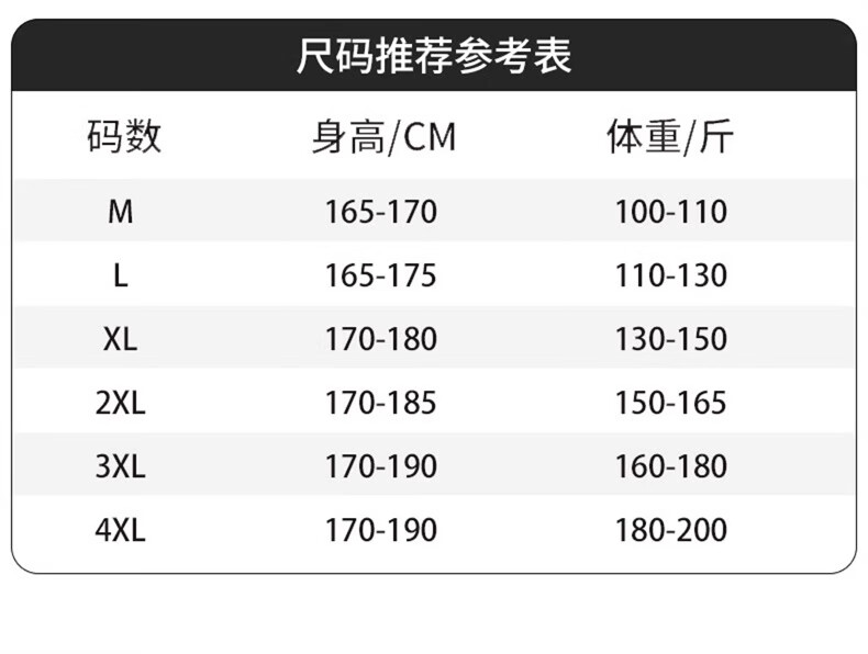 China (cm) 165 / 88-90 170 / 96-98 175 / 108-110 180 / 118-122 185 / 126-130