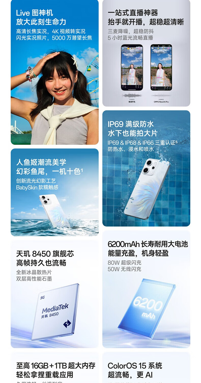 OPPO Reno14 Pro 5G mobile phone, national subsidy, live broadcast artifact, high-definition telephoto live photo, Mermaid trendy color matching, IP69 full waterproof, Alocasia purple, 12GB+256GB