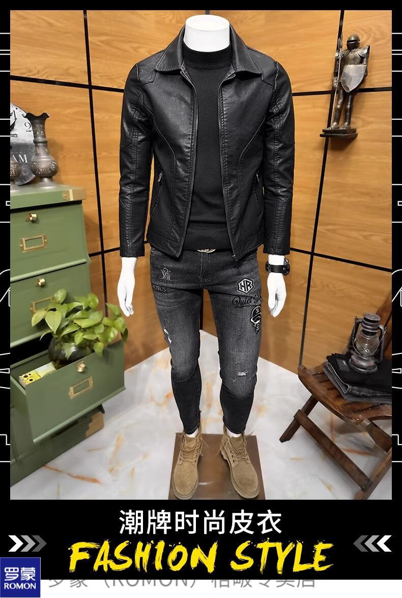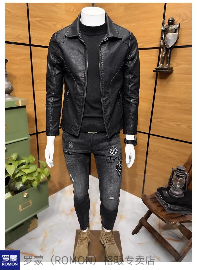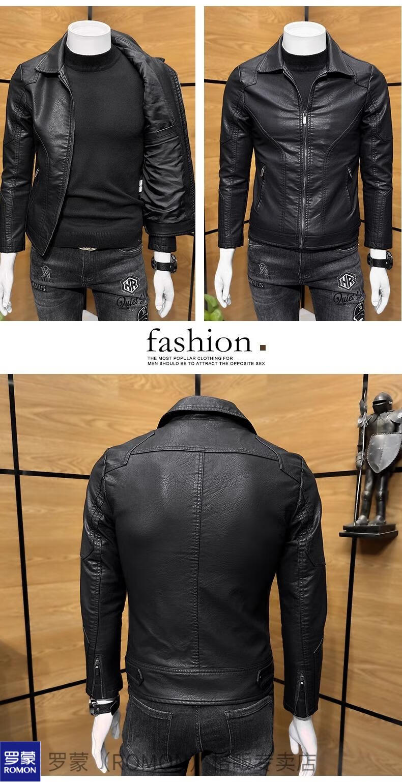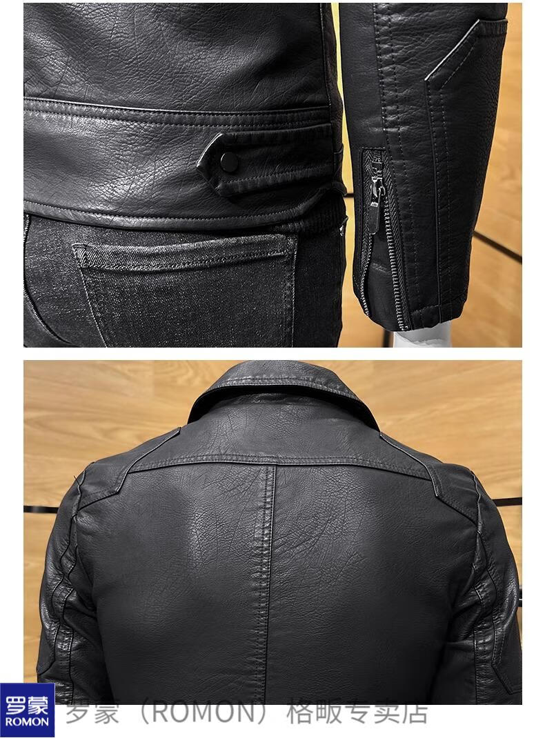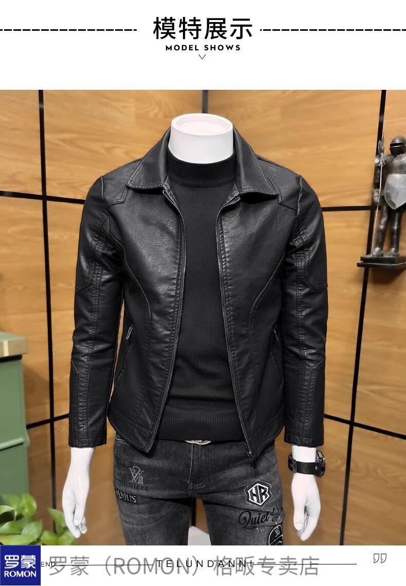 ROMON high-end imitation leather jacket men's lapel spring and autumn short jacket imitation sheepskin motorcycle jacket black regular size M 110Jin Jin is equal to less than 0.5 kg