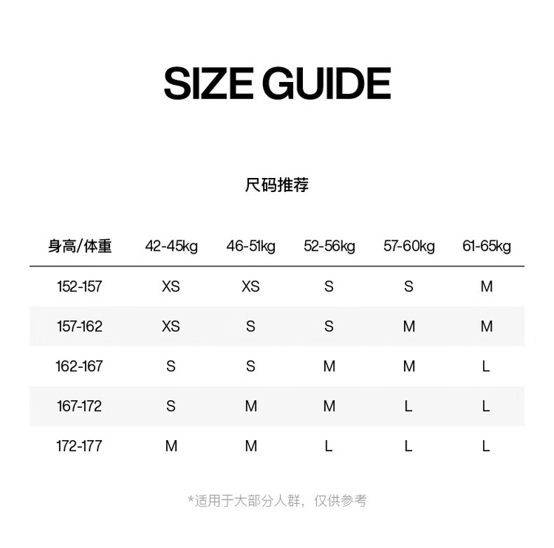 China (cm) 160-165/84-86 165-170 / 88-90 167-172 / 92-96 168-173 / 98-102 170-176 / 106-110