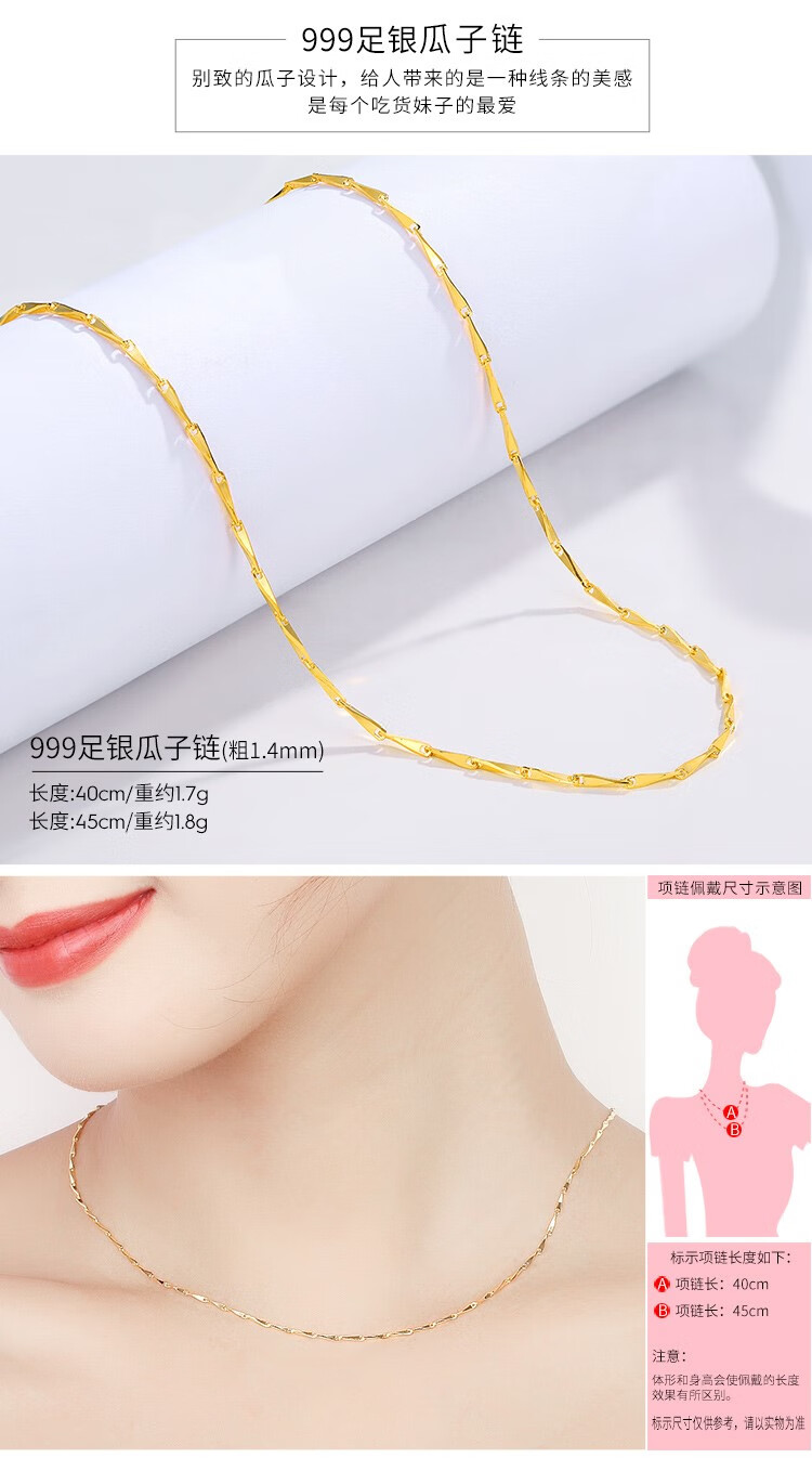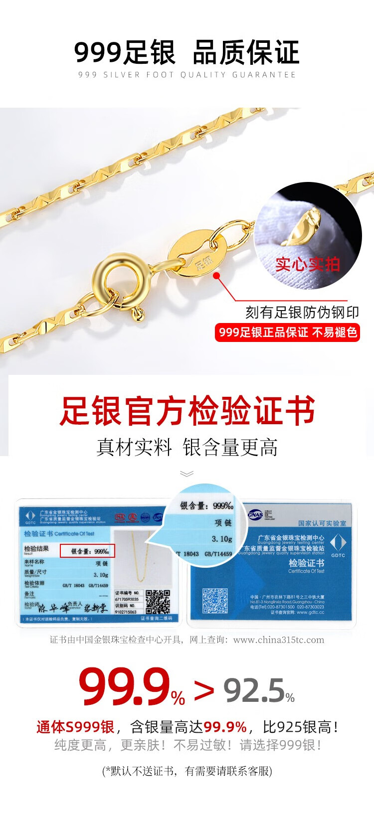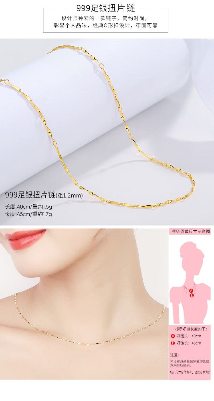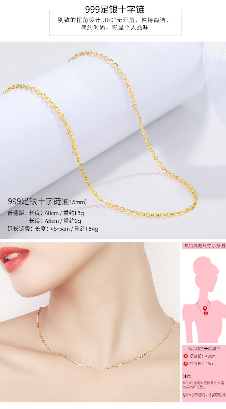 Chow Tai Fook 99 sterling silver necklace for women without pendant gold-plated 18k gold chain colored silver plain chain does not fade 999-cross chain 40cm store manager