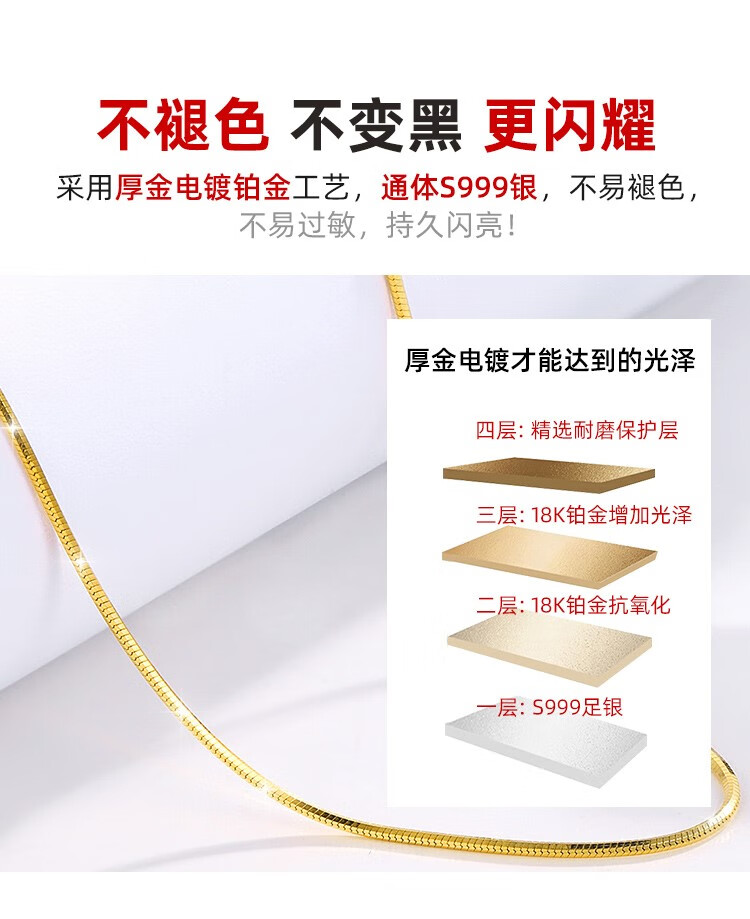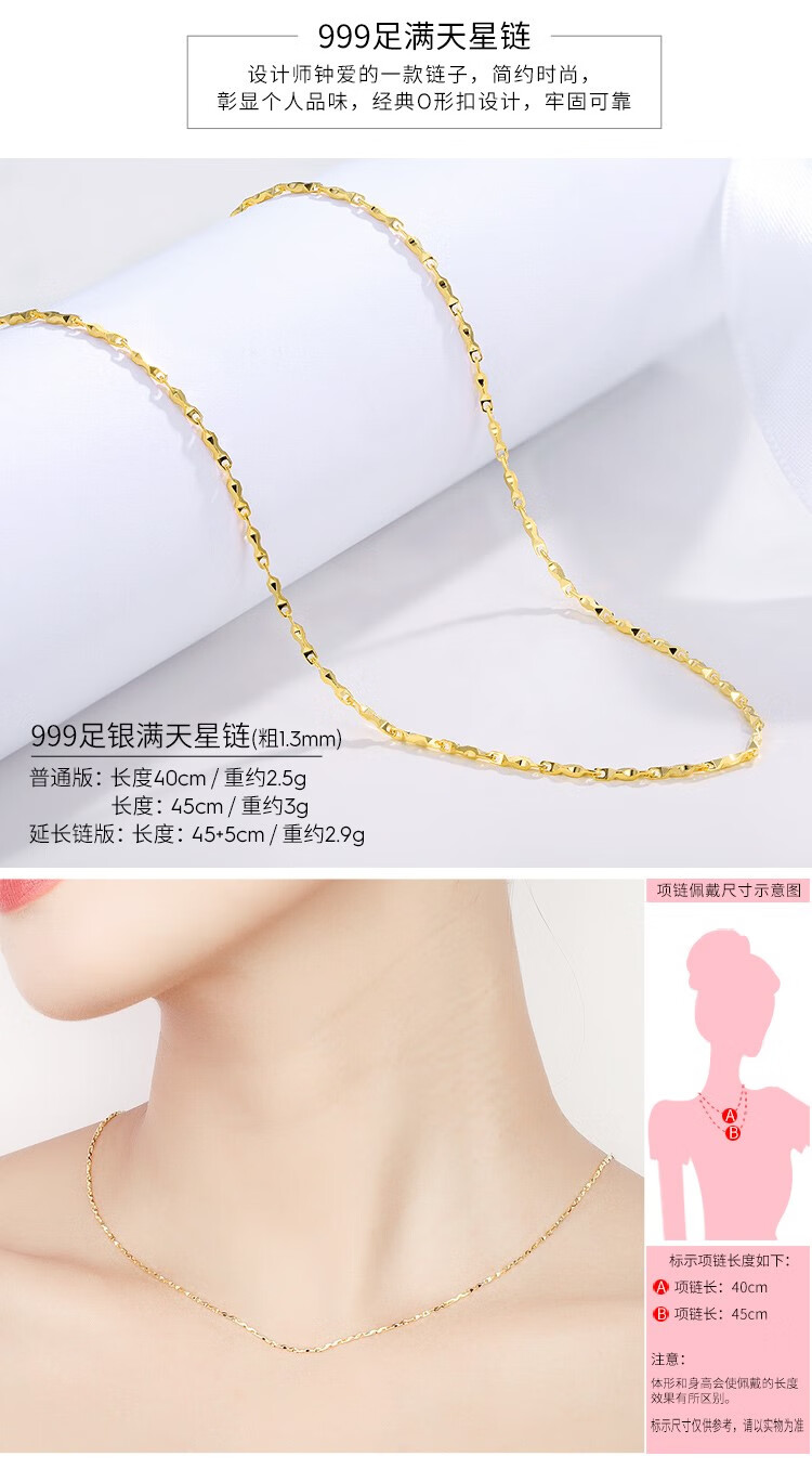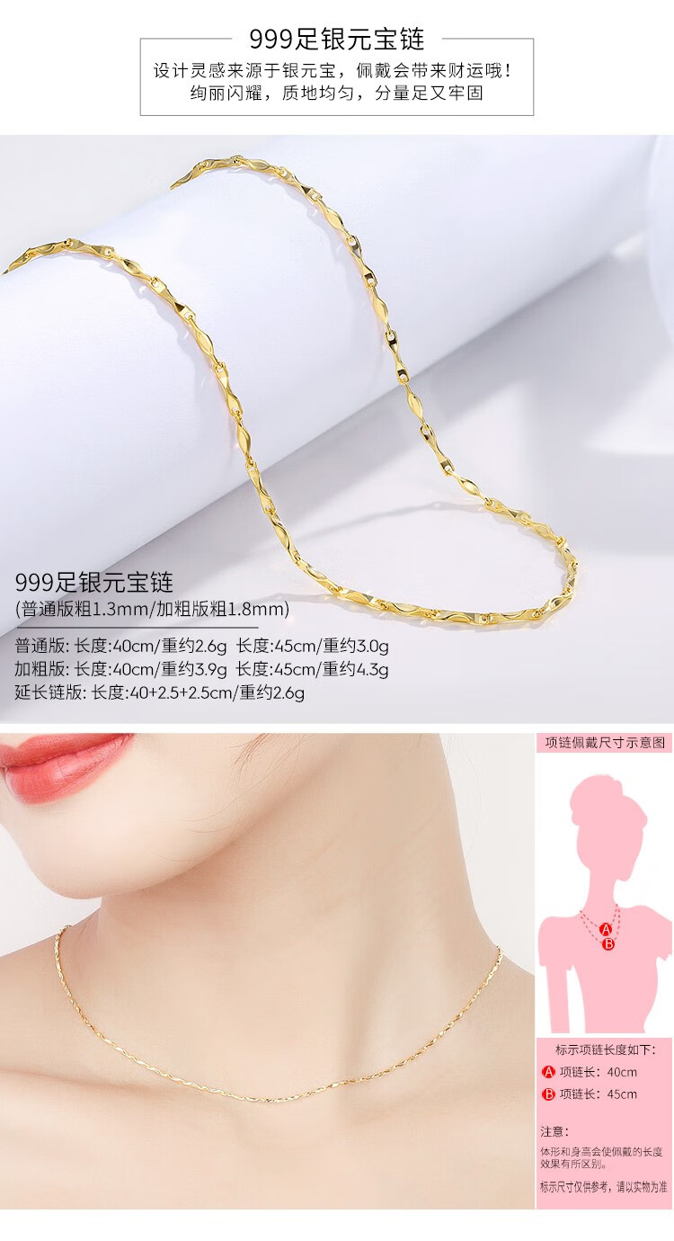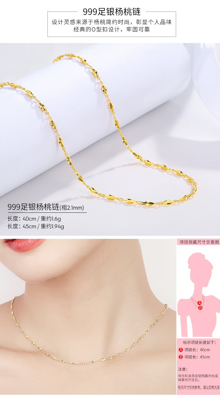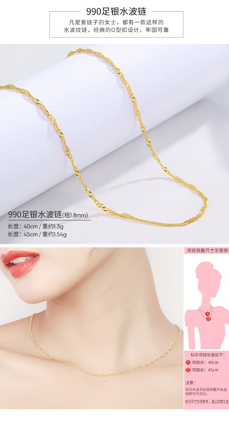 Chow Tai Fook 99 sterling silver necklace for women without pendant gold-plated 18k gold chain colored silver plain chain does not fade 999-cross chain 40cm store manager