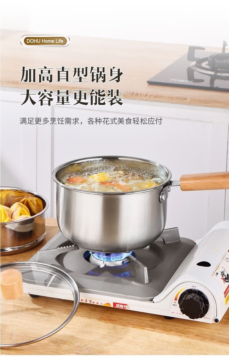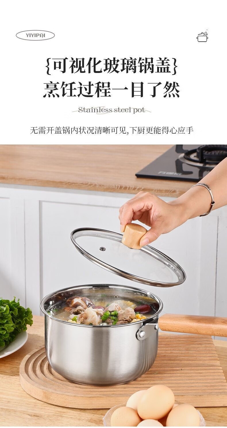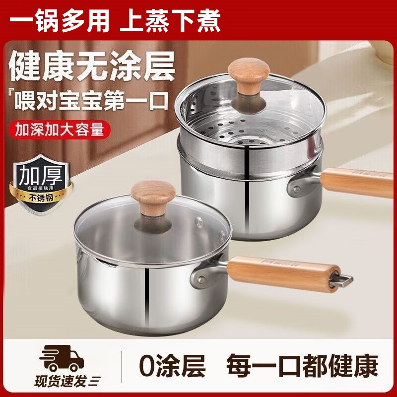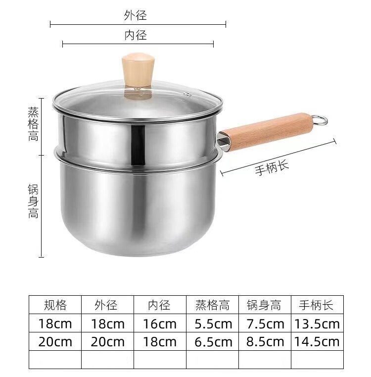 Stainless steel thickened milk pot with wooden handle, uncoated and raised, with lid, steaming, porridge and soup, gas induction cooker, wooden handle milk pot, with lid + steamer 20cm