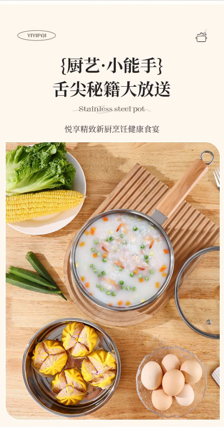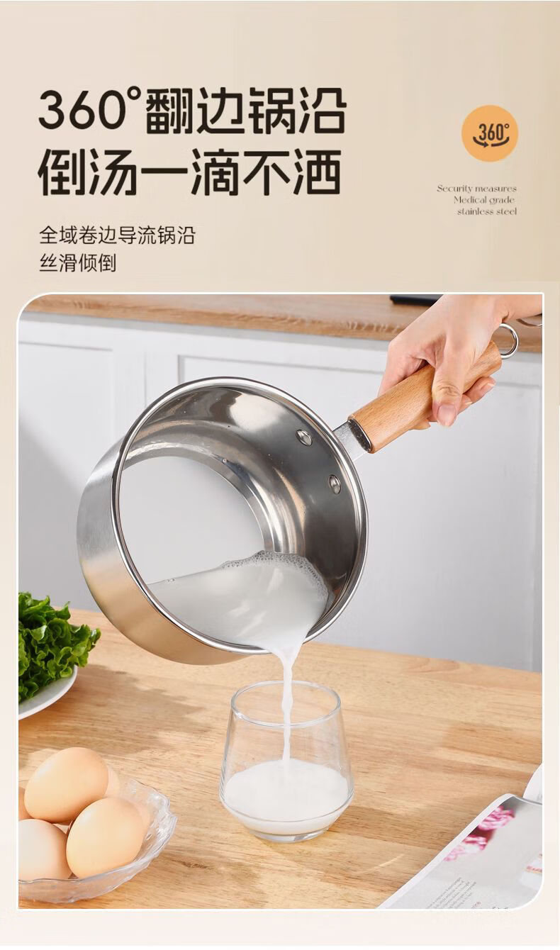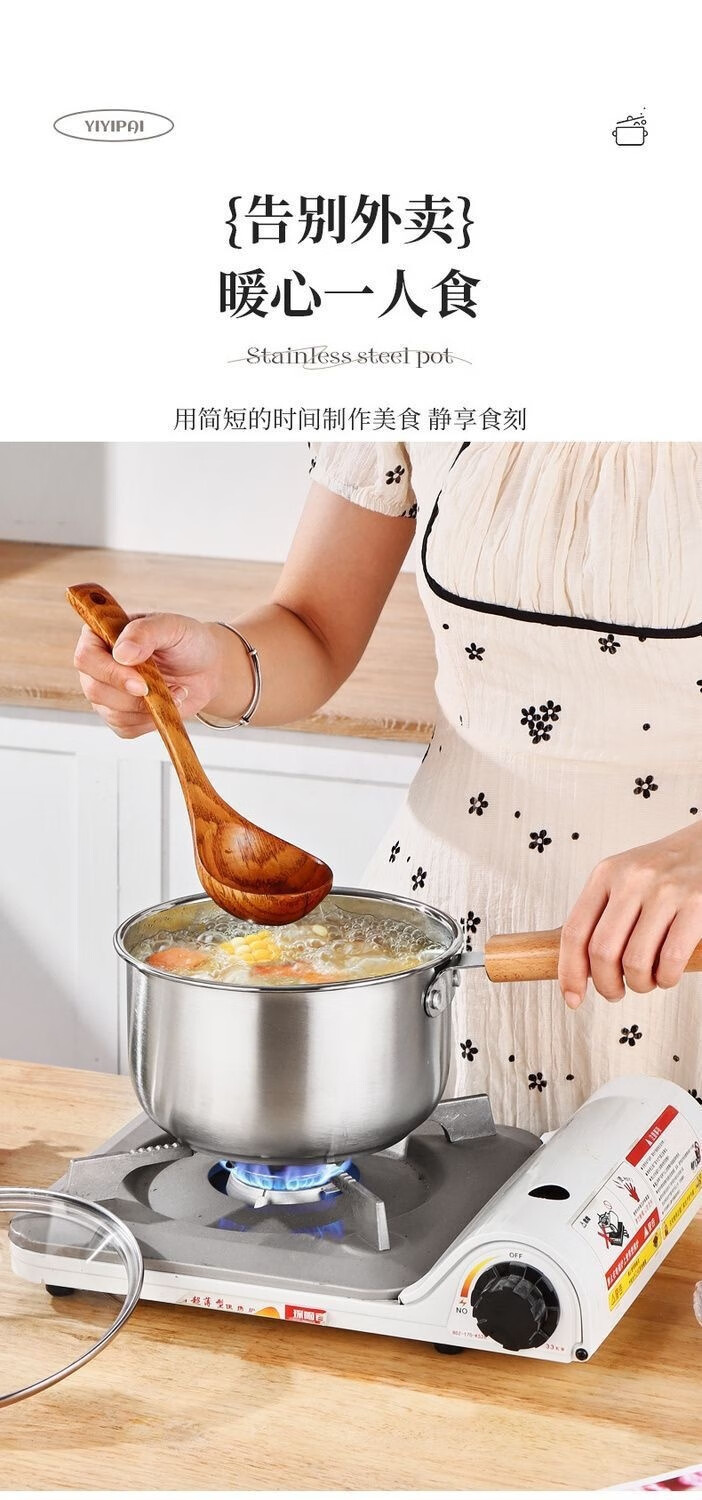 Stainless steel thickened milk pot with wooden handle, uncoated and raised, with lid, steaming, porridge and soup, gas induction cooker, wooden handle milk pot, with lid + steamer 20cm