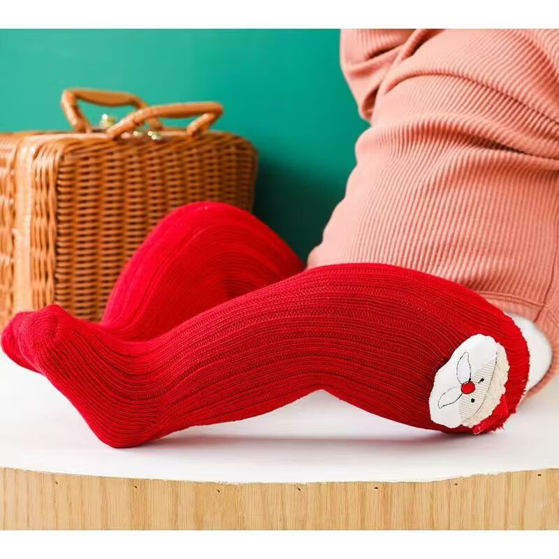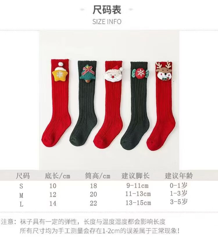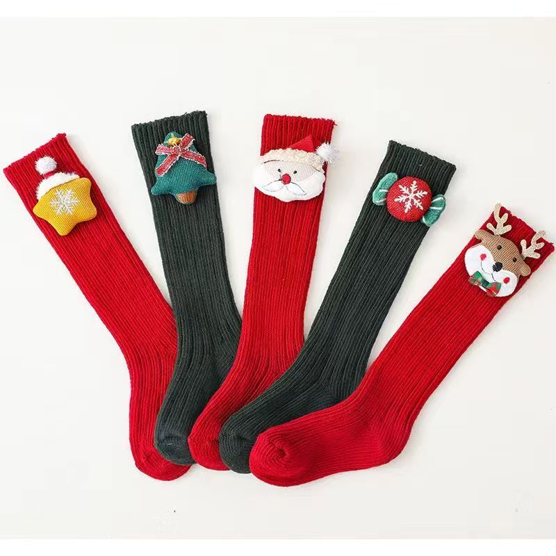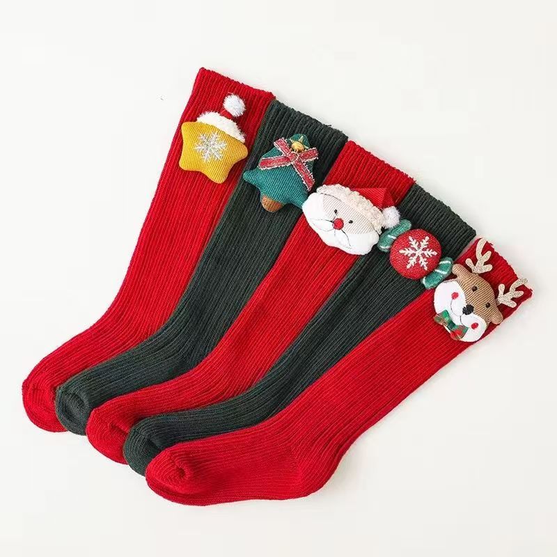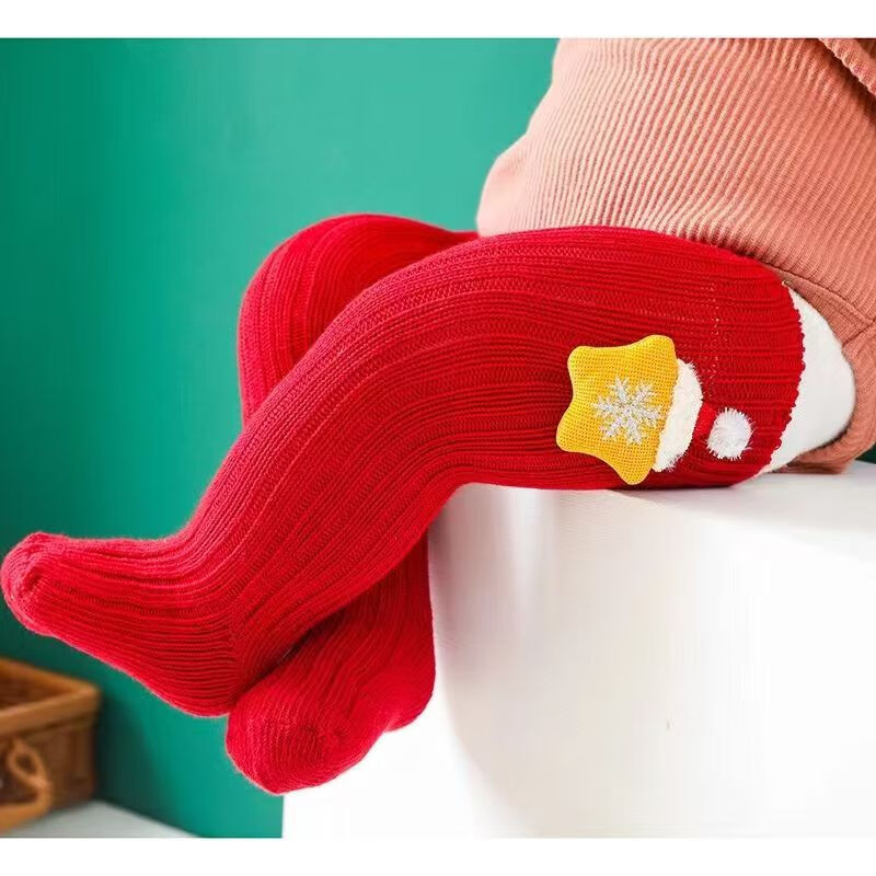 Fashionable New Year's popular cotton cartoon Christmas knee-high socks with red stars, 3 pairs, 0-1 years old (S), foot length 9-11cm