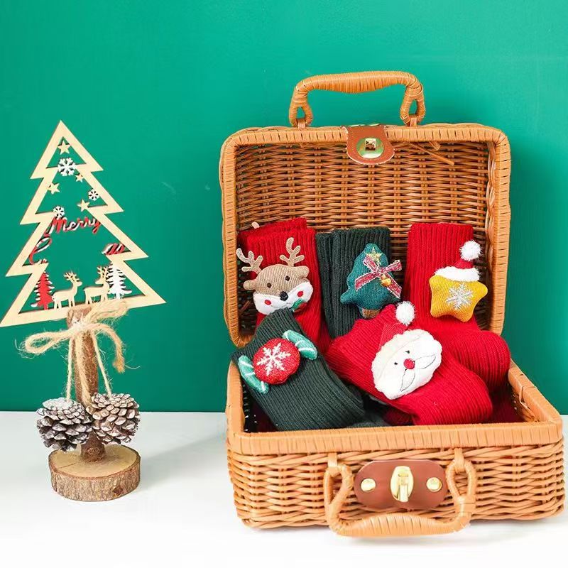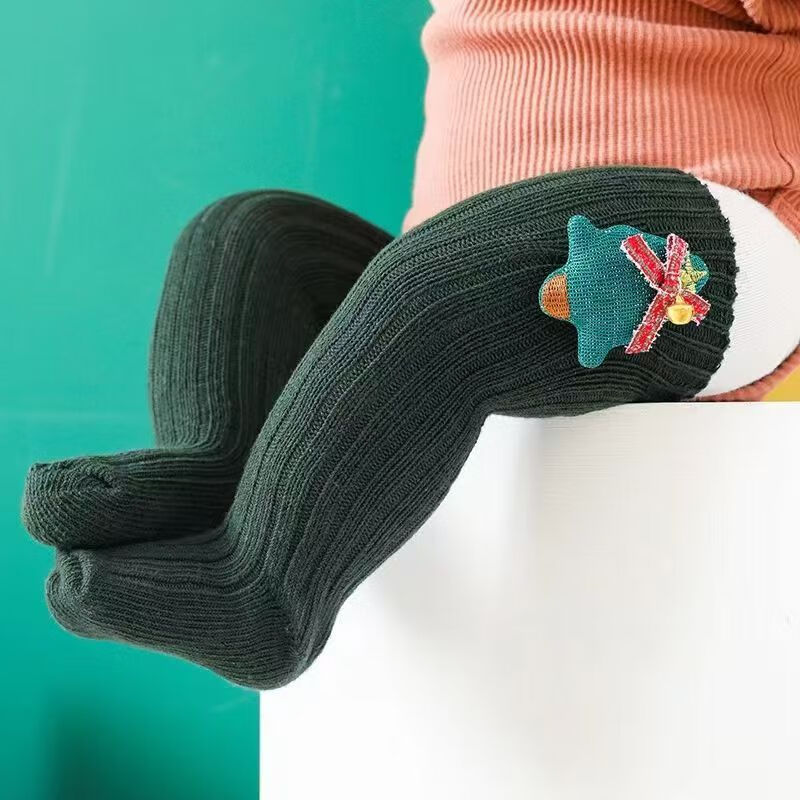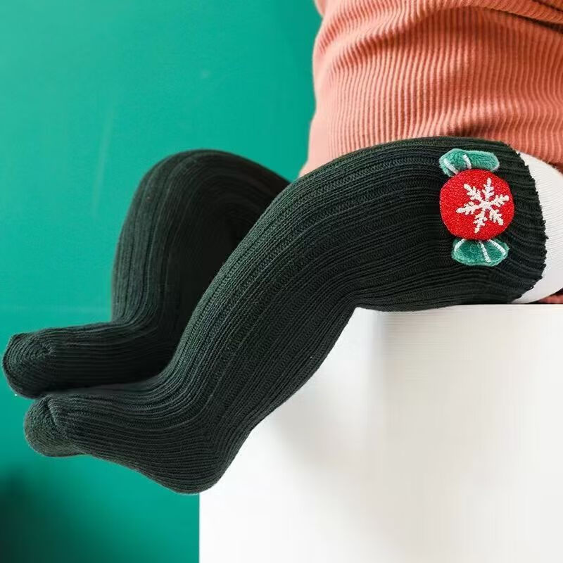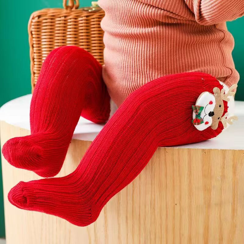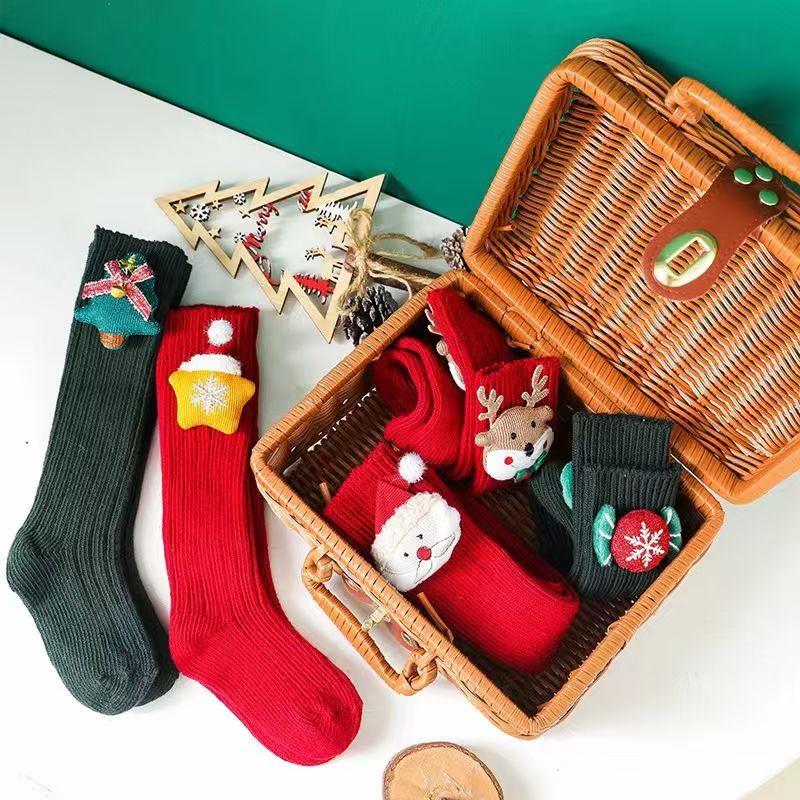 Fashionable New Year's popular cotton cartoon Christmas knee-high socks with red stars, 3 pairs, 0-1 years old (S), foot length 9-11cm