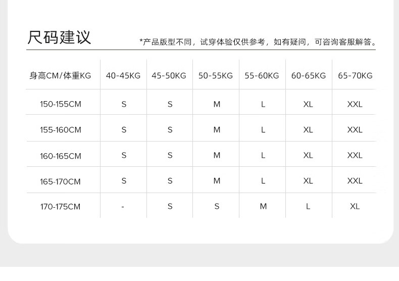 China (cm) 160-165/84-86 165-170 / 88-90 167-172 / 92-96 168-173 / 98-102 170-176 / 106-110